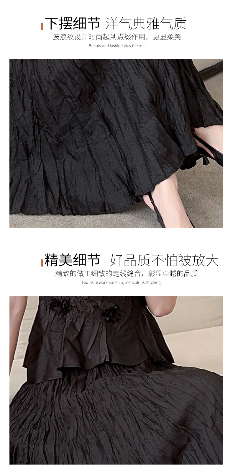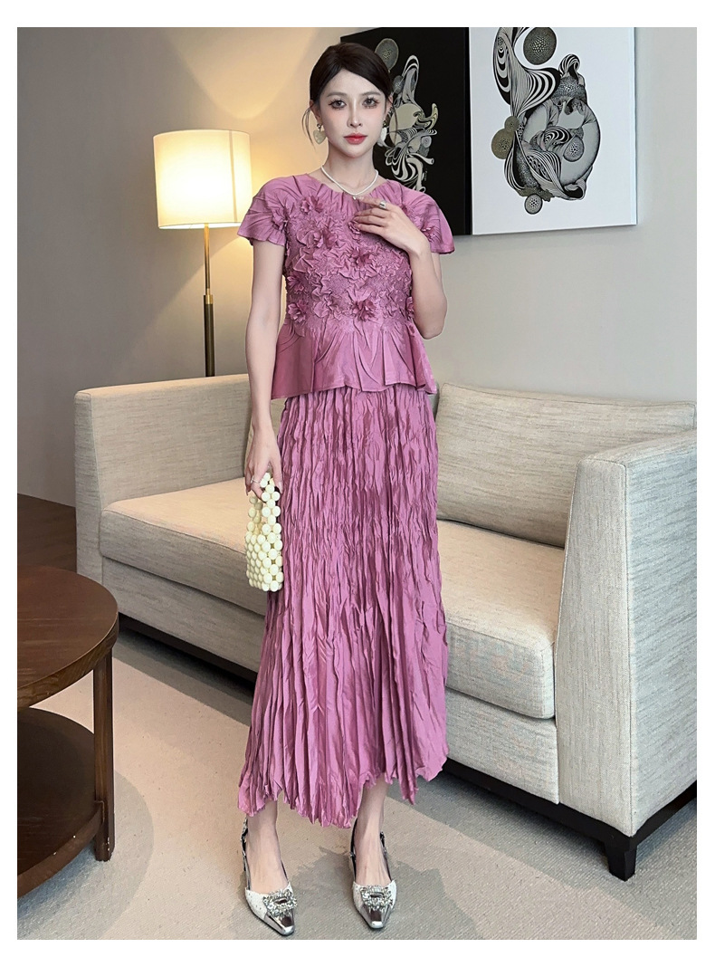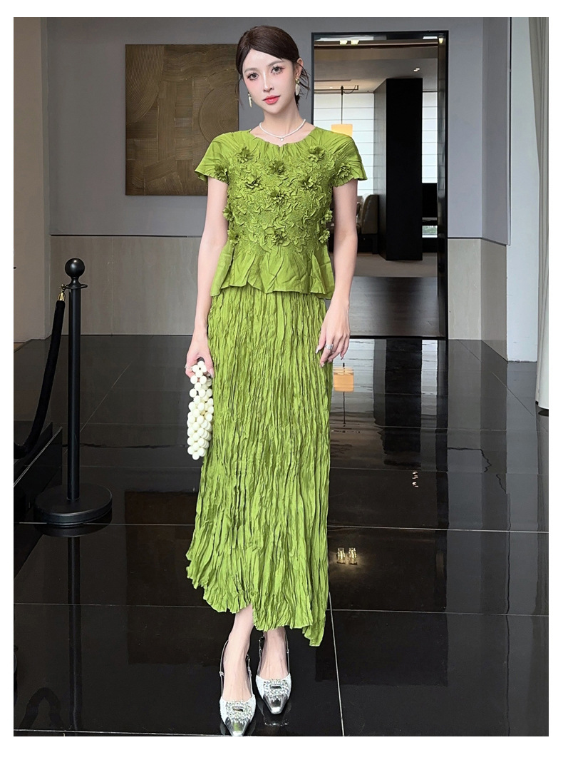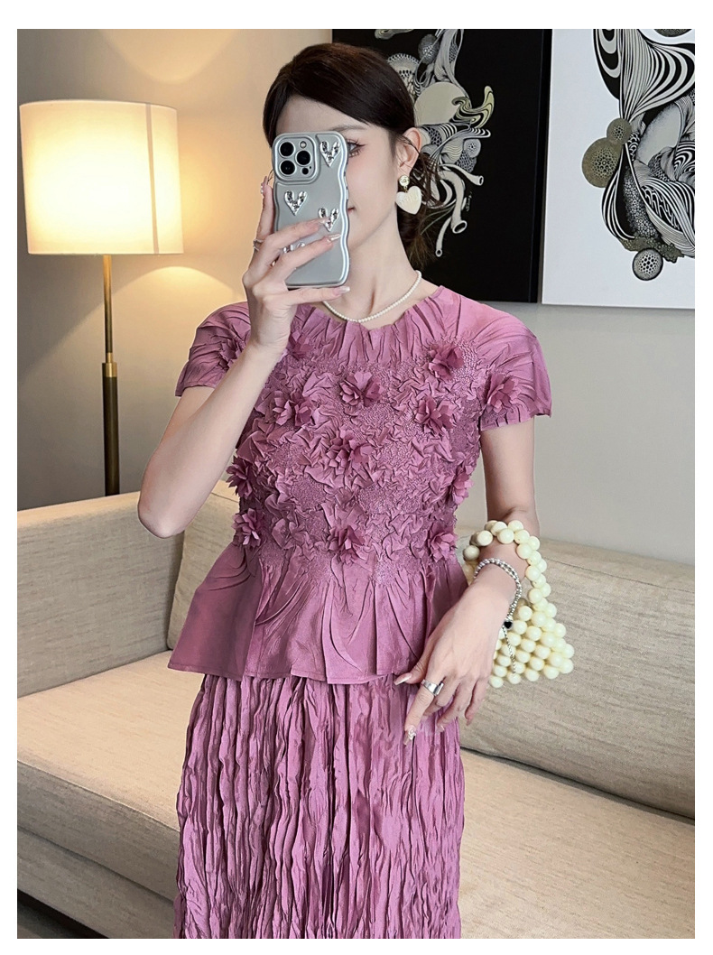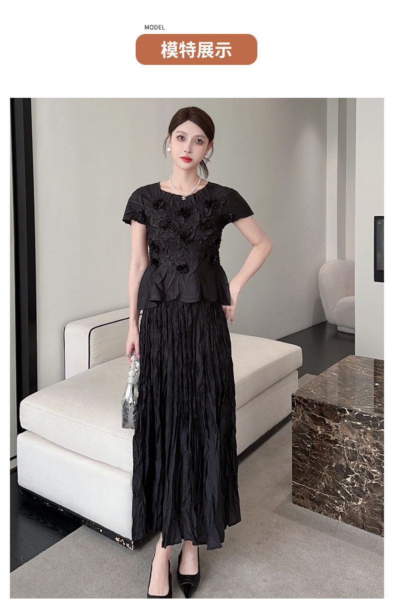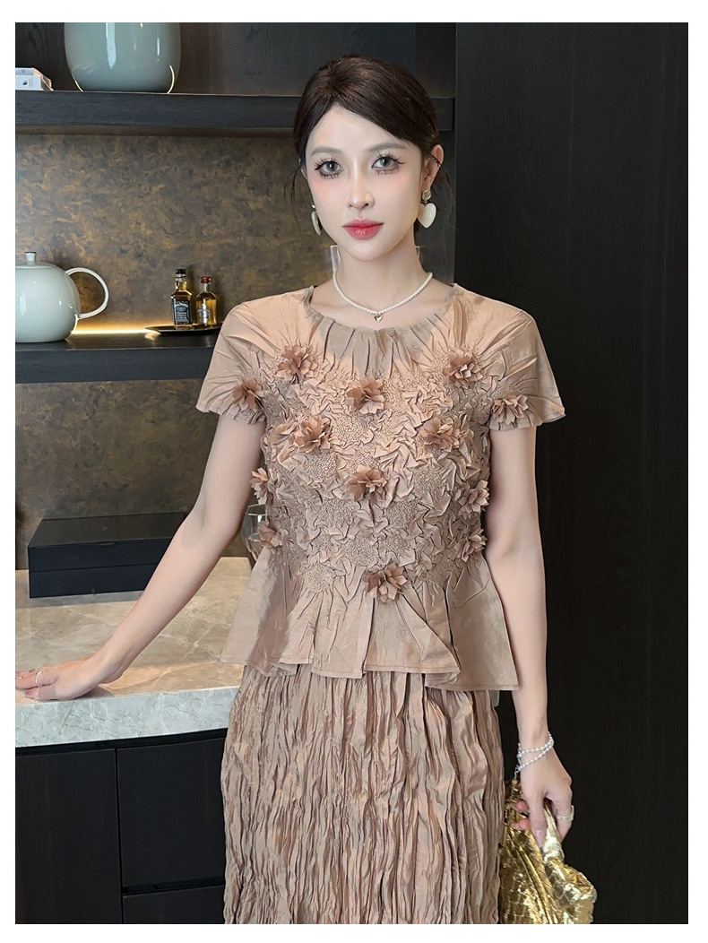 雀说小众设计感褶皱套装女手工褶绣花短袖上衣弹力T恤时尚百搭两件套AL2054