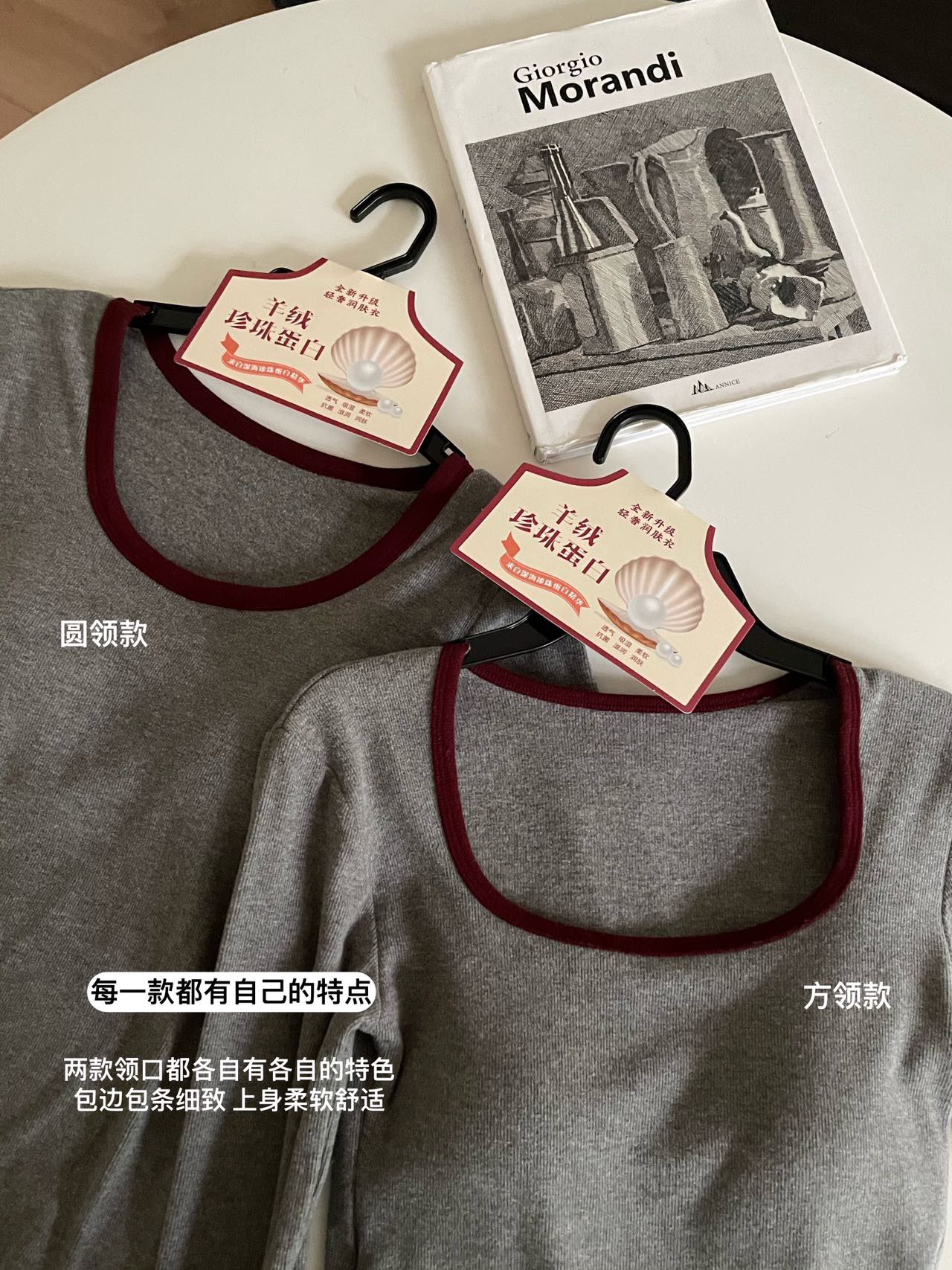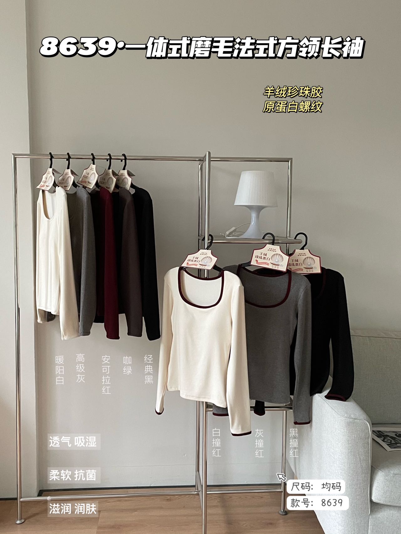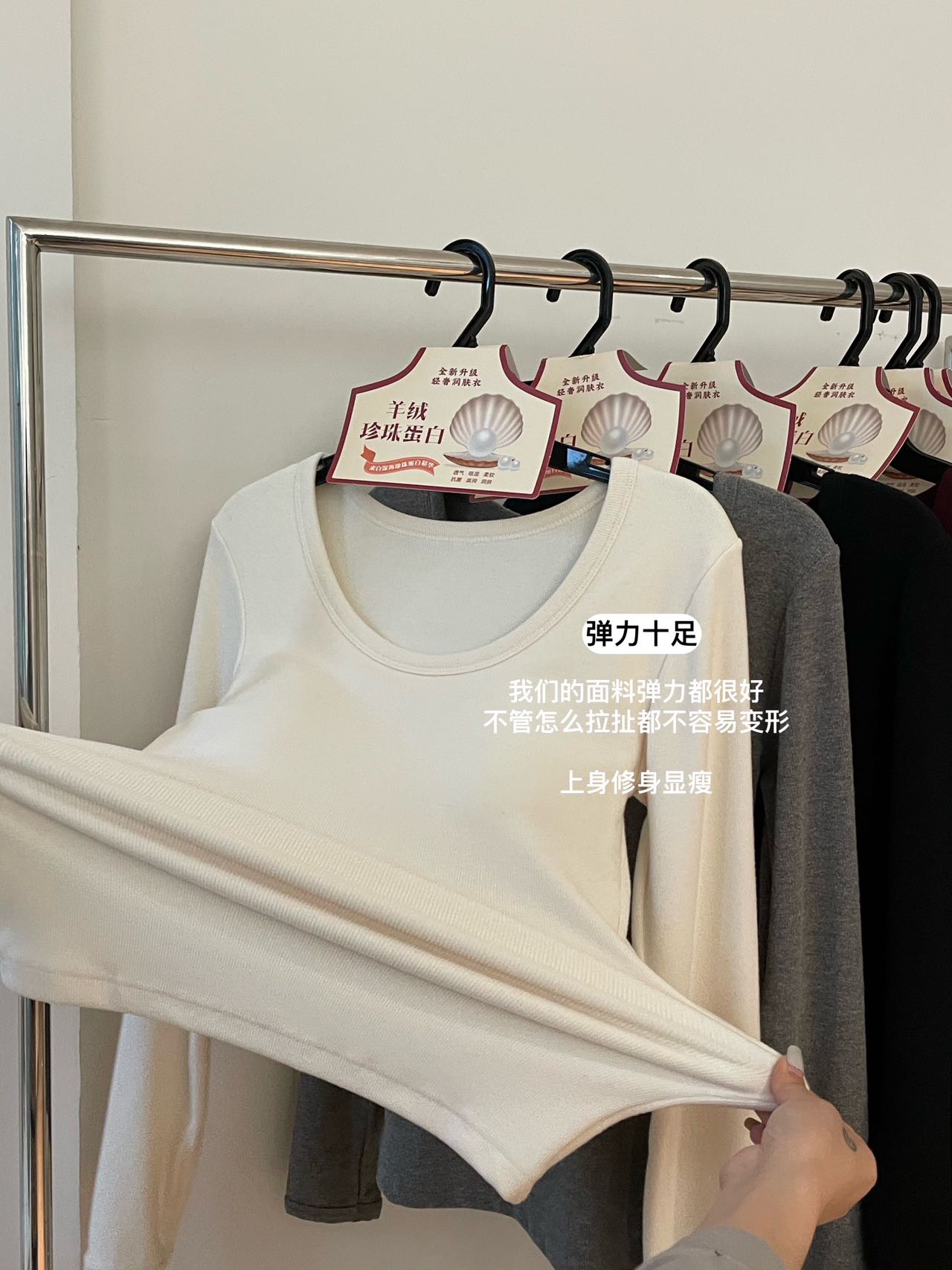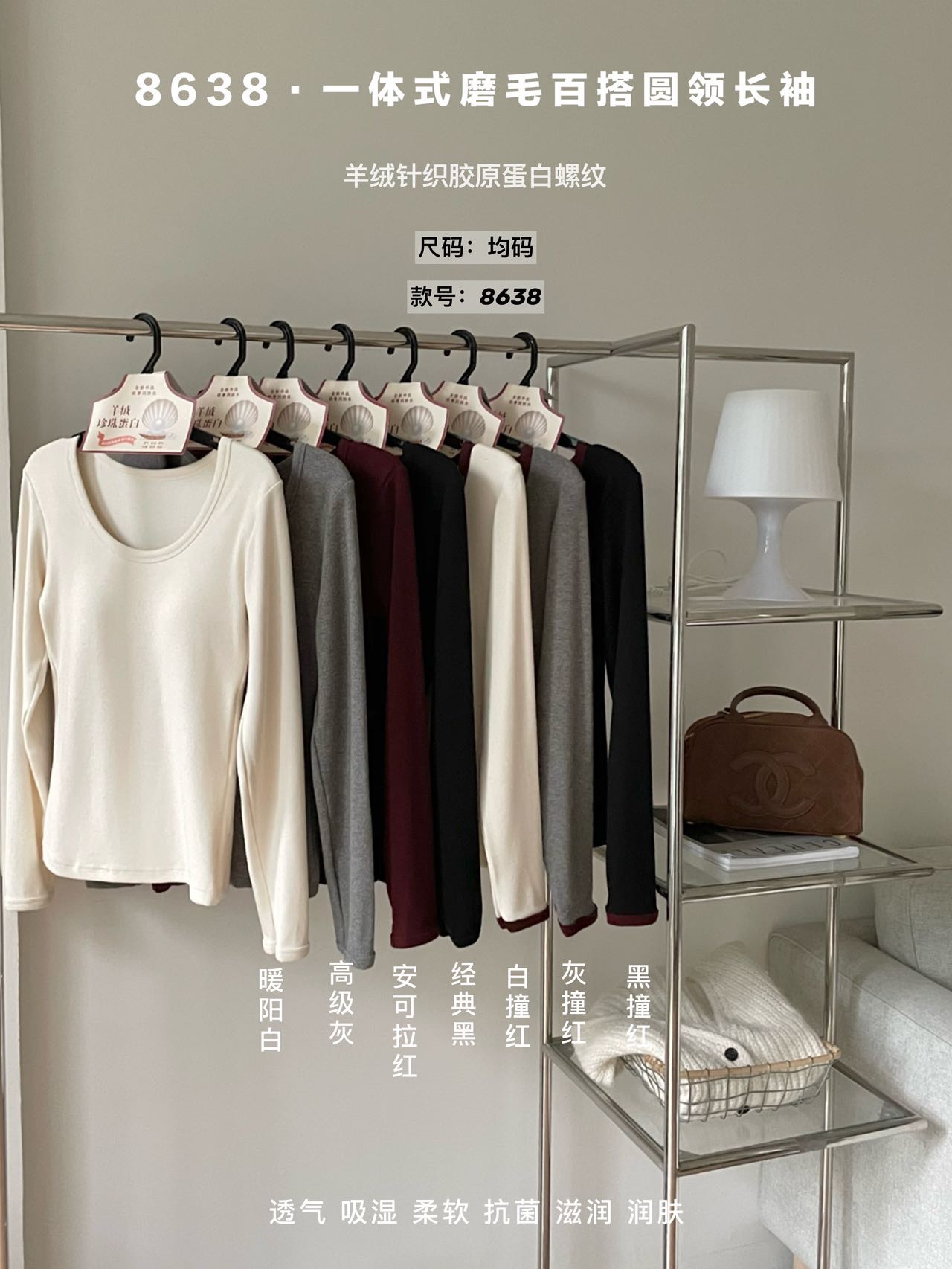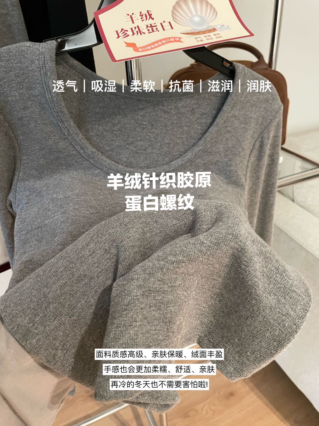 品牌zheng品带挂装衣架‼️!一体式磨毛百搭圆领长袖。羊绒针织胶原蛋白螺纹!透气 吸湿 柔软 抗菌 滋润 润肤 新品打底衫一眼惊艳韩剧女主角都在穿的气质打底 上身超有辨识度✨✨✨ 可日常通勤且简约~ 可慵懒随性又艺术~•[颜色选择]灰撞红 暖阳白 高级灰 经典黑 黑撞红 白撞红 安可拉红 超有女人味的一款打底衫 7个颜色非常衬肤色!!! 只需一眼就令人难以忘记~ 单穿或叠穿都可以成为焦点哦 •穿过最舒服的打底衫没有之一 每年都要卖十几万件的口碑单品 今年原料无限涨价我依然不涨价。简直好穿到词穷‼️‼️‼️ 免烫kang静电不易变形、不易黏毛。经过多次洗涤仍能保持如新🆕/摸上去很柔软像云朵,贴身轻柔细腻.糯糯的软软的,弹性巨大,毫无束缚感。轻轻包裹在身上,单穿贴身穿丝毫无压力。姐妹们轻松穿出优雅气质调调😎 尺码:均码 135斤以内⚠️ 颜色:灰撞红 暖阳白 高级灰 经典黑 黑撞红 白撞红 安可拉