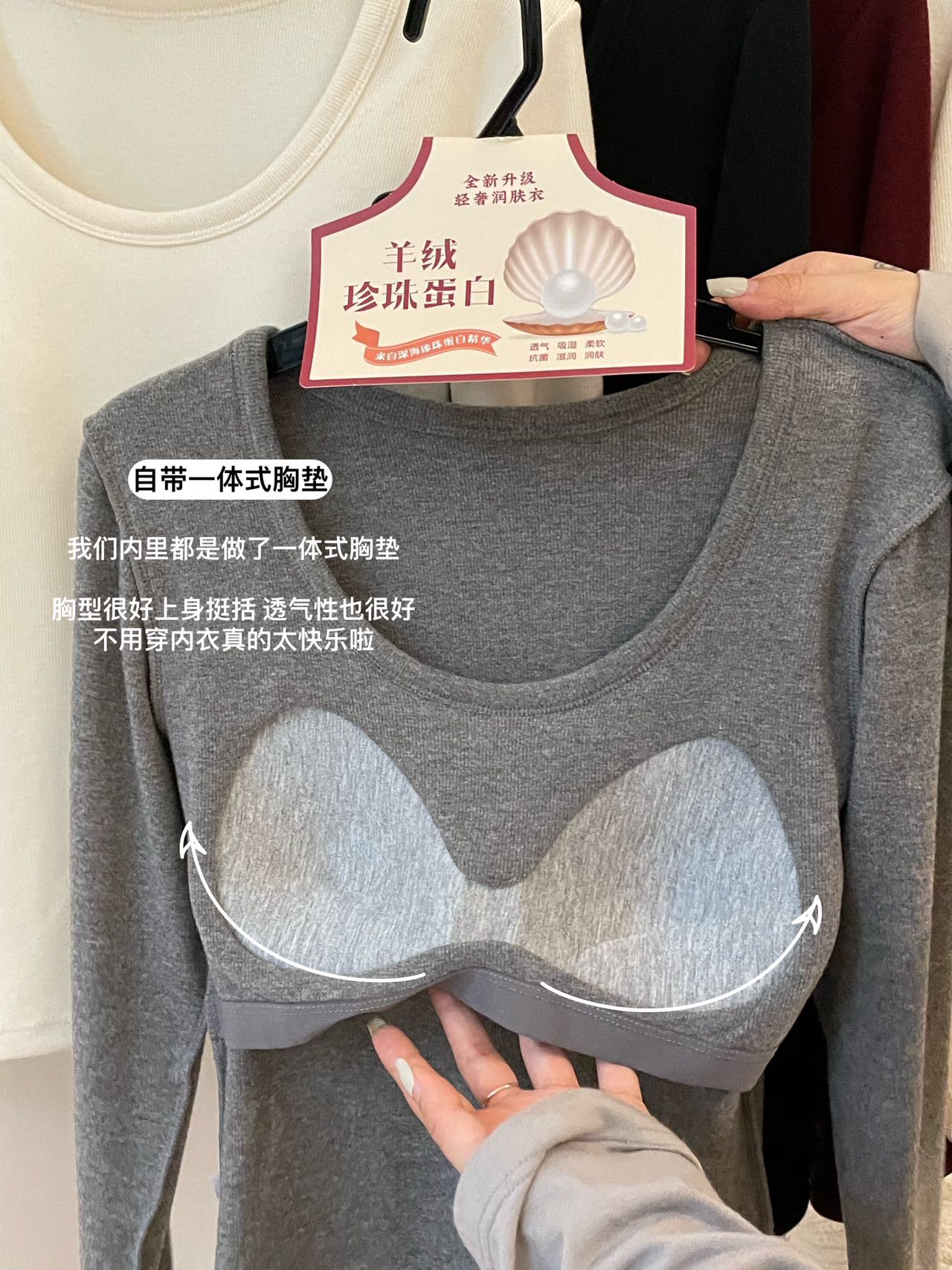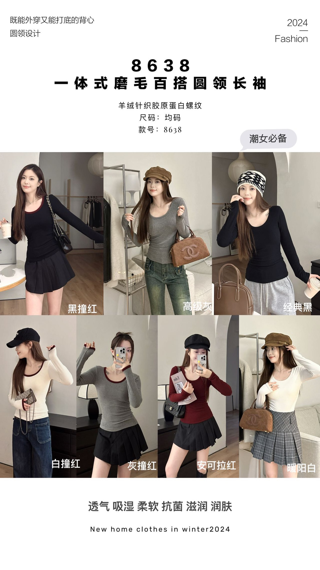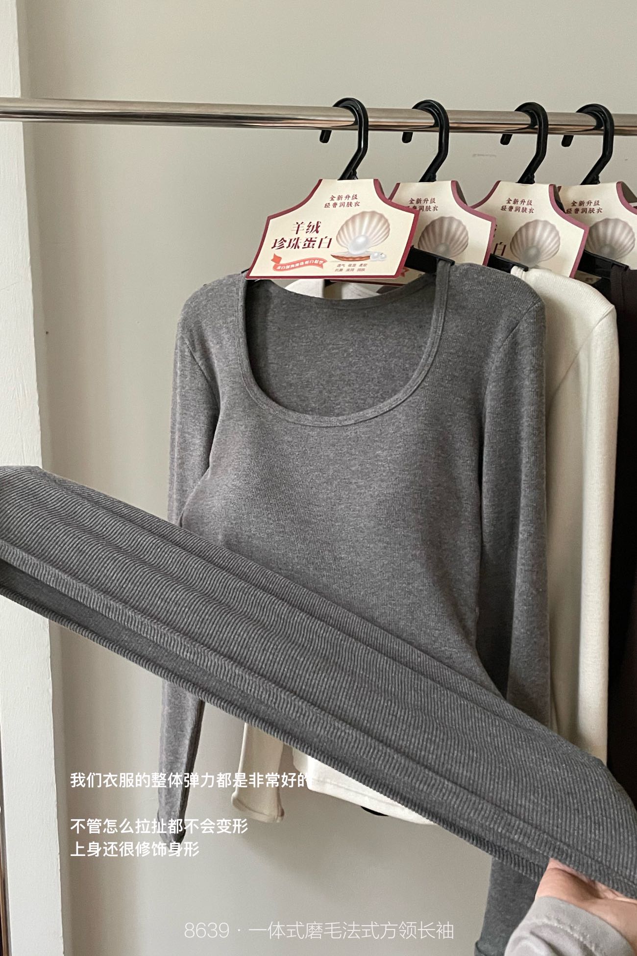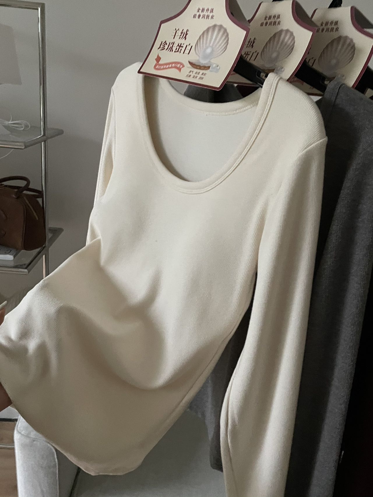 品牌zheng品带挂装衣架‼️!一体式磨毛百搭圆领长袖。羊绒针织胶原蛋白螺纹!透气 吸湿 柔软 抗菌 滋润 润肤 新品打底衫一眼惊艳韩剧女主角都在穿的气质打底 上身超有辨识度✨✨✨ 可日常通勤且简约~ 可慵懒随性又艺术~•[颜色选择]灰撞红 暖阳白 高级灰 经典黑 黑撞红 白撞红 安可拉红 超有女人味的一款打底衫 7个颜色非常衬肤色!!! 只需一眼就令人难以忘记~ 单穿或叠穿都可以成为焦点哦 •穿过最舒服的打底衫没有之一 每年都要卖十几万件的口碑单品 今年原料无限涨价我依然不涨价。简直好穿到词穷‼️‼️‼️ 免烫kang静电不易变形、不易黏毛。经过多次洗涤仍能保持如新🆕/摸上去很柔软像云朵,贴身轻柔细腻.糯糯的软软的,弹性巨大,毫无束缚感。轻轻包裹在身上,单穿贴身穿丝毫无压力。姐妹们轻松穿出优雅气质调调😎 尺码:均码 135斤以内⚠️ 颜色:灰撞红 暖阳白 高级灰 经典黑 黑撞红 白撞红 安可拉