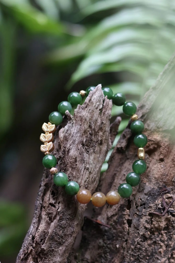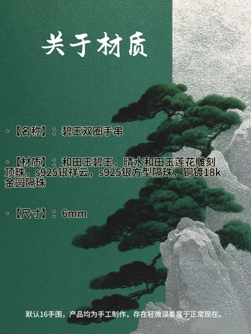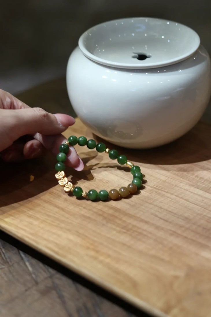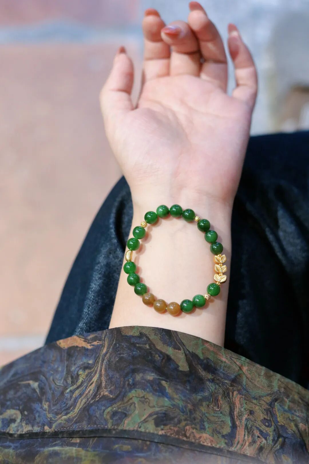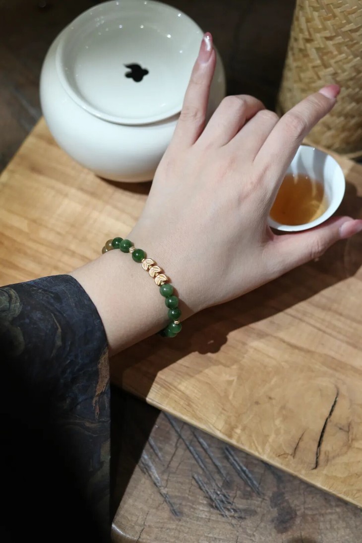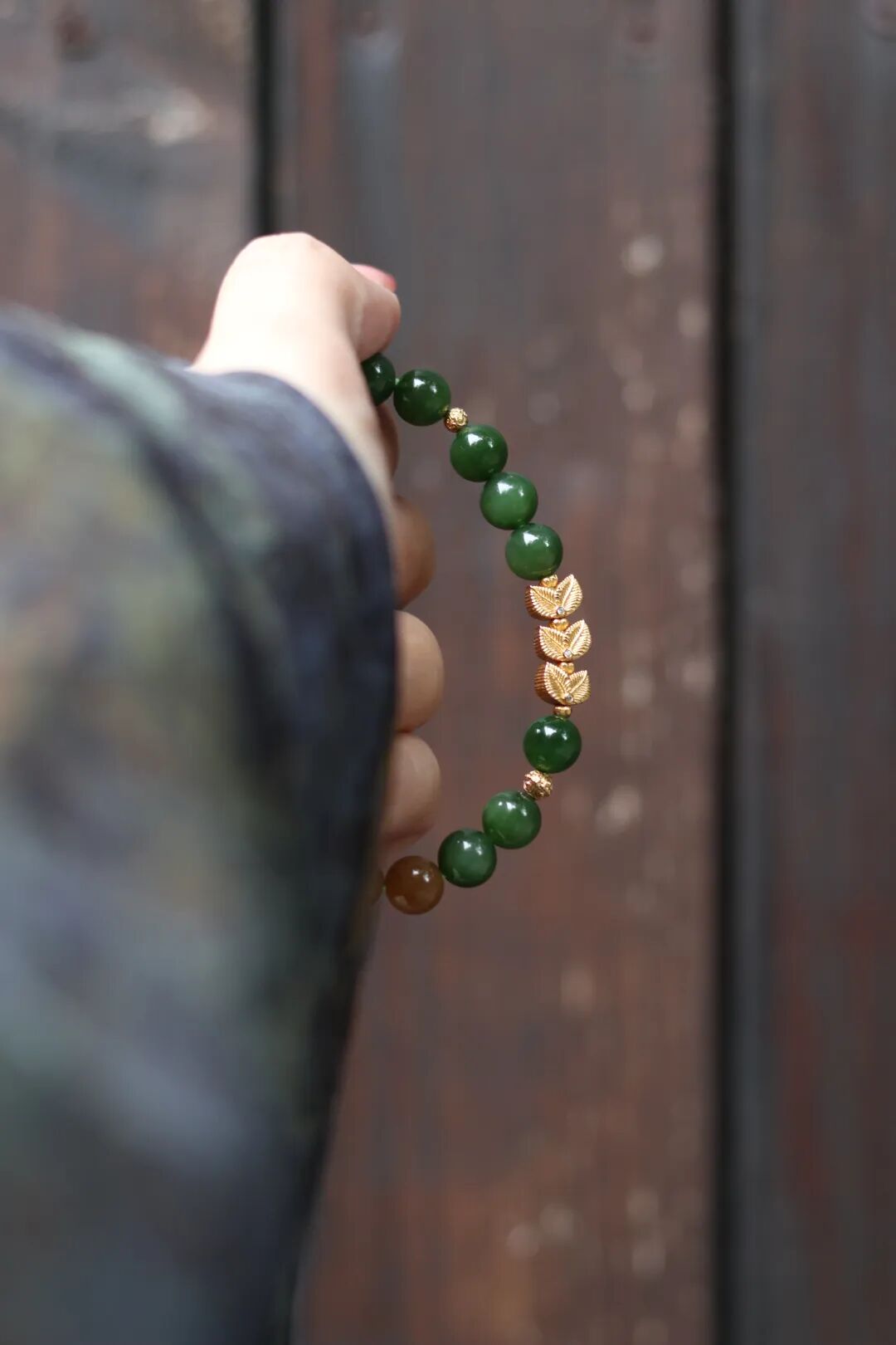 材质:和田玉碧玉+925银方形隔珠+铜镀18k文殊叶子+铜镀18k配件