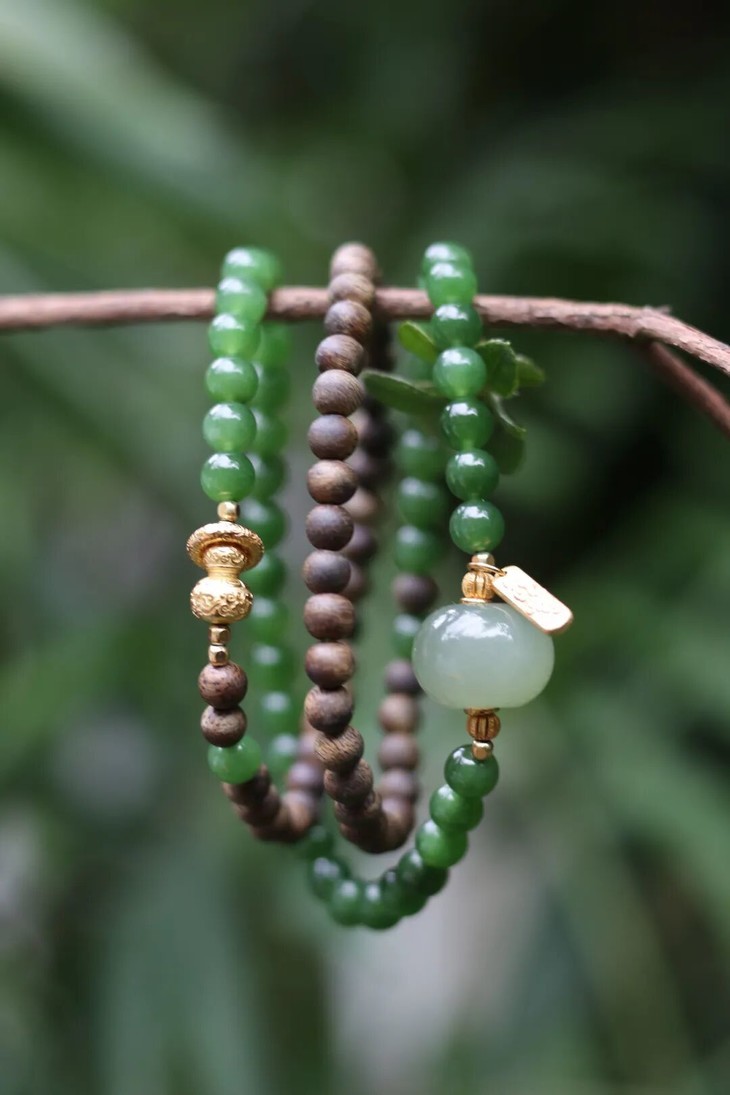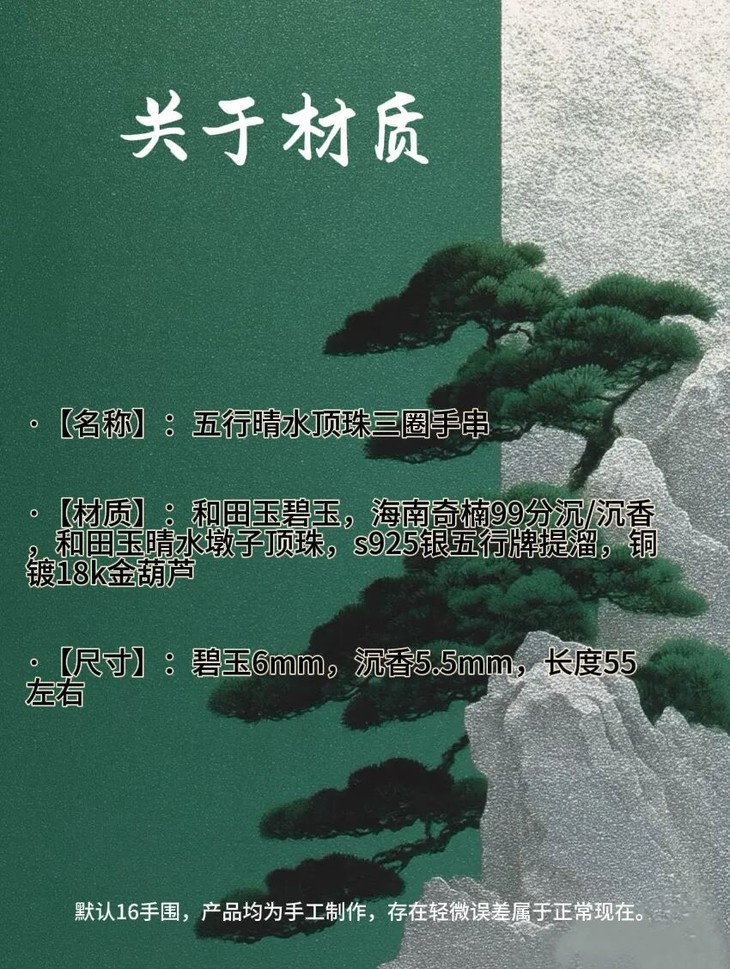 材质:和田玉碧玉+晴水和田玉桶珠+925银五行平安牌+海南奇楠沉香+铜镀18k葫芦+925银隔珠