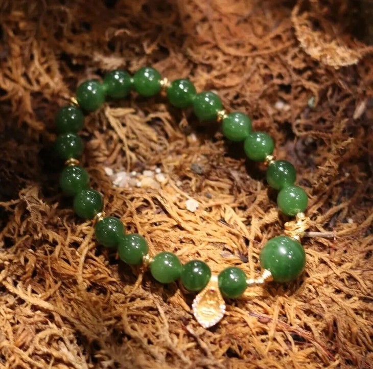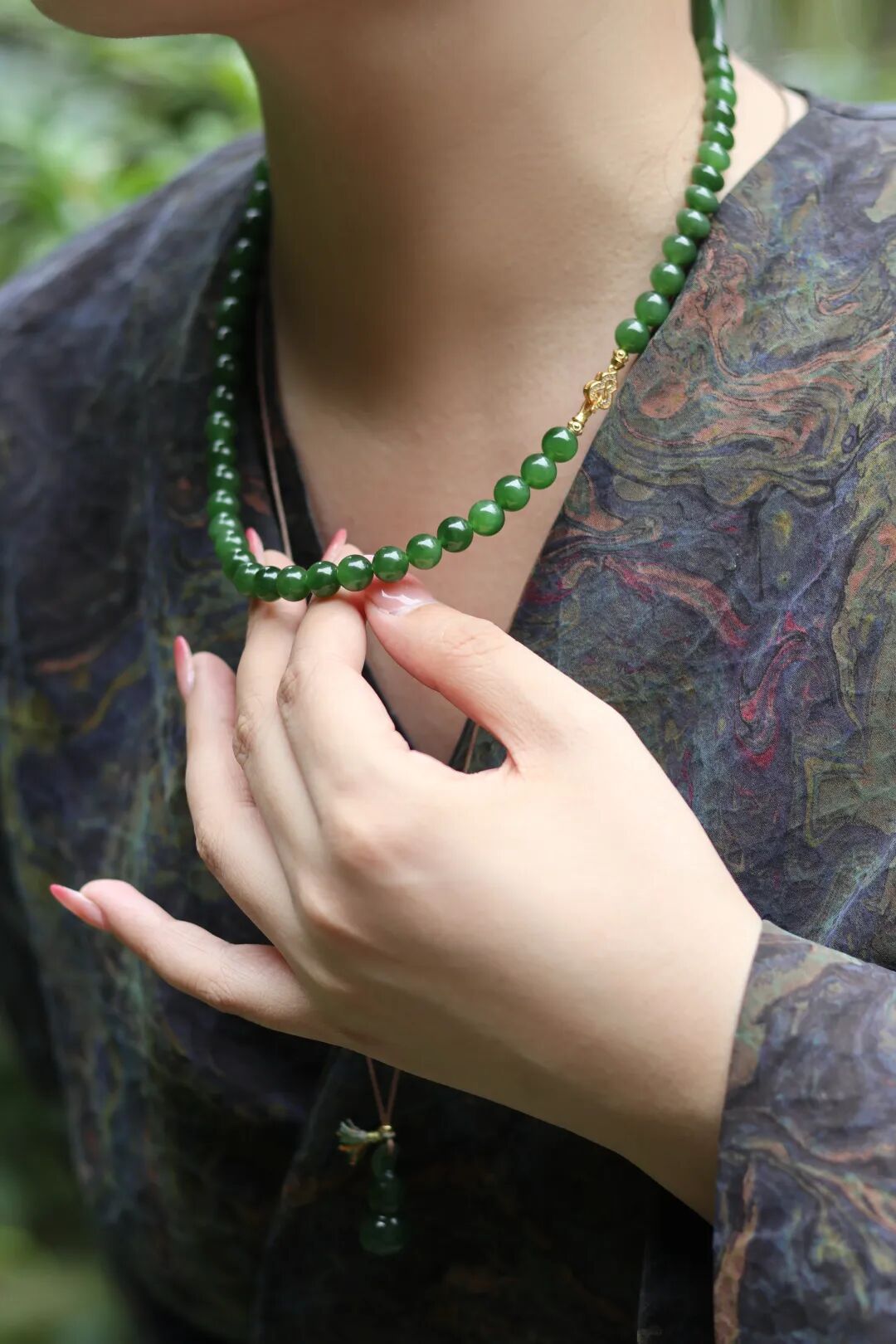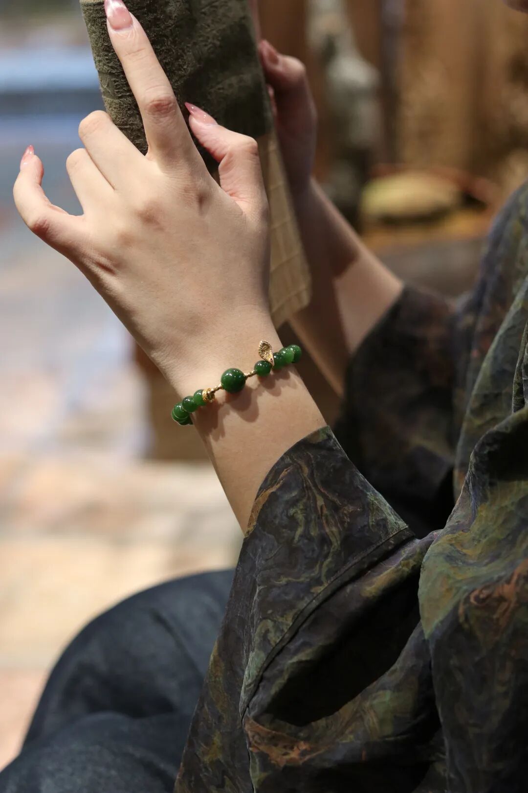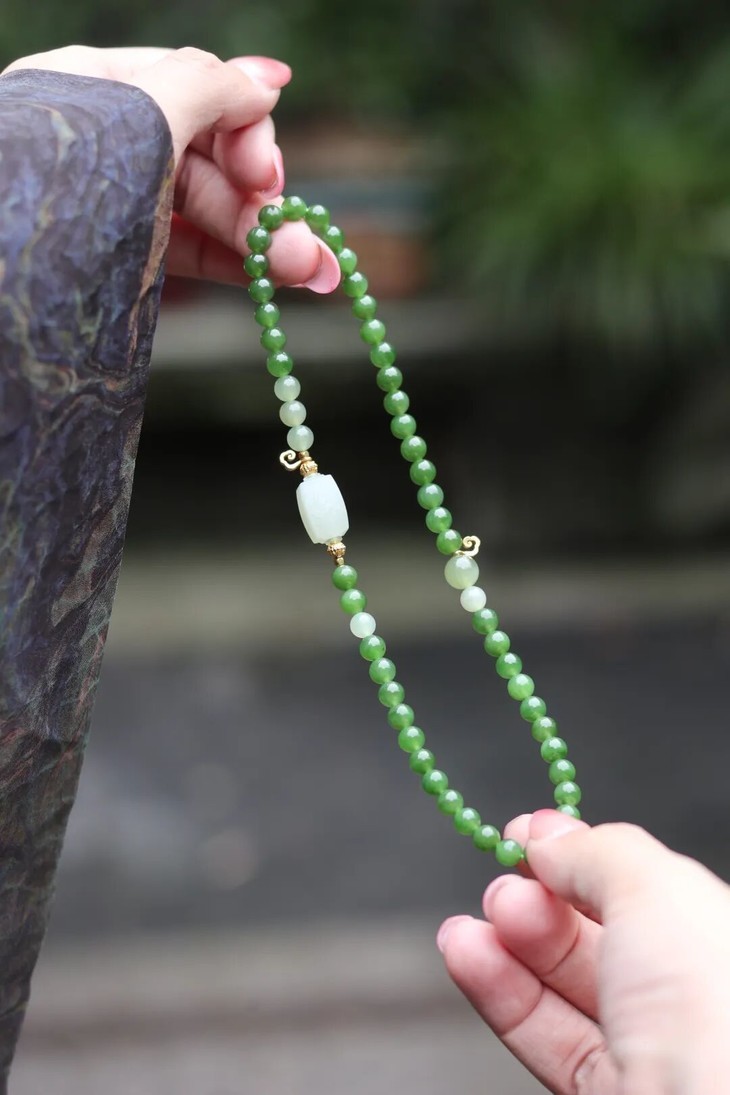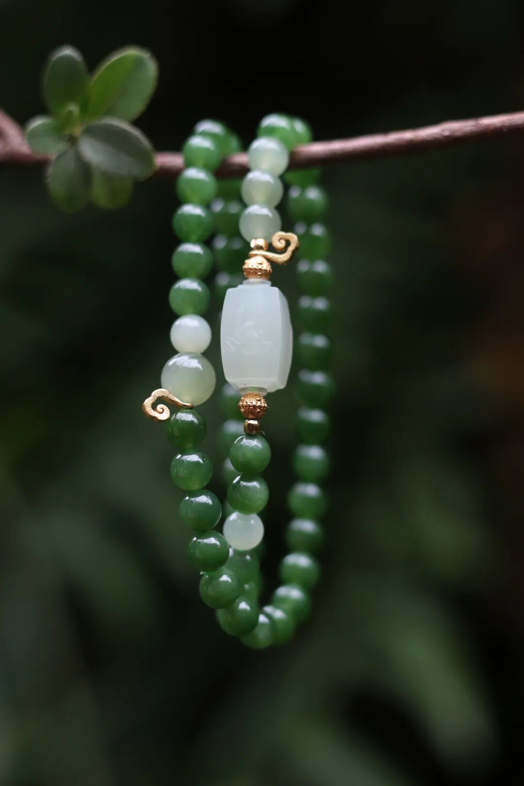 材质:和田玉碧玉+铜镀18k扎基拉姆+铜镀18k隔珠