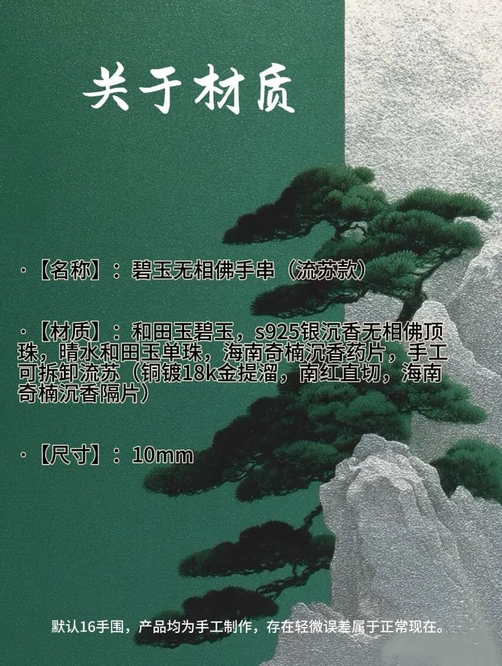 材质:和田玉碧玉+925银无相佛+海南奇楠沉香+晴水和田玉单珠+南红隔珠+铜镀18k扎基拉姆提溜