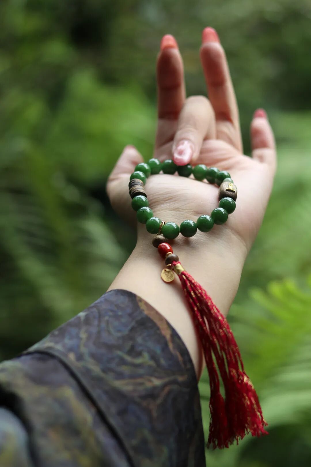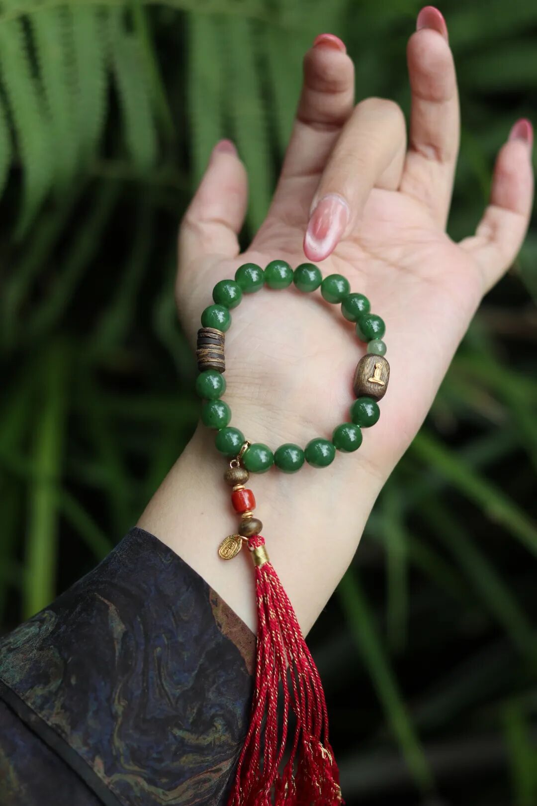 材质:和田玉碧玉+火焰纹南红+可拆卸手工流苏+铜镀18k隔珠