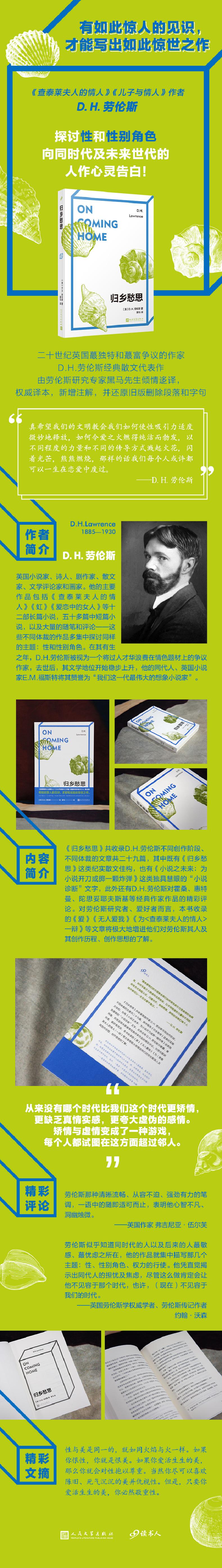 《归乡愁思》共收录英国作家D.H.劳伦斯不同创作阶段、不同体裁的文章共二十九篇,其中既有《归乡愁思》这类纪实散文佳构,也有《小说之未来:为小说开刀或掷一颗炸弹》这类独具慧眼的“小说诊断”文字,此外还有D.H.劳伦斯对霍桑、惠特曼、陀思妥耶夫斯基等作家作品的精彩评论。对劳伦斯研究者、爱好者而言,本书收录的《爱》《无人爱我》《为<查泰莱夫人的情人>一辩》等文章将**地增进他们对劳伦斯其人及其创作历程、创作思想的了解。
