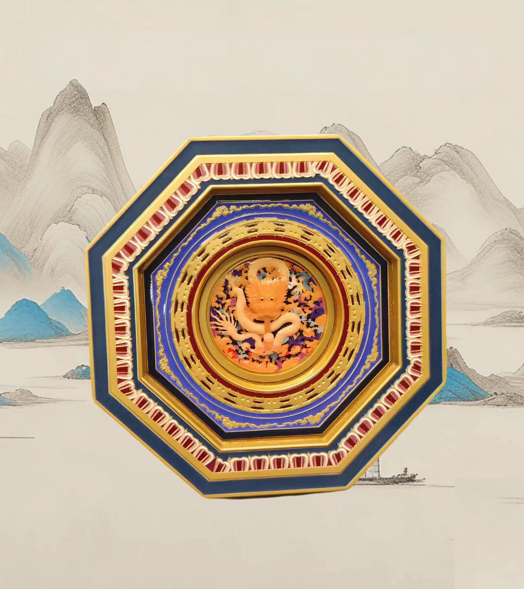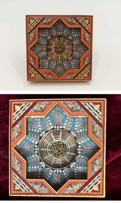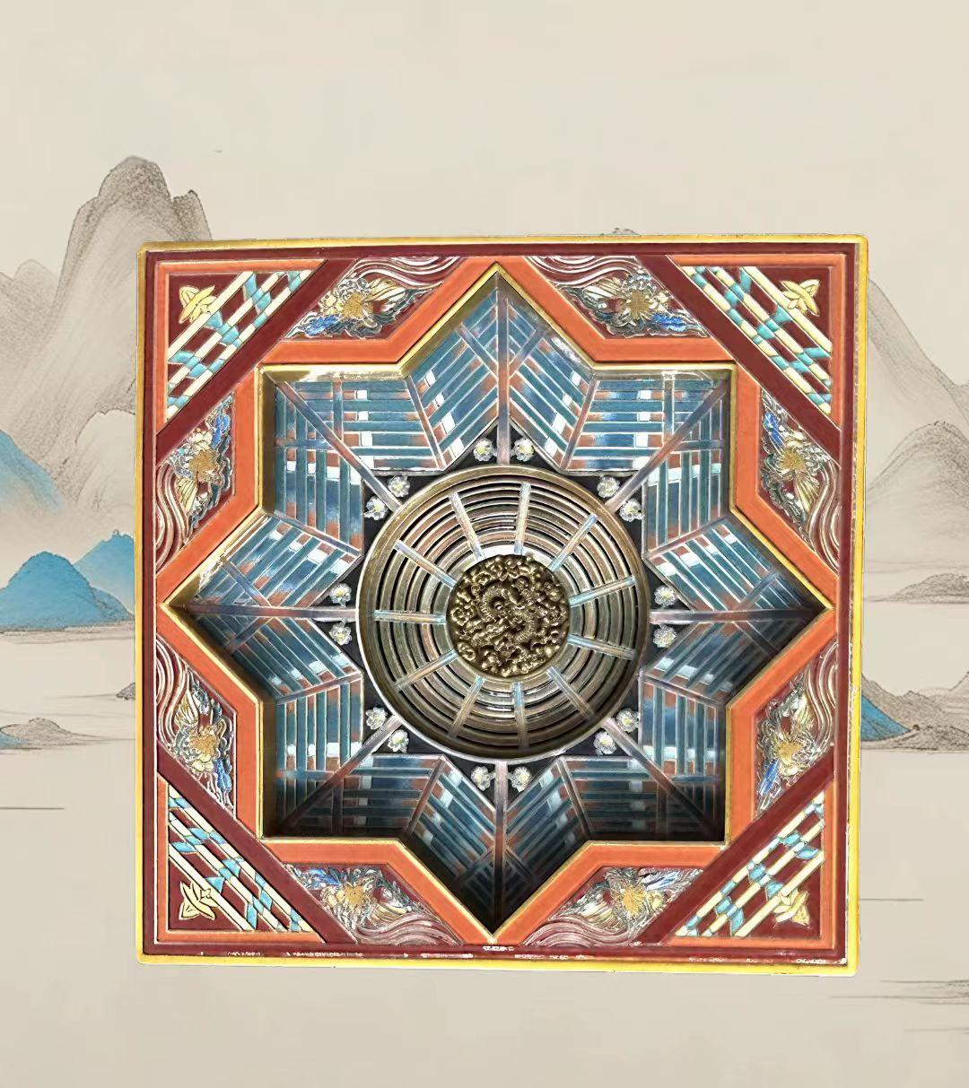 本藻井灵感来自于中国十大名楼之南京阅江楼中的蟠龙藻井,以多层穹顶结构为特色,用龙纹彰显皇家威严,尽显大明王朝的威仪。