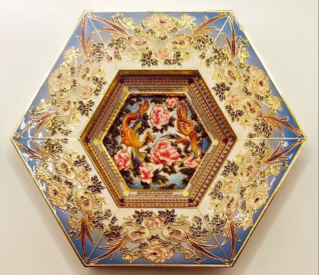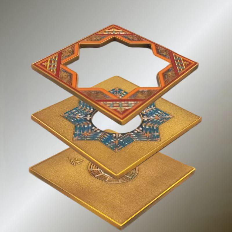 本藻井灵感来自于西安大学习巷清真寺藻井,是中国传统宫殿式与伊斯兰风格的融合,藻井纹样(如宝相花、如意云纹)承袭唐代宫廷装饰风格,将阿拉伯的几何美学与中国木雕、彩绘工艺结合,是丝绸之路上多元文化融合的见证。