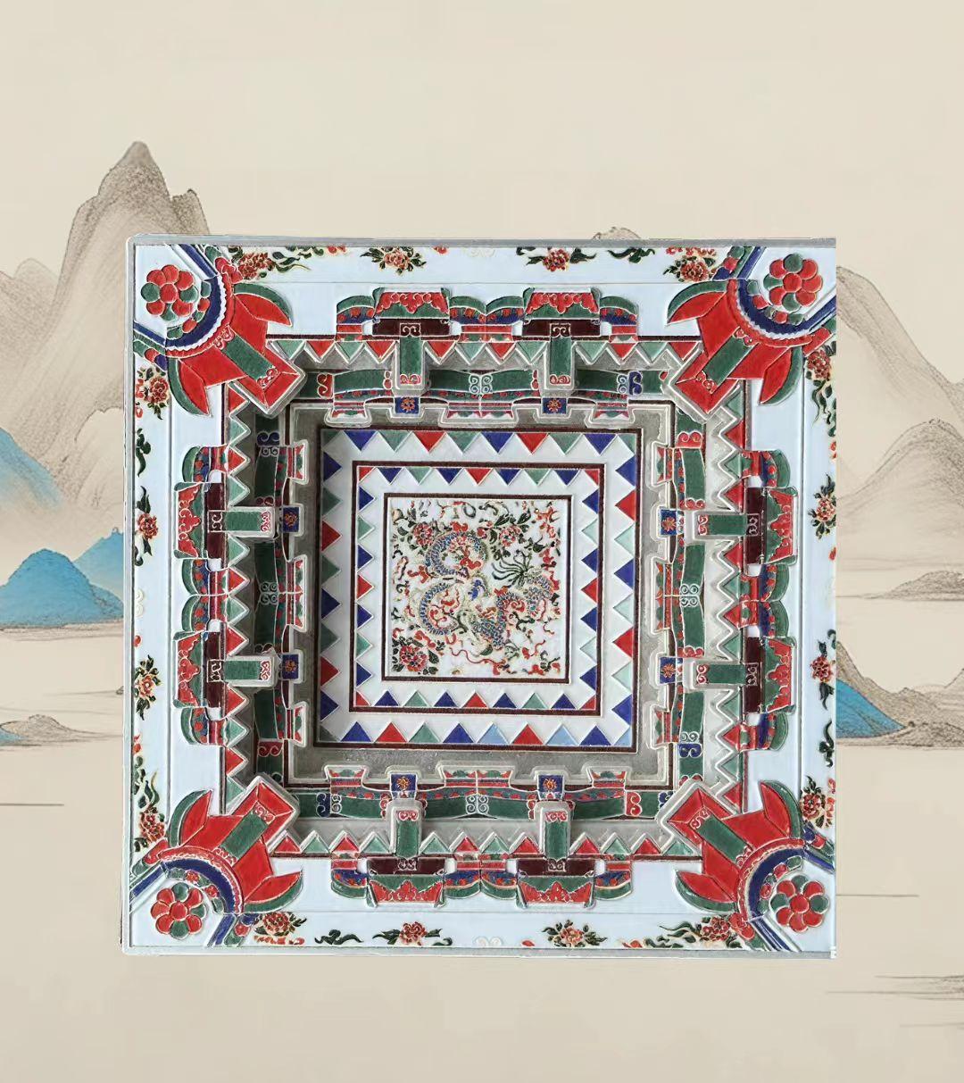 本藻井灵感来自山西晋水源头——晋祠“难老泉”亭子的八角藻井,建于明朝嘉靖年间,融合明朝建筑艺术的精华。藻井以榫卯结构层层向上收拢,不仅具有力学稳定性,还象征“天圆地方”的宇宙观。藻井绘有莲花、牡丹等纹样,周边装饰卷草、缠枝纹,体现生生不息的美好寓意。