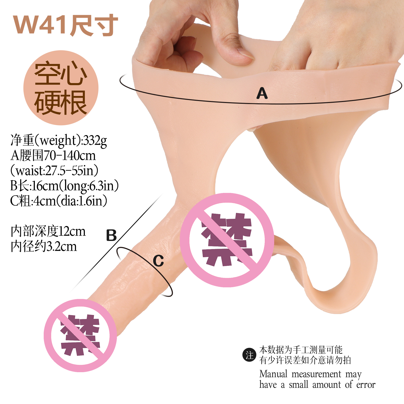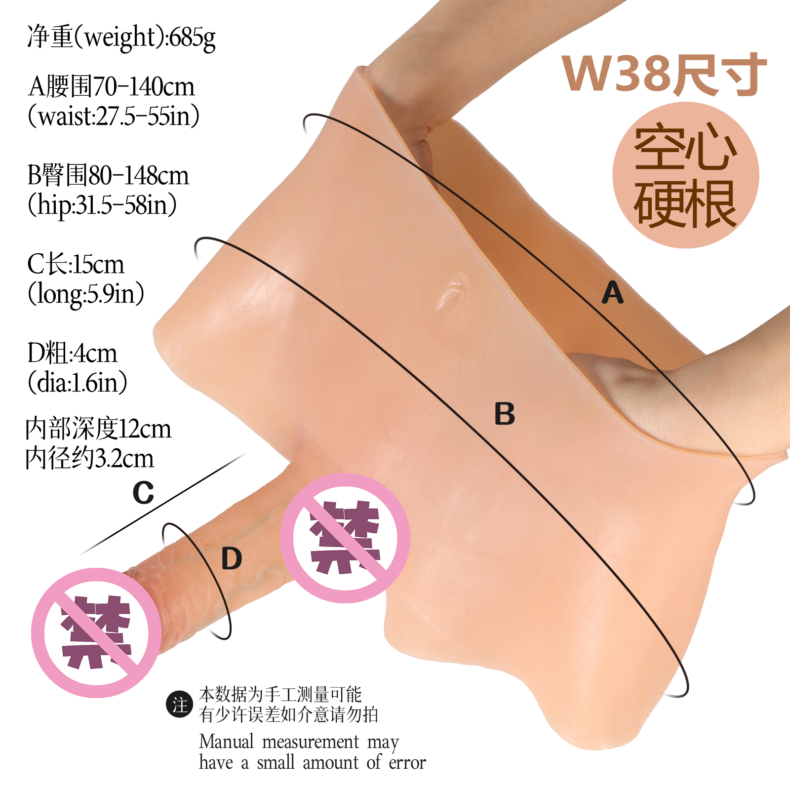 盒装重:381g,盒规格:11*8.5*18cm,阳具尺寸:16*4cm,可插入13cm,内部深度12cm,内径约3.2cm,净重:332g,材质:硅胶 腰围70-140cm,臀围80-148cm 特点:带腹肌,带皮纹,上色,空心硬款
