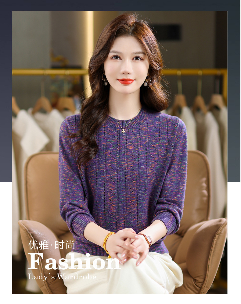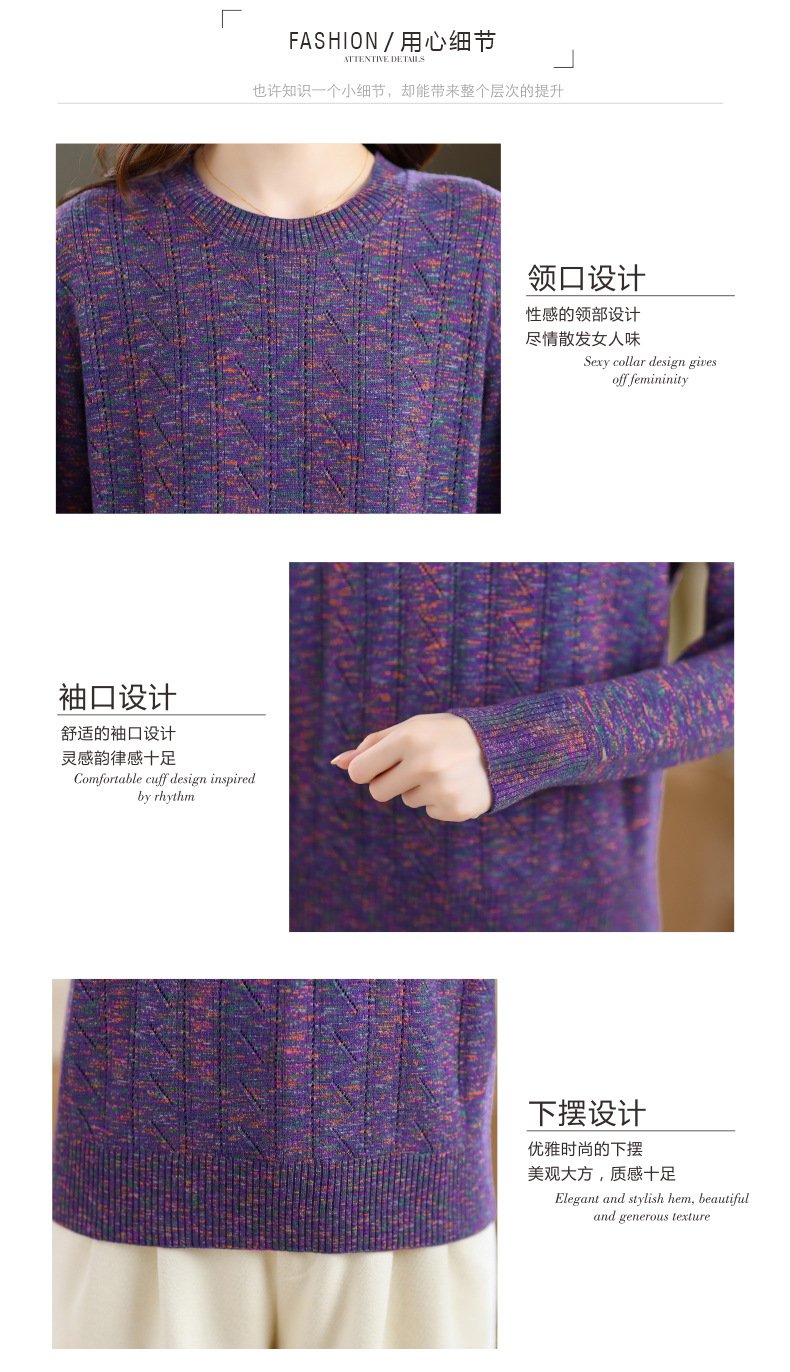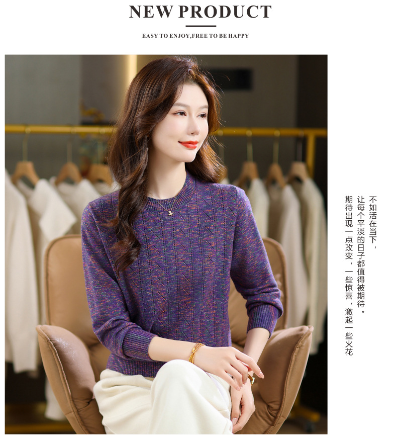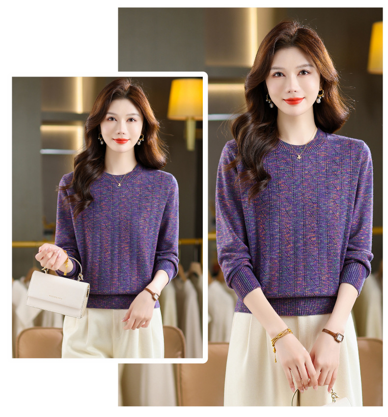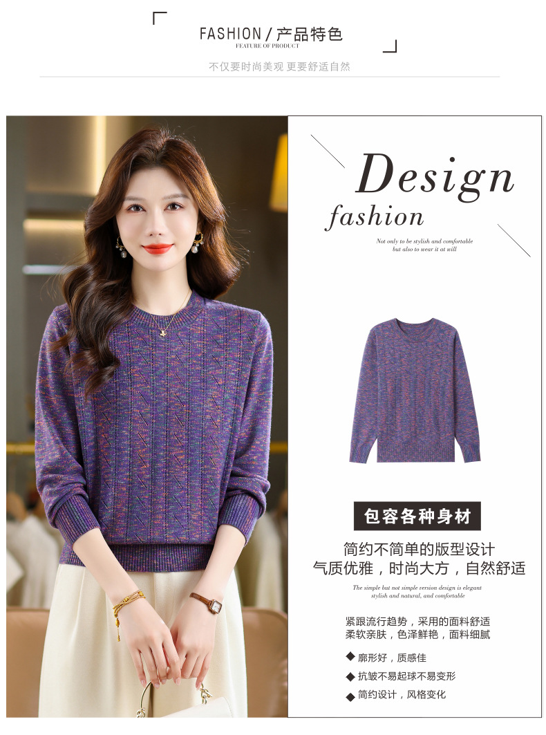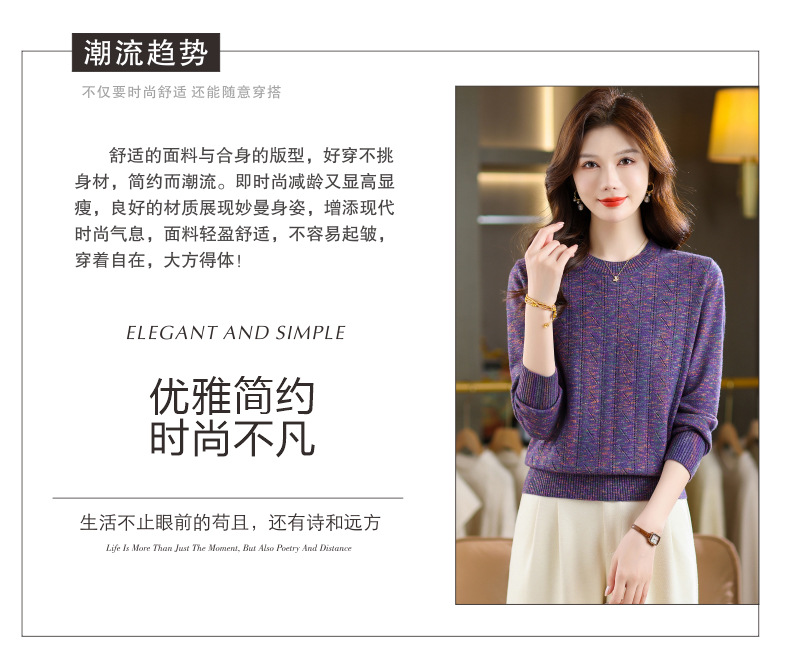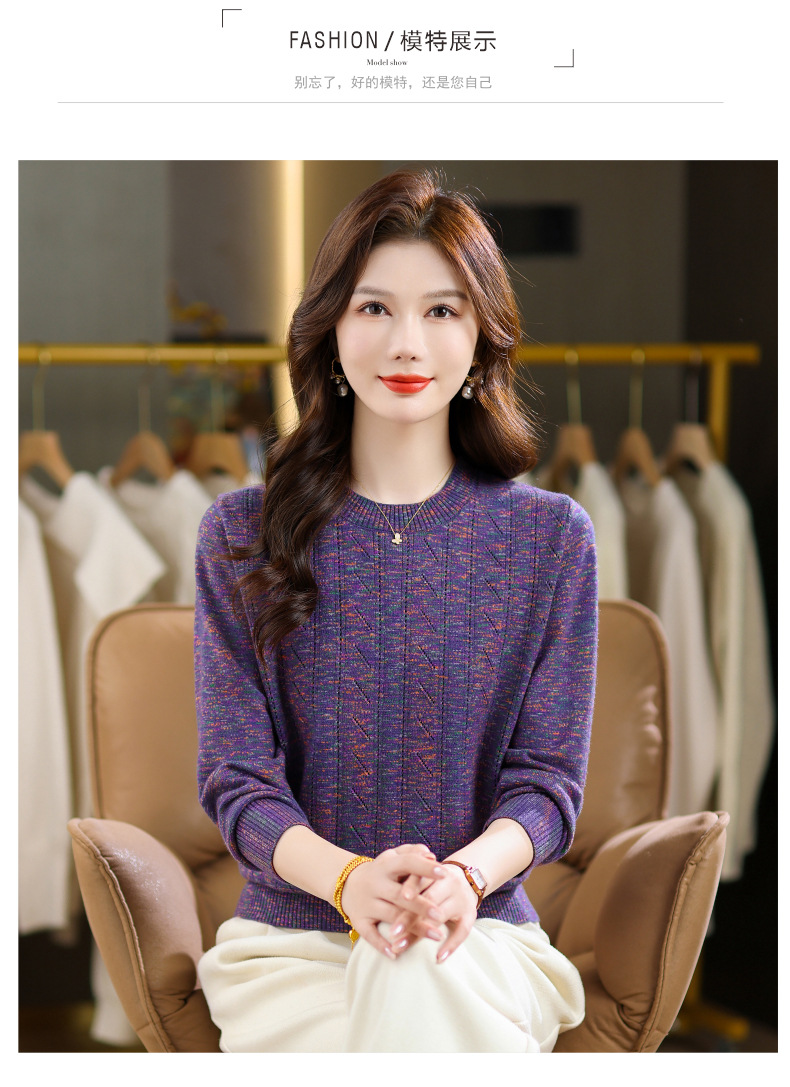 CC紫色圆领针织衫女春秋2025年气质款长袖打底套头宽松显瘦通勤毛衣