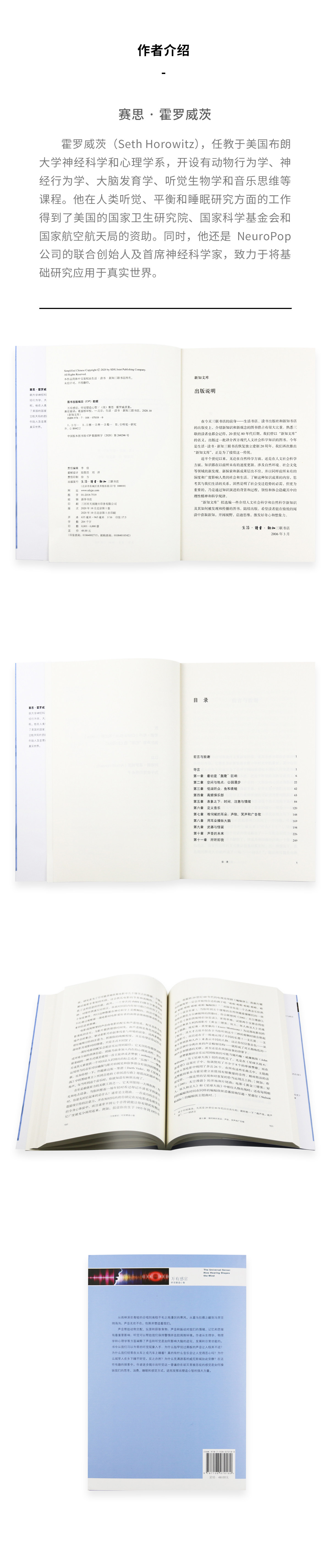 塞思·霍罗威茨(Seth Horowitz),任教于美国布朗大学神经科学和心理学系,开设有动物行为学、神经行为学、大脑发育学、听觉生物学和音乐思维等课程。他在人类听觉、平衡和睡眠研究方面的工作得到了美国的国家卫生研究院、国家科学基金会和国家航空航天局的资助。同时,他还是NeuroPop公司的联合创始人及首席神经科学家,致力于将基础研究应用于真实世界。