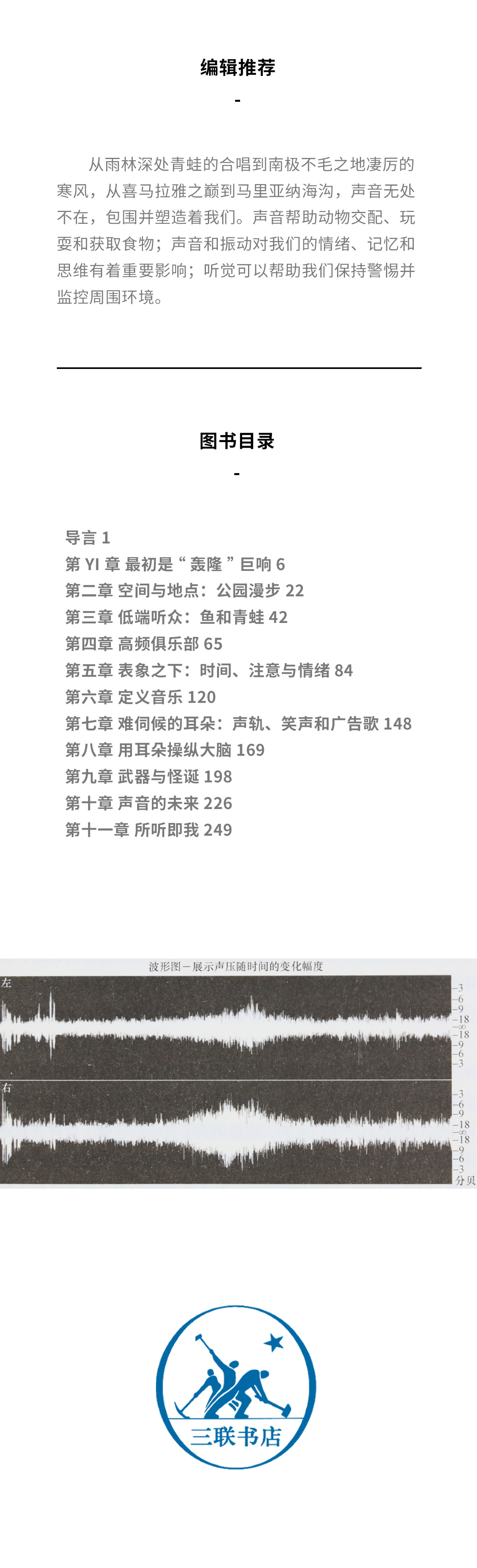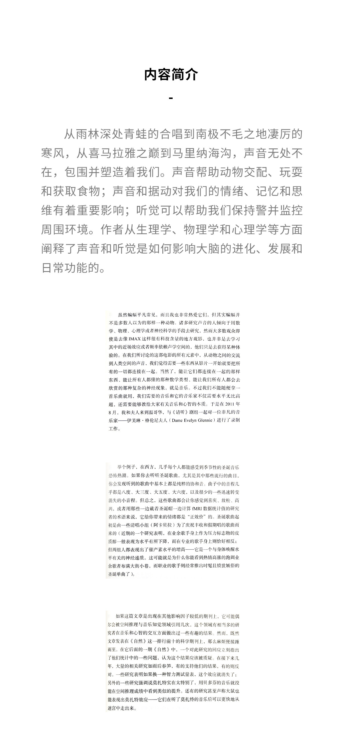 我们生活在一个充满了各种各样声音的世界里,声音和听觉对人类有着潜移默化却极其重要的影响。作者从生理学、物理学和心理学等方面阐释了声音和听觉是如何影响大脑的进化、发展和日常功能的。书中从我们习以为常的听觉现象入手:为什么指甲划过黑板的声音让人极其不适?为什么我们经常在火车上或汽车上睡着?真的有什么音乐会让人觉得恶心吗?为什么城里人在乡下睡不好觉,反之亦然?为什么充满游客的威尼斯城如此安静?在这些有趣的探索中,作者逐步揭示出听觉这一普遍存在却又常被忽视的感觉是如何操纵我们的思考、消费、睡眠和感觉方式,进而发挥出塑造心智的强大力量。