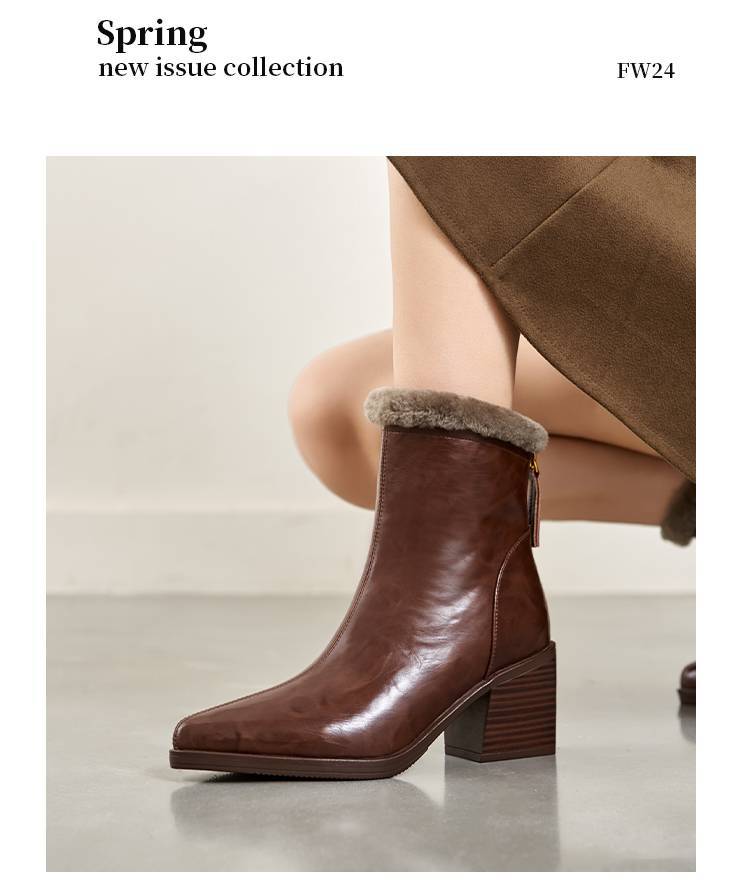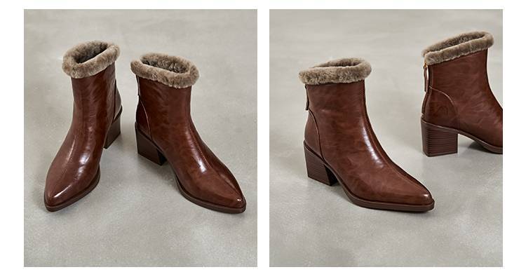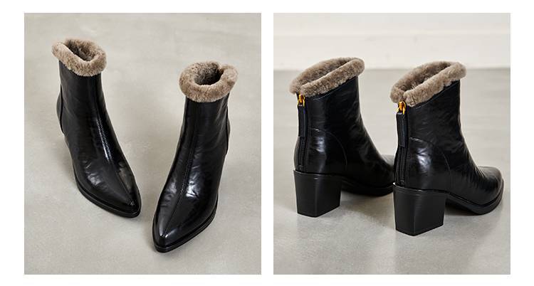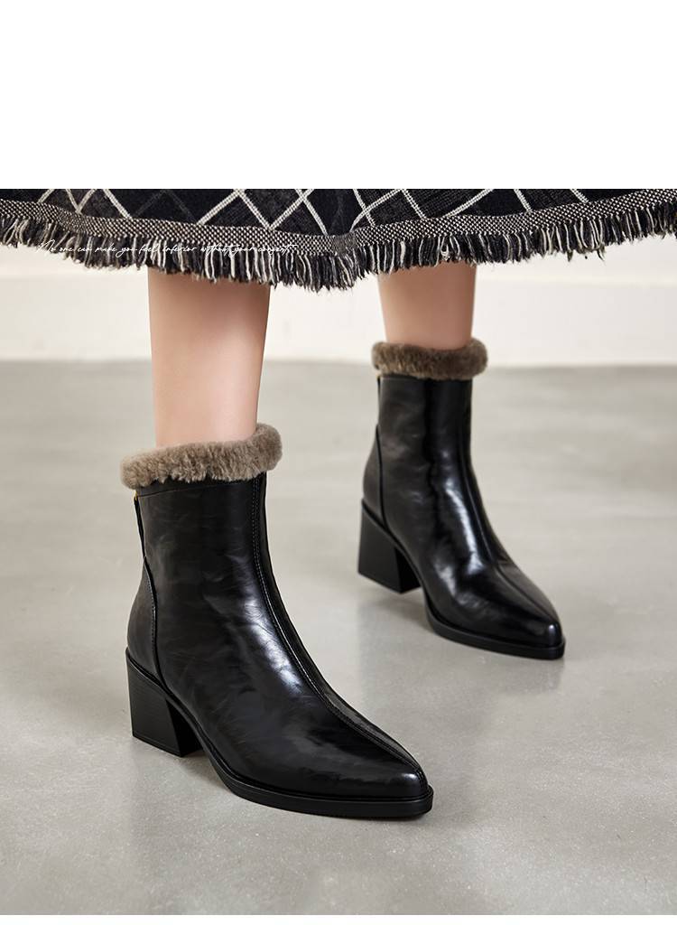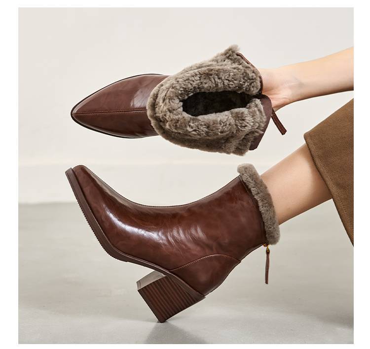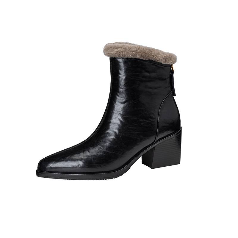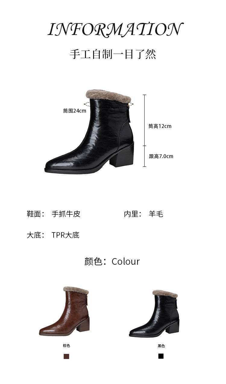 雀说 复古尖头牛皮羊毛内里短靴显瘦后拉链真皮保暖毛毛靴7048