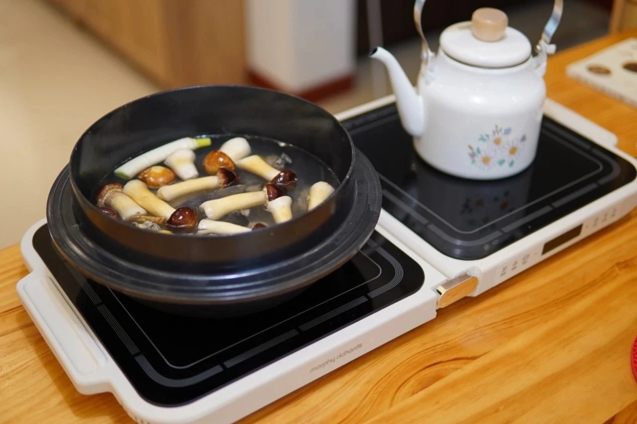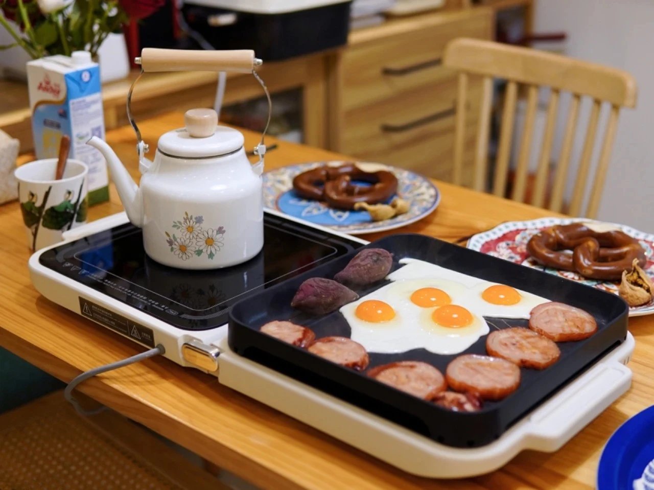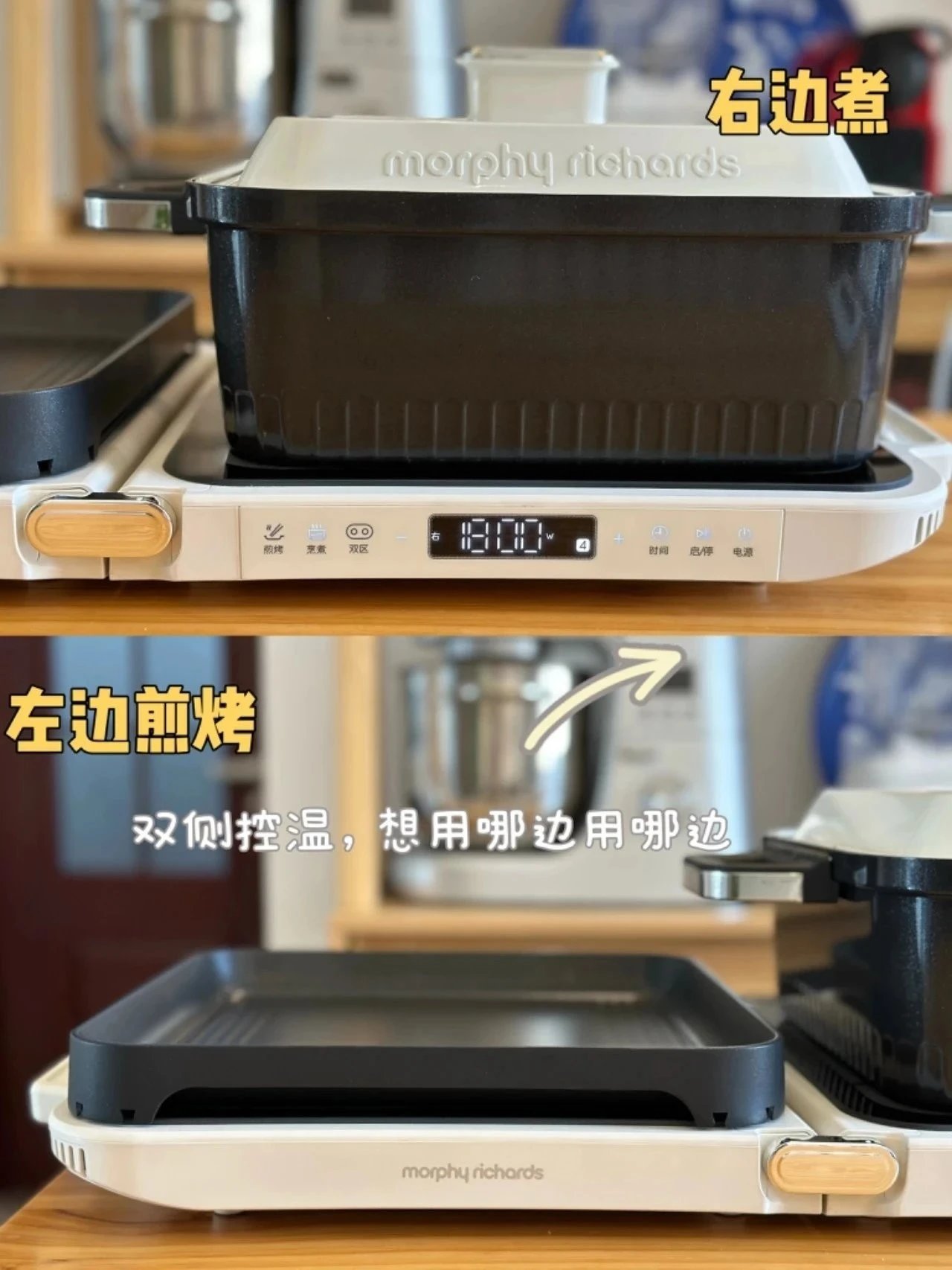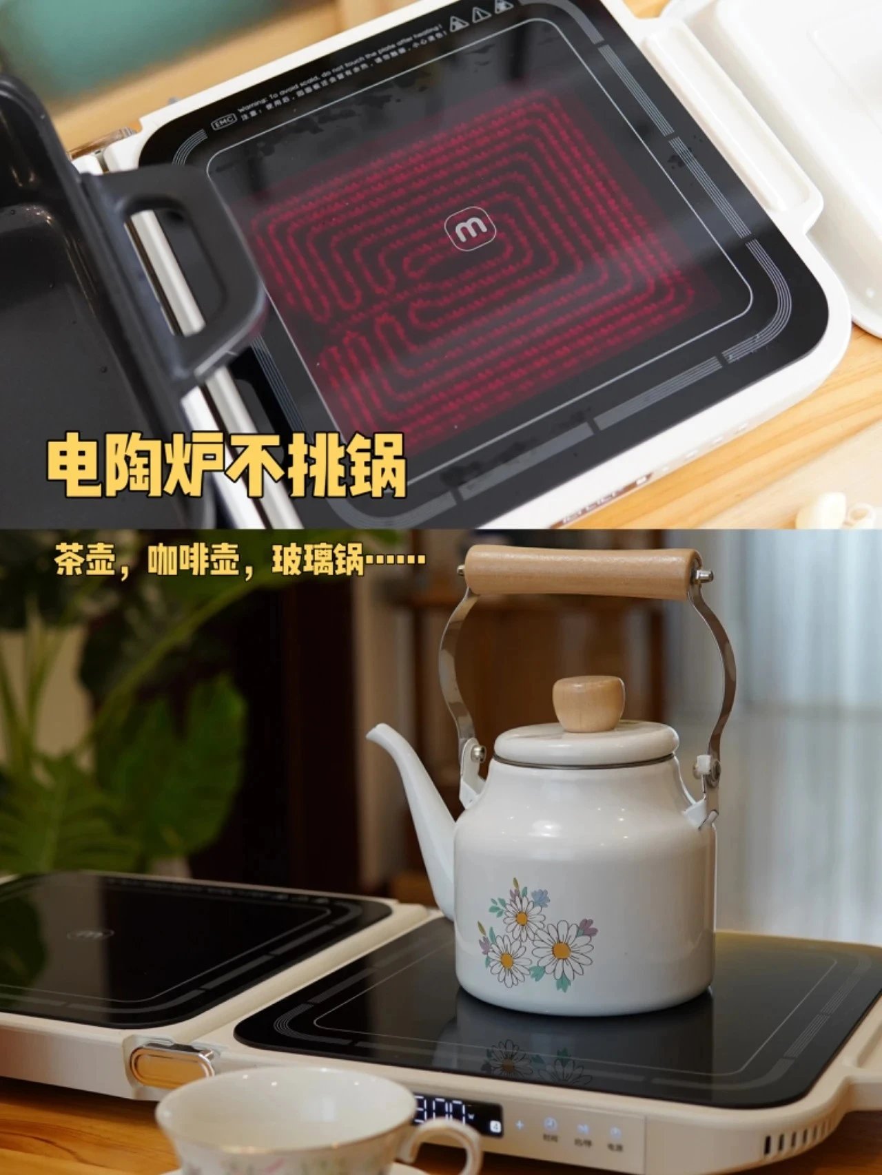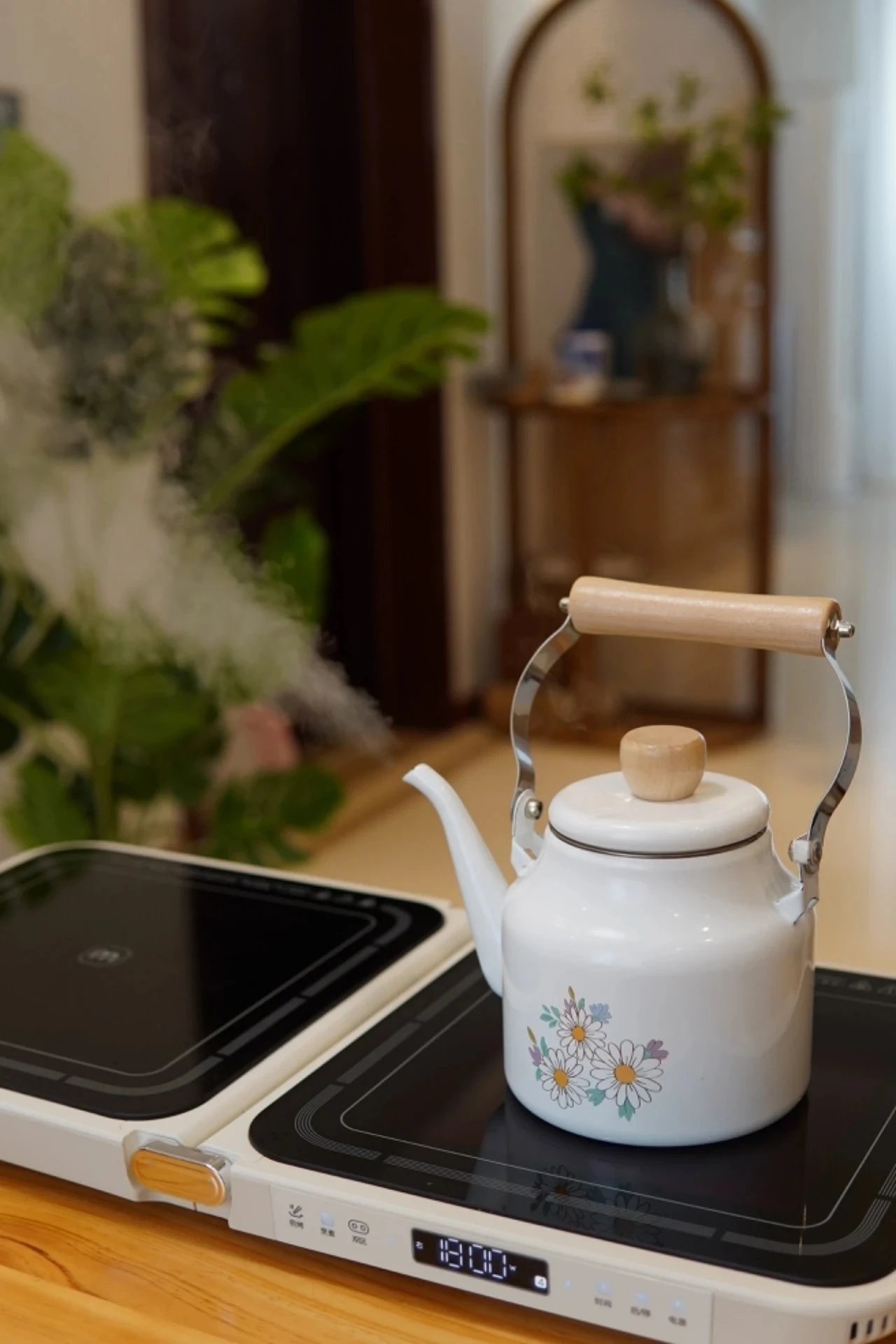 白天我一个人在家,用它热饭、煮面、喝茶。两边单独控温,想用哪边开那边。围炉煮茶都行,因为是电陶炉面板不调锅,搪瓷、玻璃、炒锅都能用。