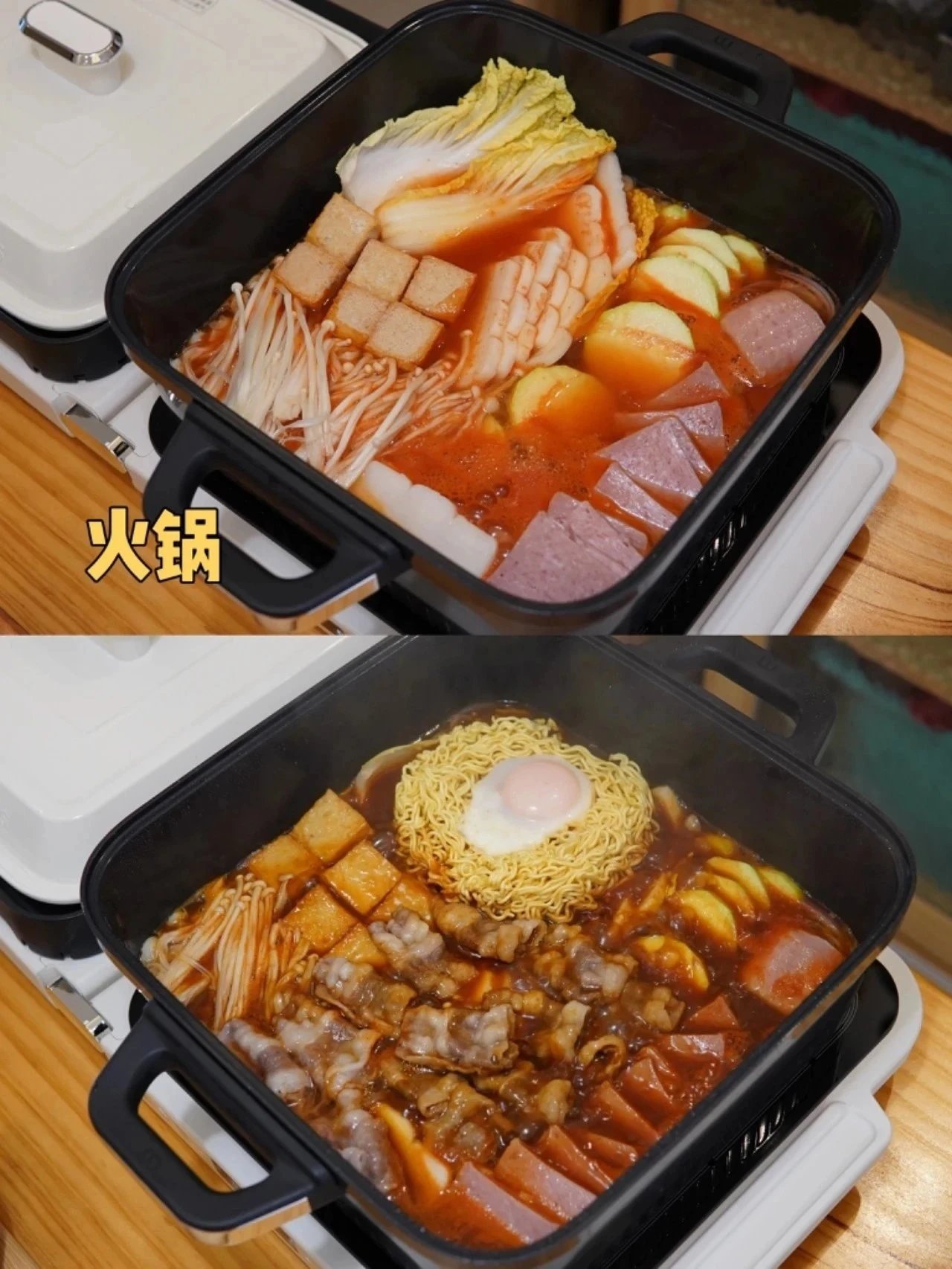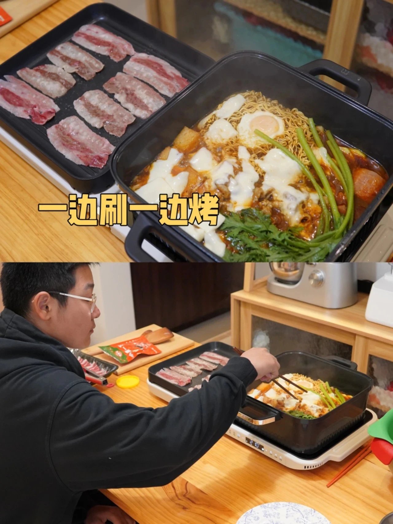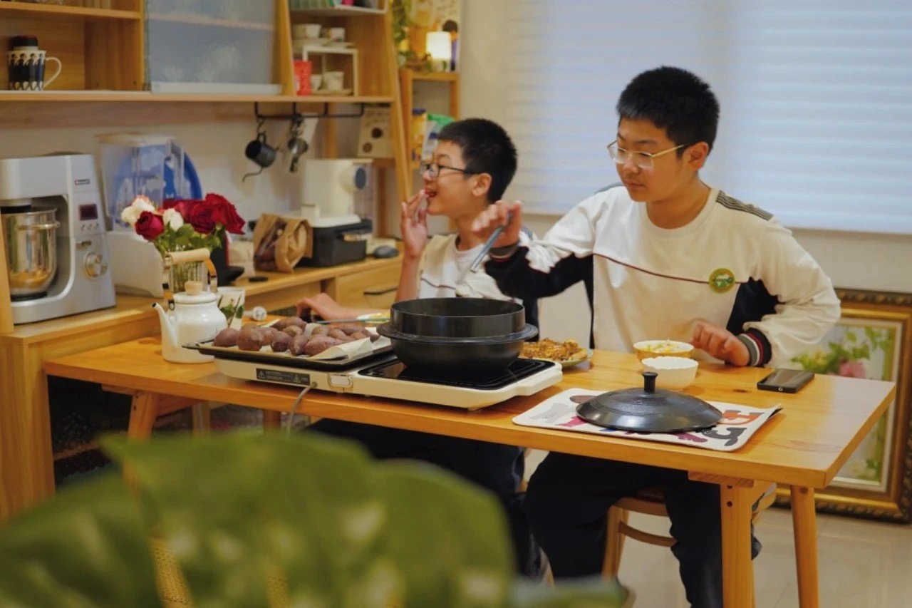 晚上孩子放学回来,两侧炉灶快速做好晚餐,一边涮锅一边烤肉别提多带劲儿!