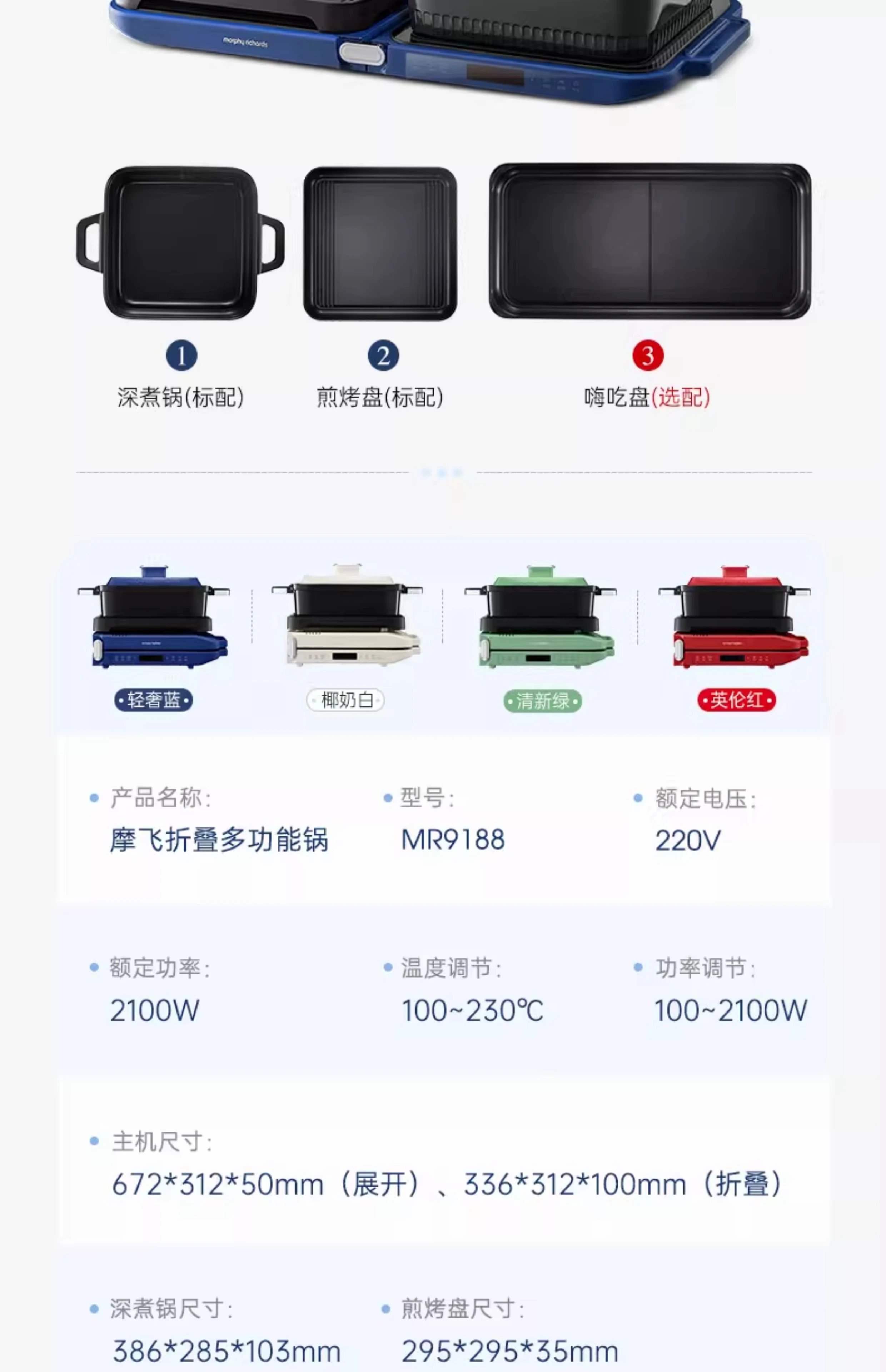 名称:摩飞第三代蒸煮煎烤折叠锅 发货地:广东 产地:广东 生产日期:2025 保质期:2年 快递:顺丰,中通及其他快递 不发西藏,海外,港澳台不发 保修期:2年 售后:如出现异常情况,请带面单+产品拍照+产品包装照片与我们联系,我们会第一时间处理,如产品有质量问题可在收货24小时之内,联系客服进行售后或者补发