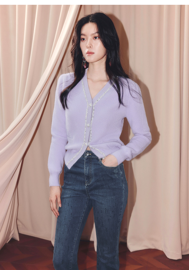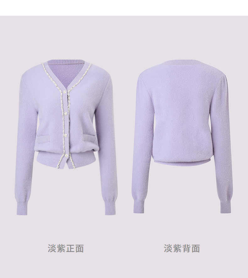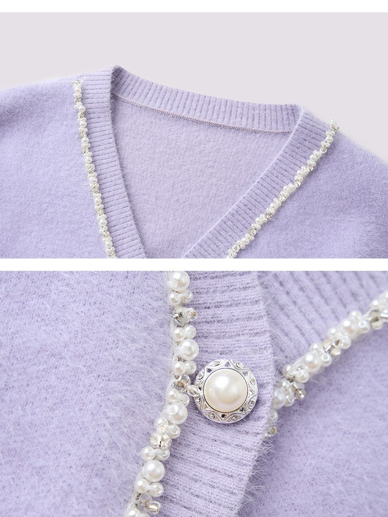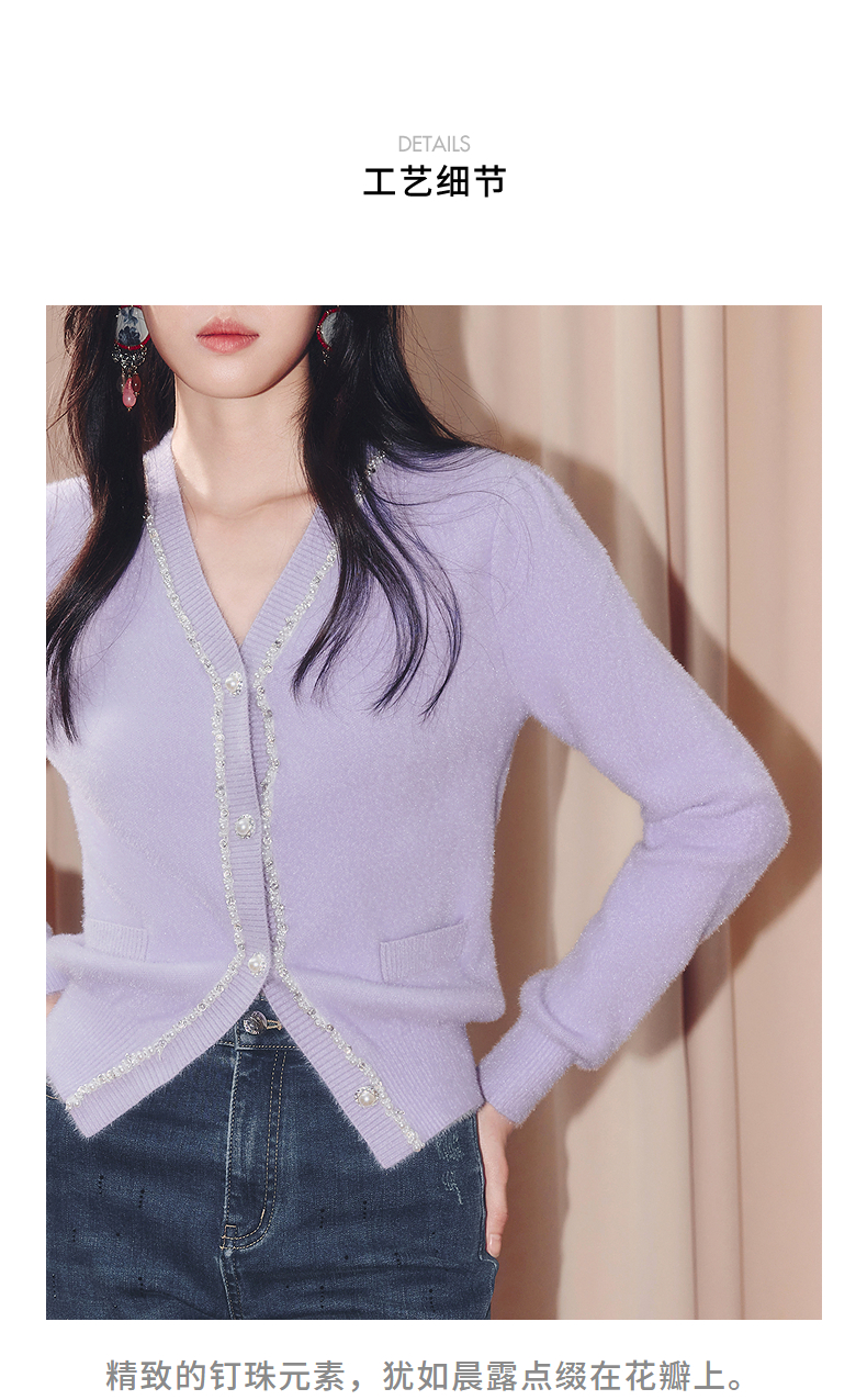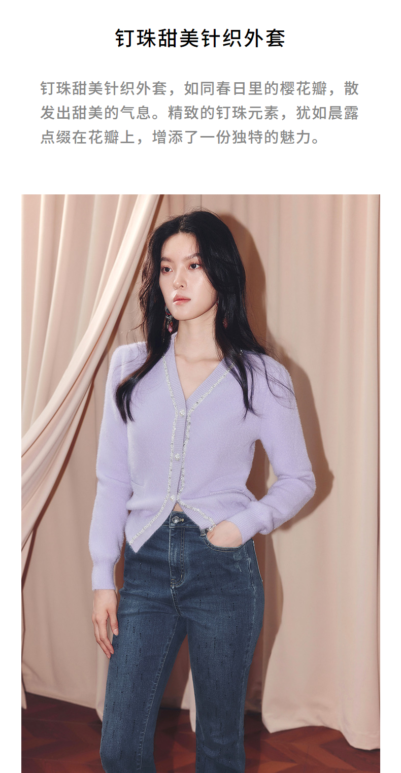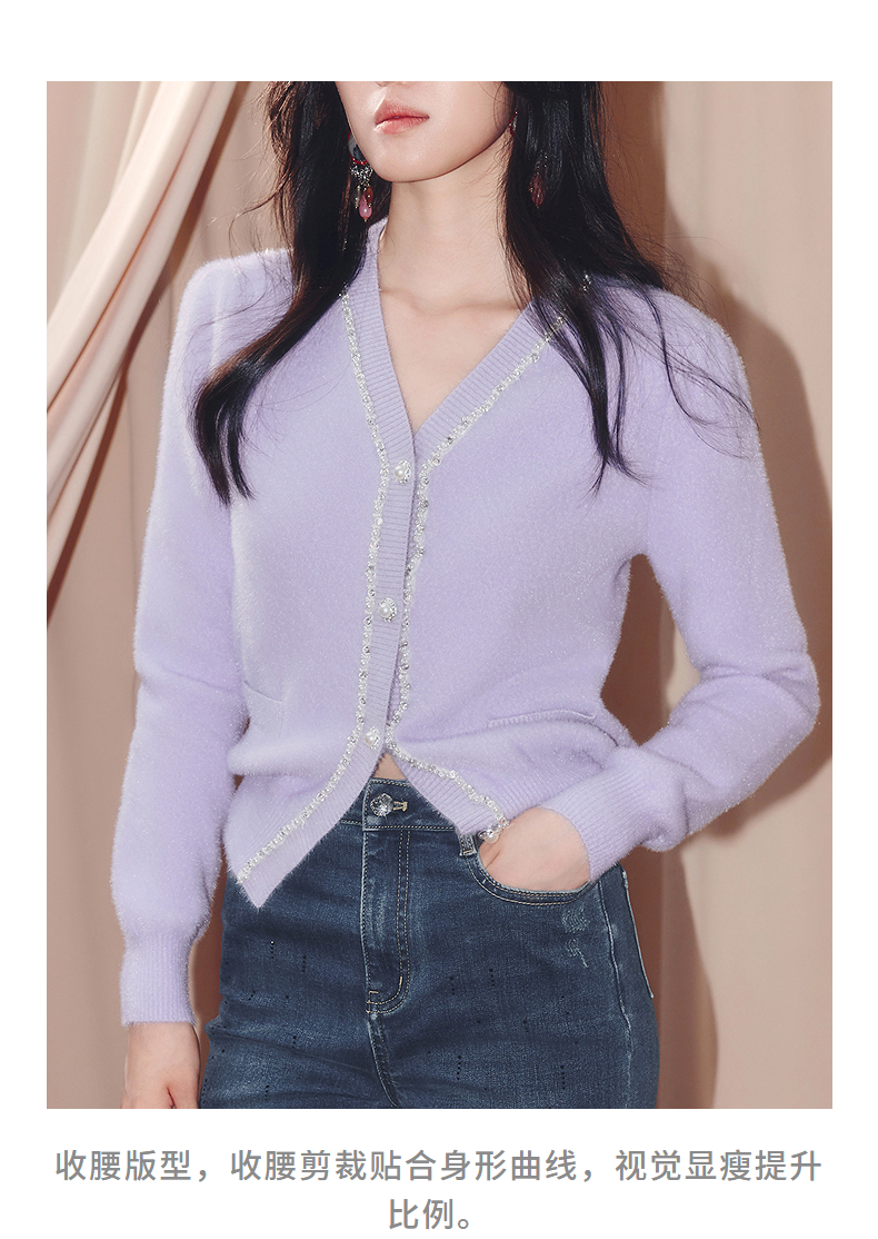 MAXRIENY甜美钉珠针织外套女25冬款修身显瘦v领收腰长袖上衣(货号:MF86JA520)