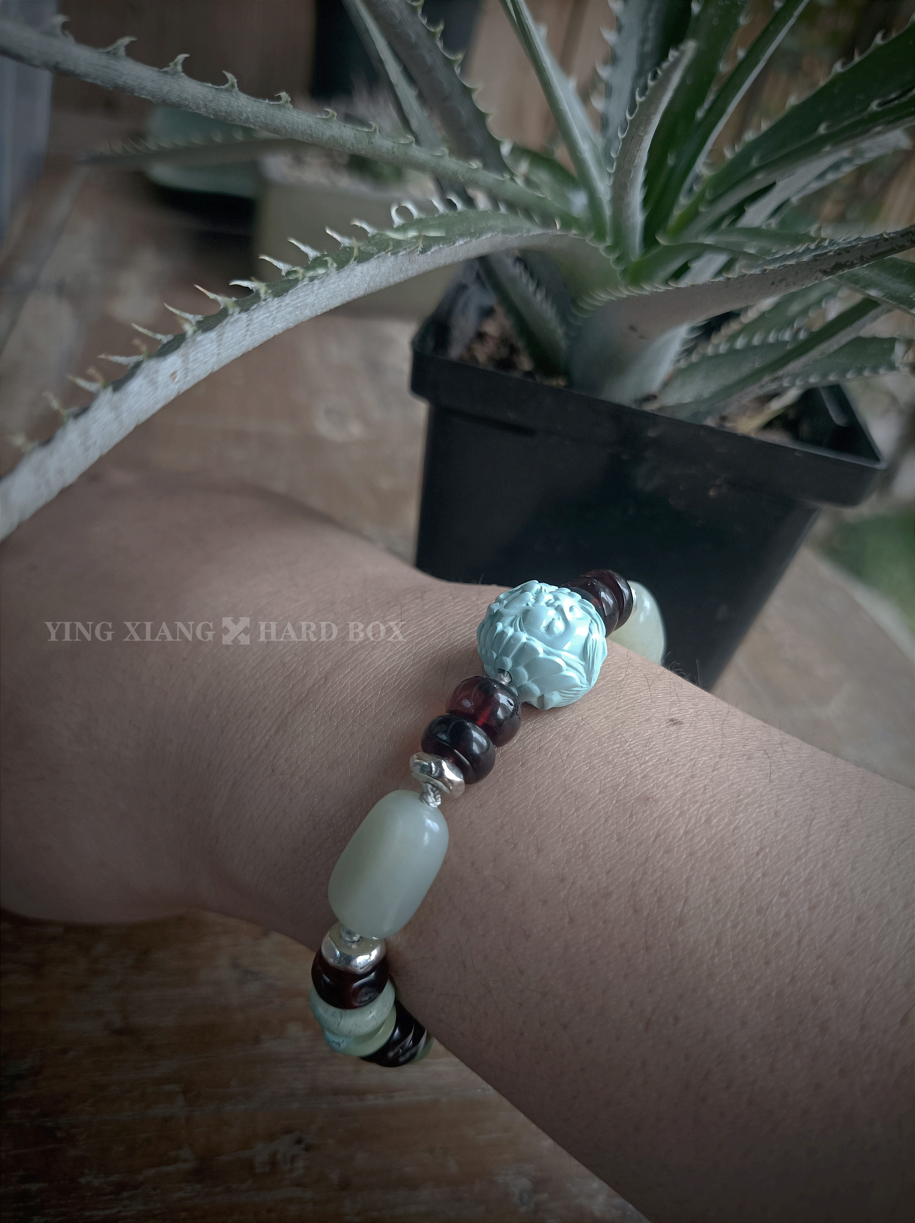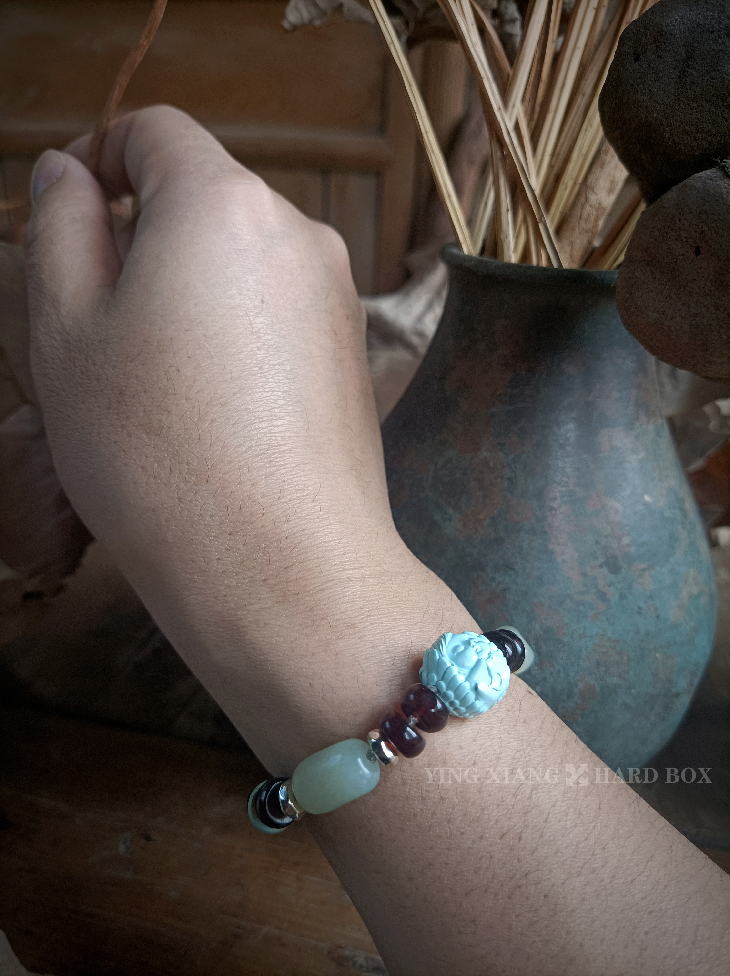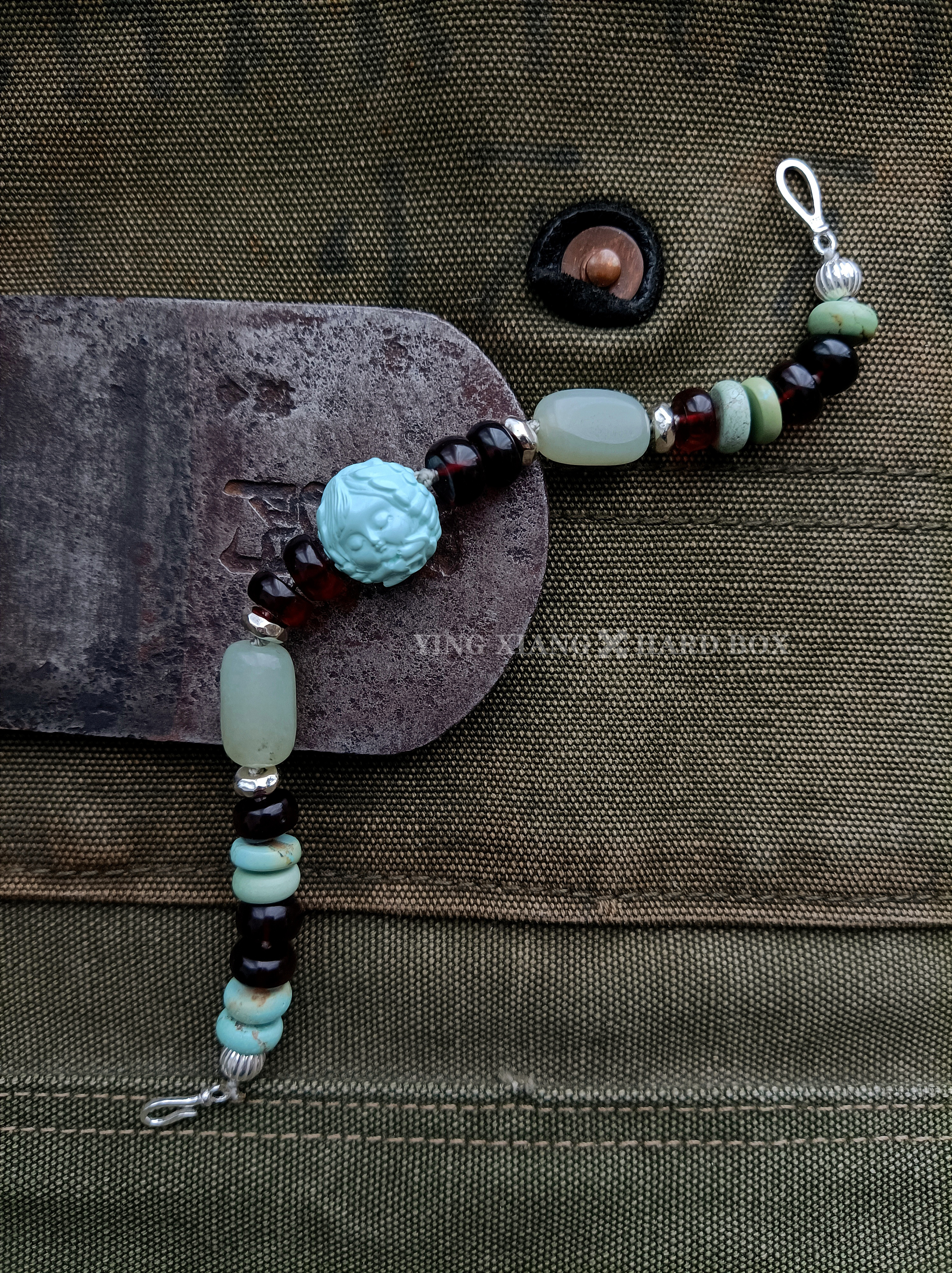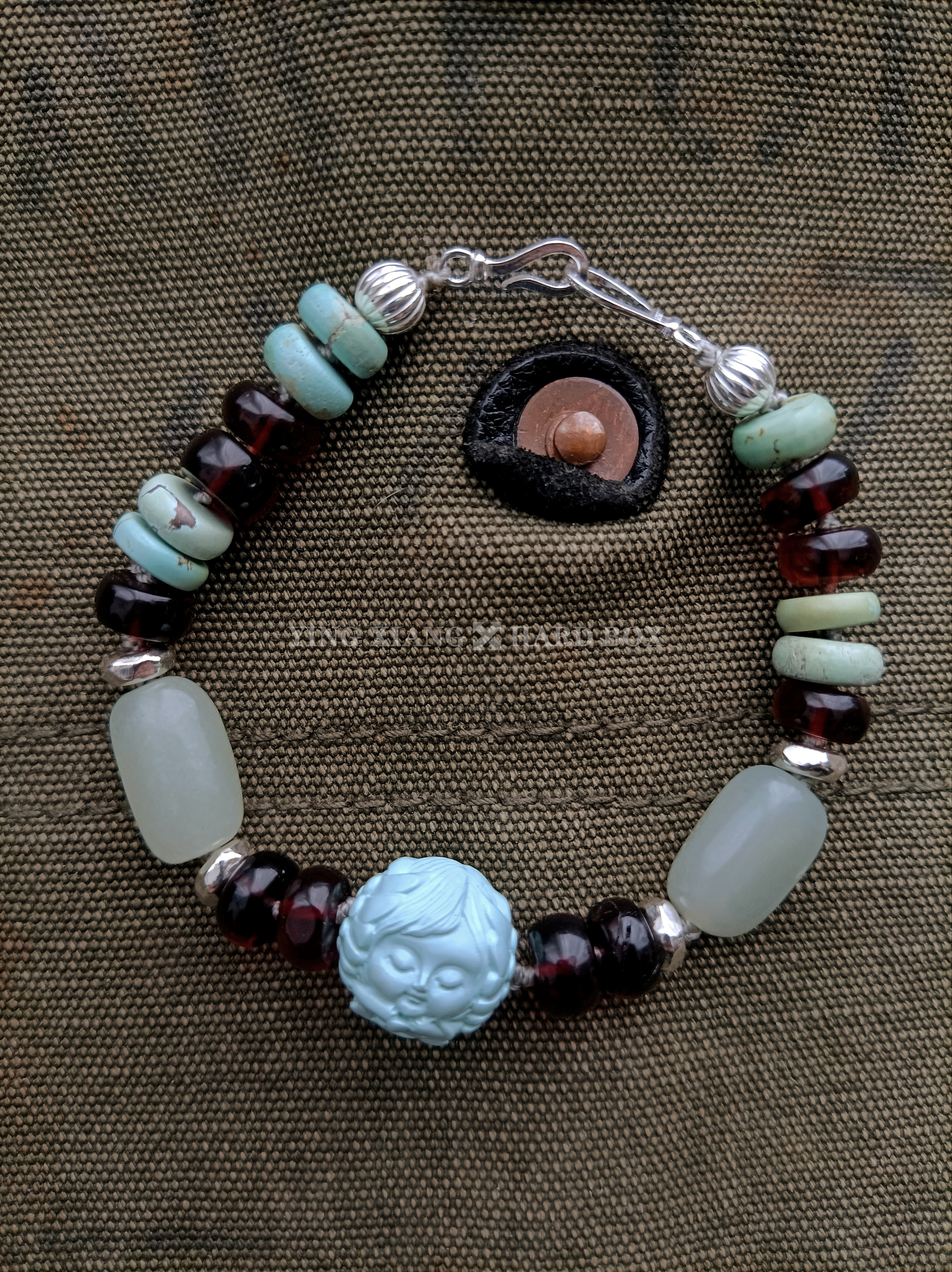 精雕绿松石+隔片 老和田玉原石珠 天然原矿血珀隔片 925银隔片+连接扣