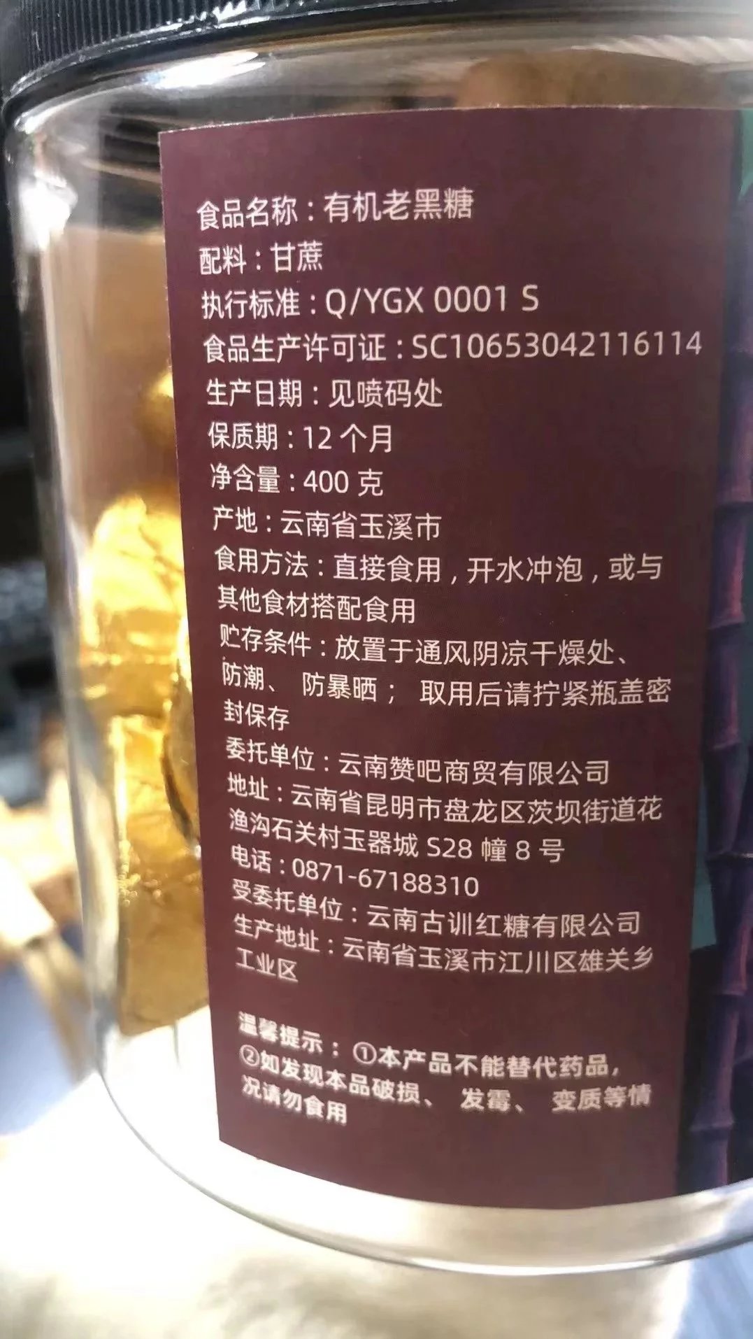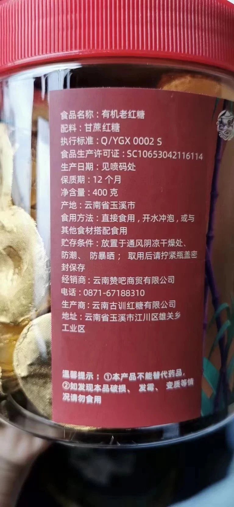 【品名】有机老红糖 有机老黑糖 【产地】云南玉溪 【发货地】云南昆明 【规格】400克/瓶 【保质期】12个月 【快递】随机不指定 【发货区域】新疆,西藏不发内蒙,甘肃,宁夏,青海+2,北京,上海+1 【发货时效】 48~72小时发