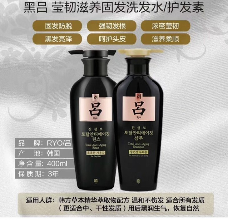 韩国黑吕洗髮水400ml 黑呂含有人參3倍滋養精華,深層滋養潤發牢固發根促進生發。💦針對頭髮出油,❤無光澤、斷發脫發的現象有明顯效果🍄韩方各种中草药精华萃取而成,其主要的功效是防止脱发,🍊滋养发质,使秀发黑润生气,修复损伤的头发,固发为其根本,使头发更加浓密亮丽🌻