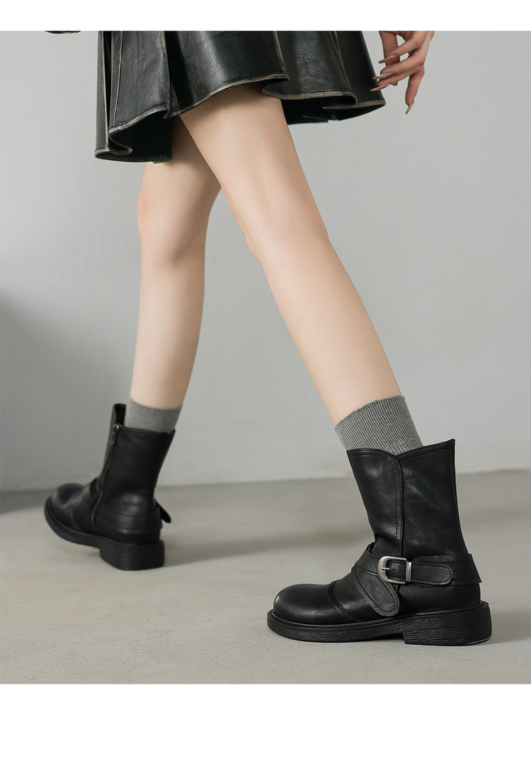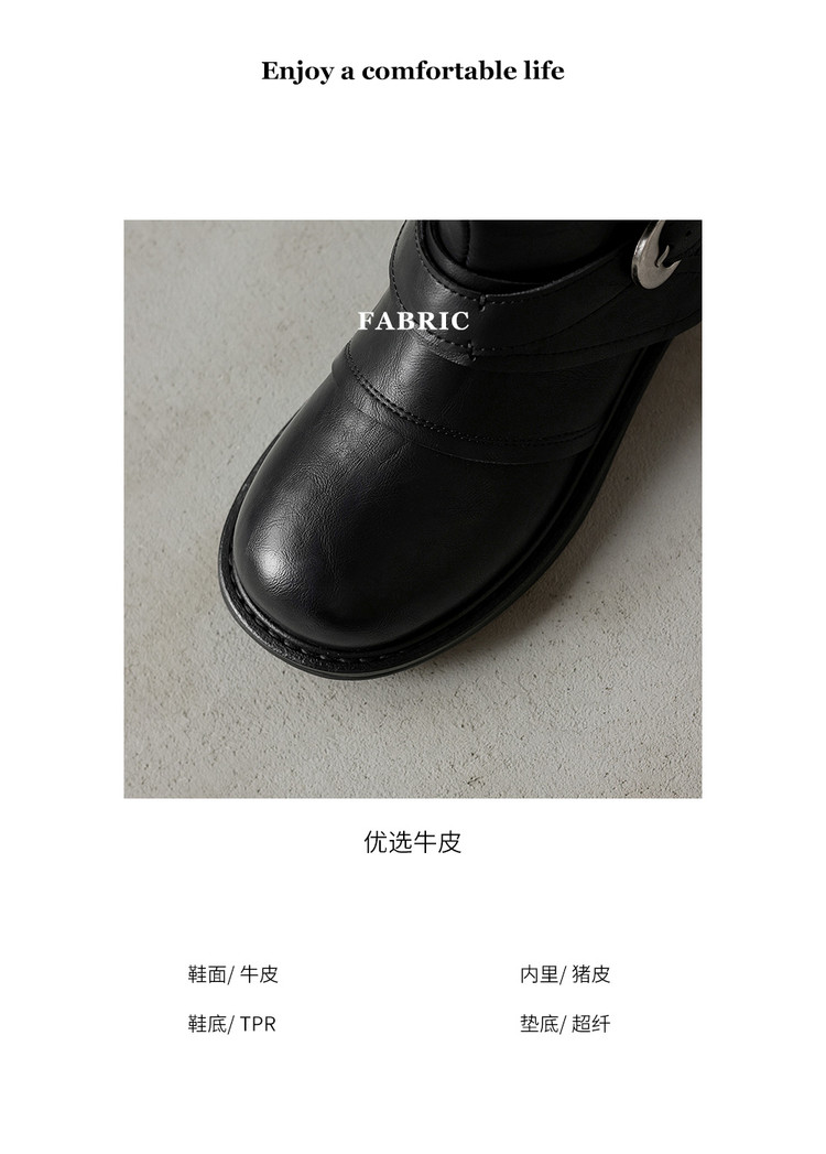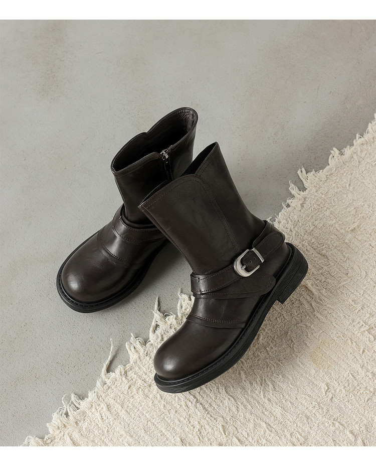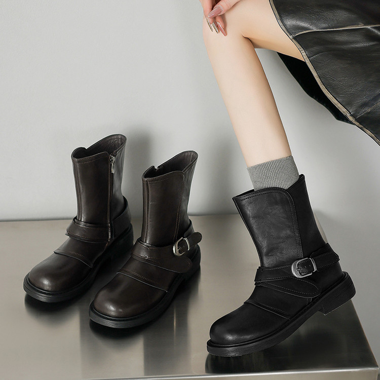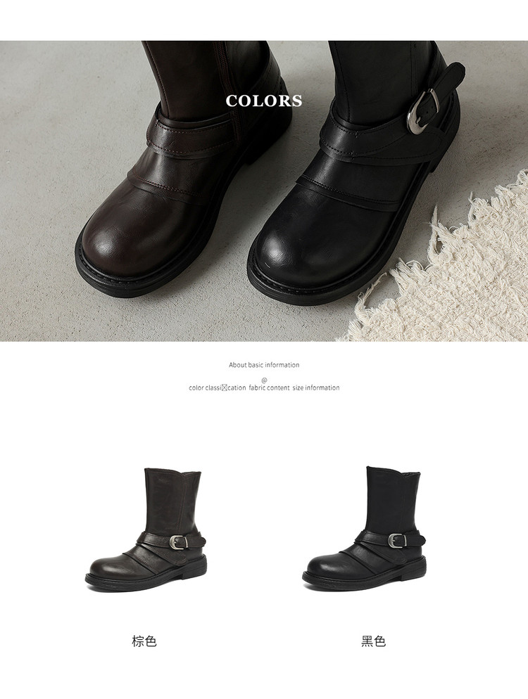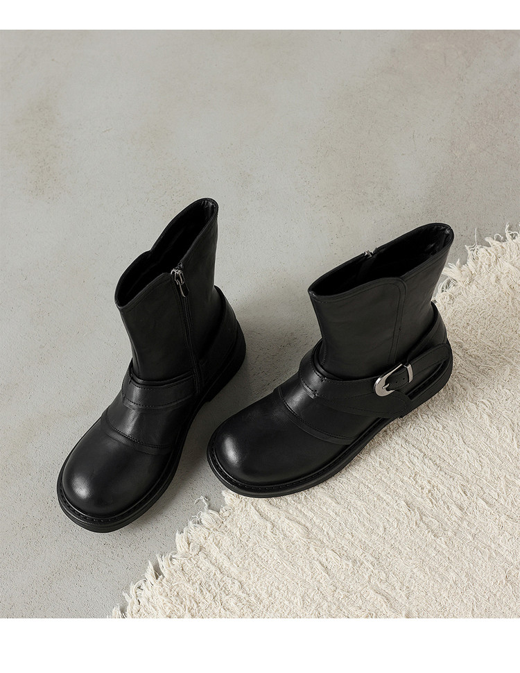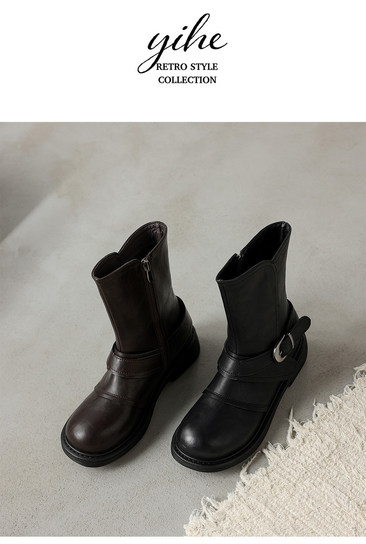 【预售5天】超好看!百搭交叉绑带真皮短靴女秋新款圆头粗跟侧拉链西部靴MX&mx35061