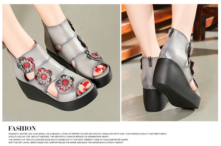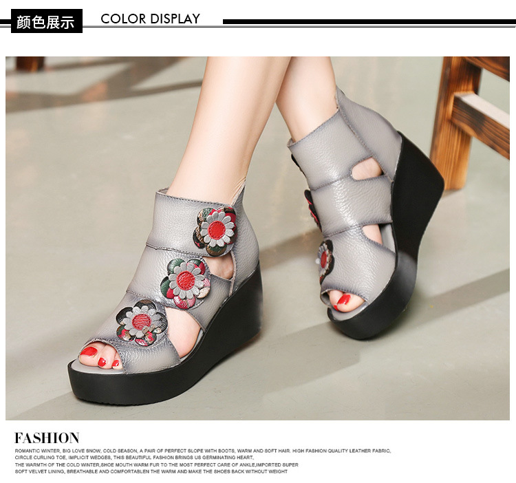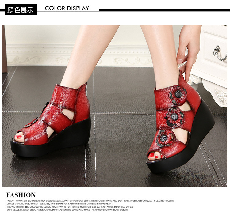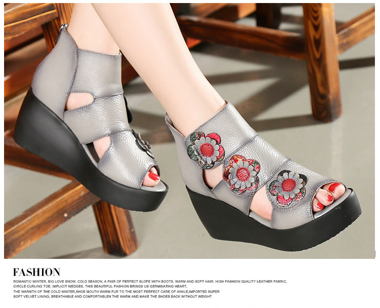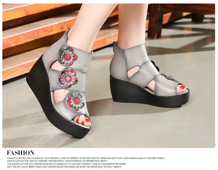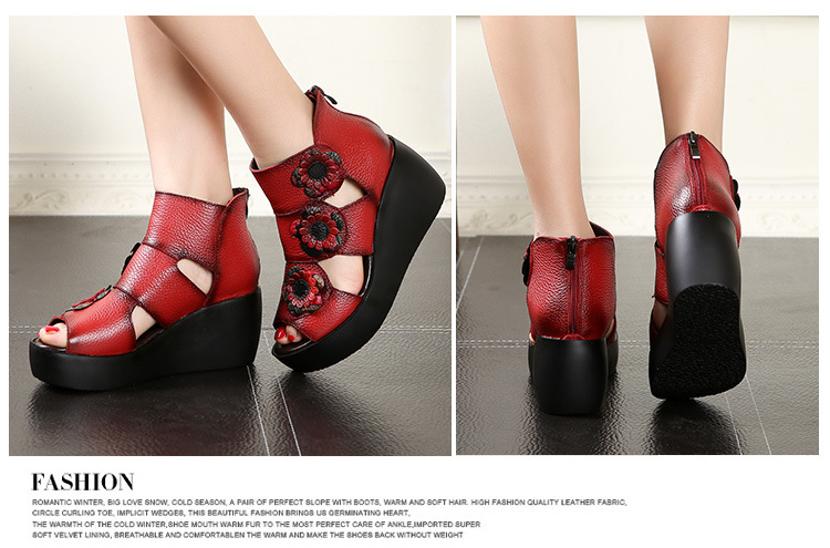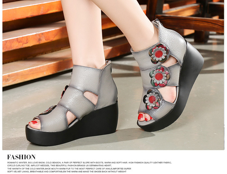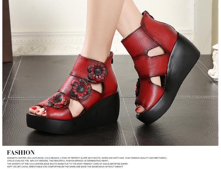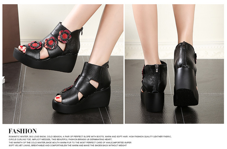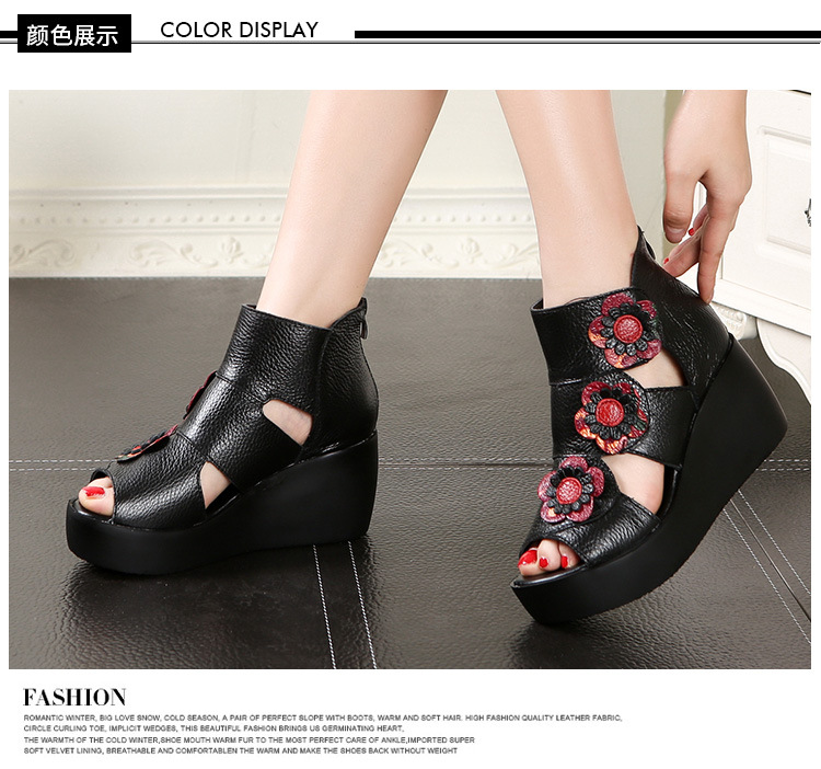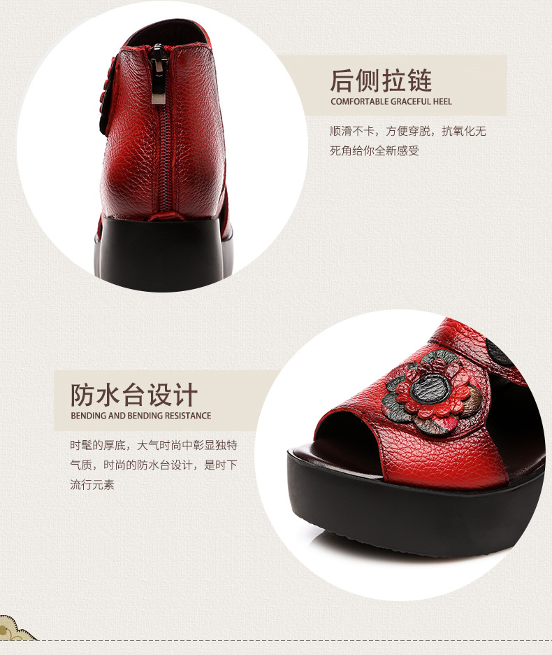 民族风特色真皮牛皮凉靴,鱼嘴坡跟后拉链罗马高帮凉鞋ZY