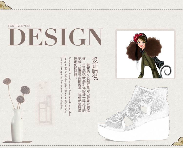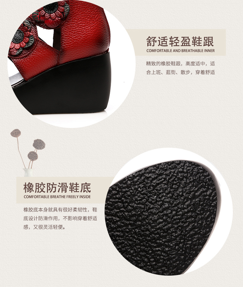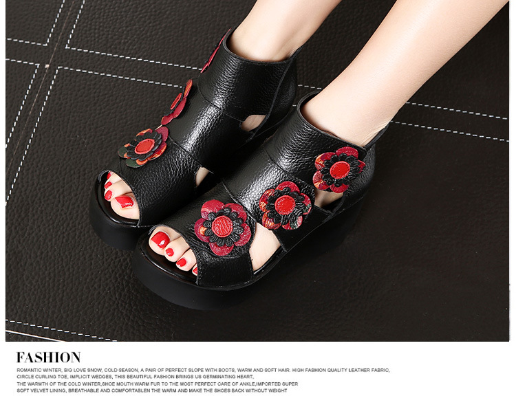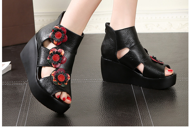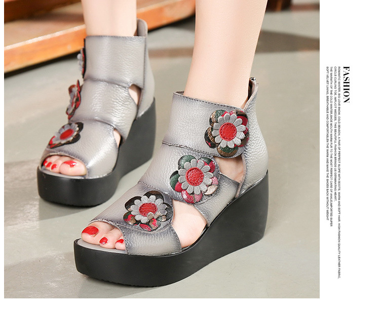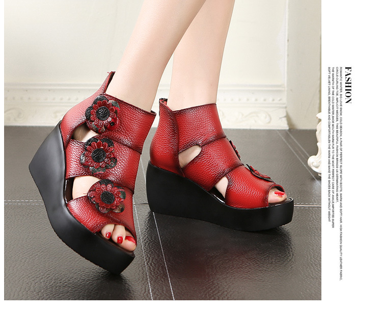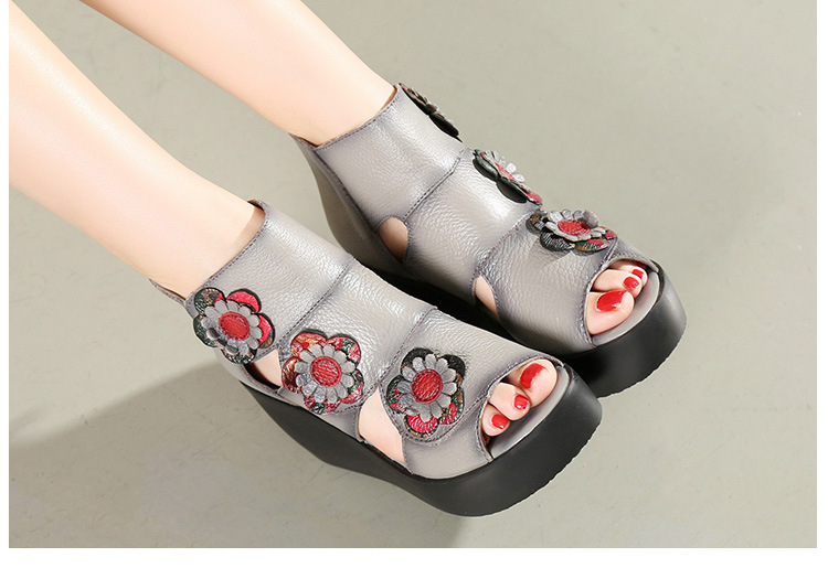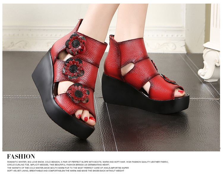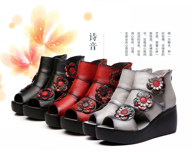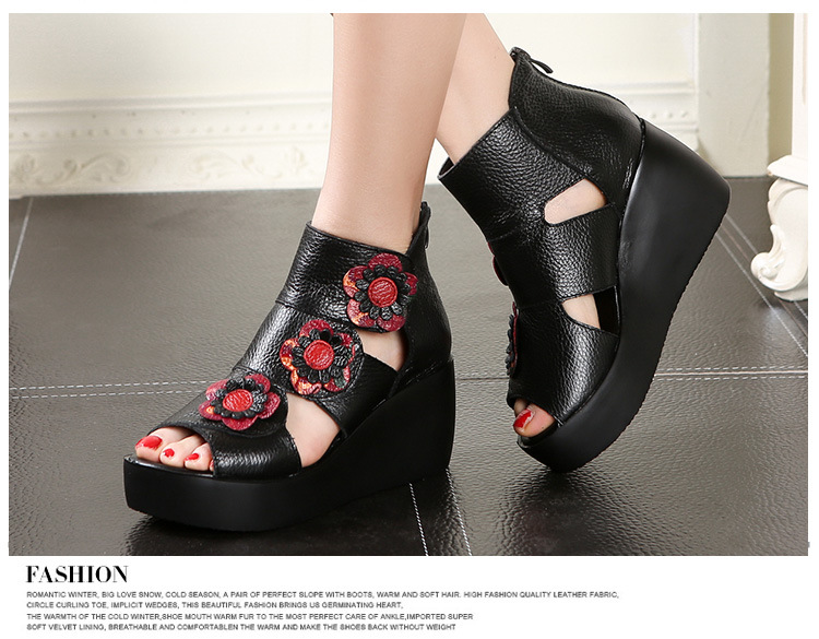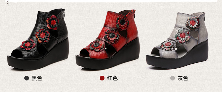 民族风特色真皮牛皮凉靴,鱼嘴坡跟后拉链罗马高帮凉鞋ZY