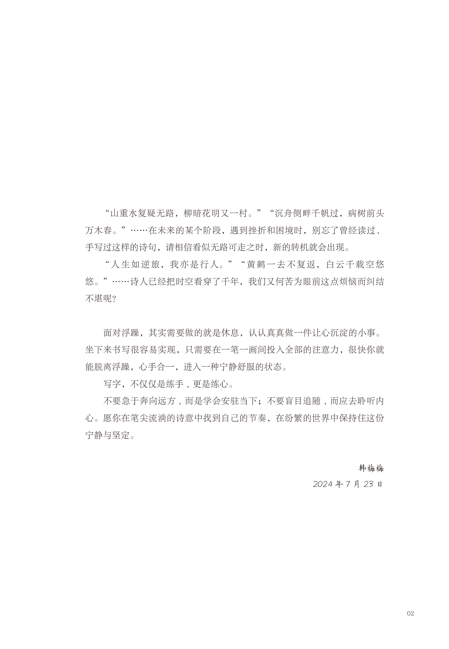 本书用简单质朴的语言对意境优美的三十余首诗词进行了解读与诠释,让读者体味诗词意蕴,感受文化之美;同时,本书也是一本 “字帖”,读者可以在领略古诗词美妙意境的同时,一笔一画地书写,在读诗中感受美好,于笔墨间静心修身。