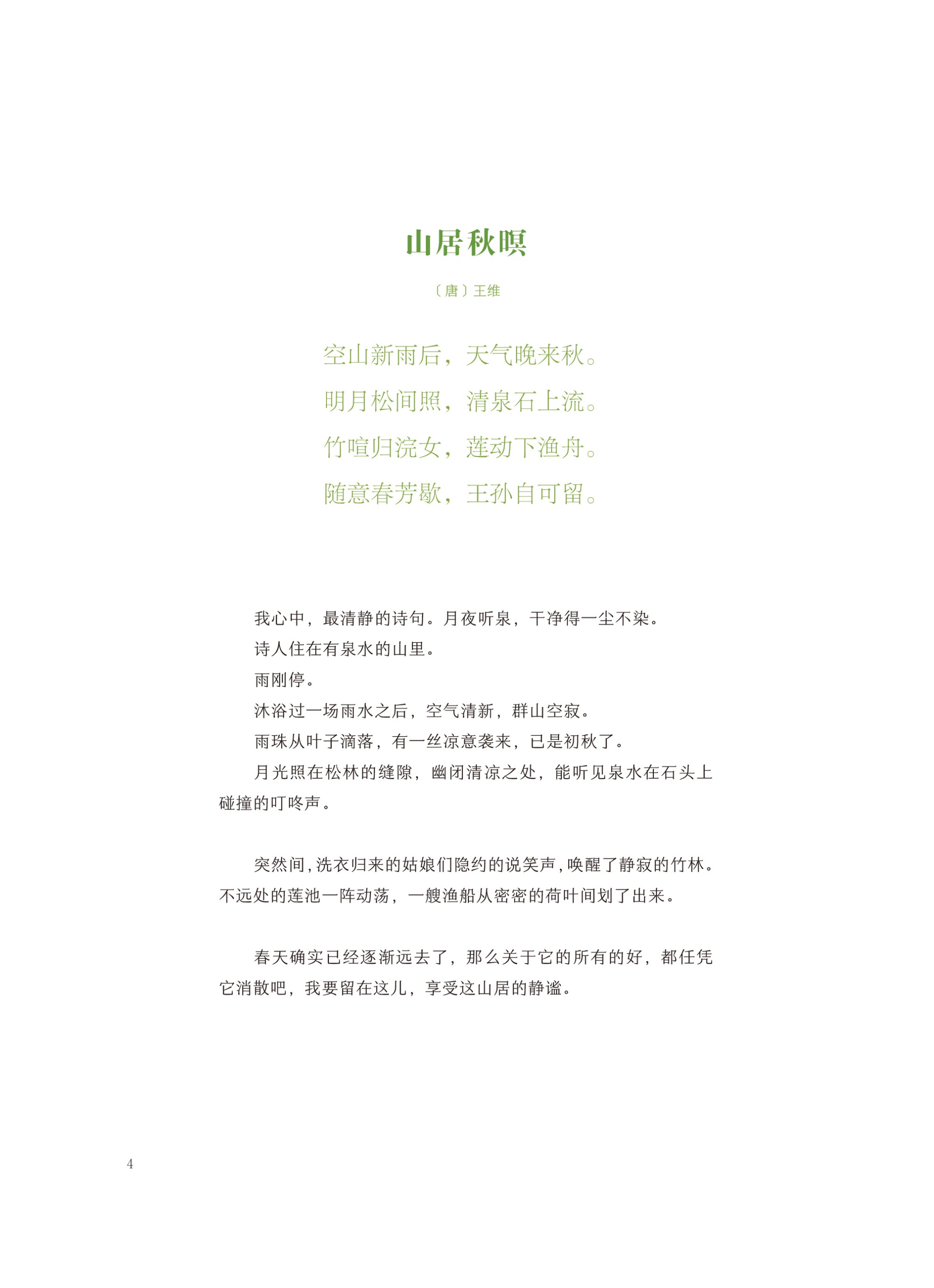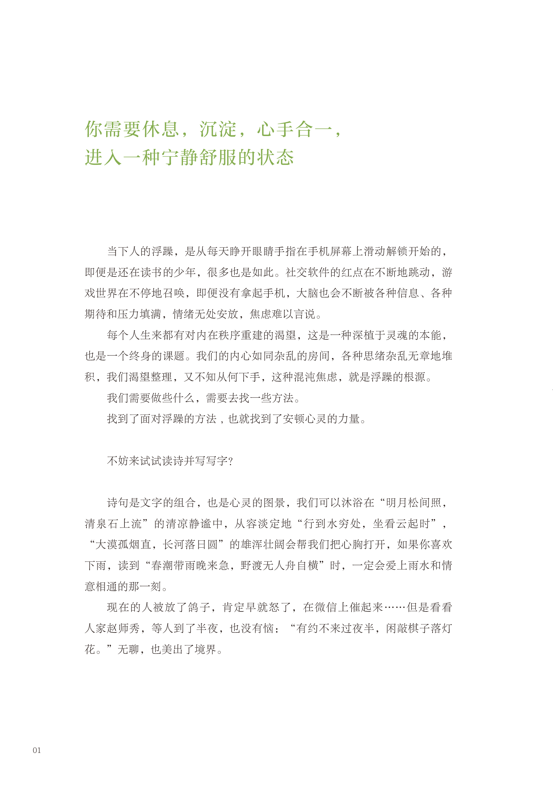 32 开裸脊平装,装帧精美,便于翻阅。四色印刷,图文结合,于读诗、看画和书写中感受心灵的宁静。