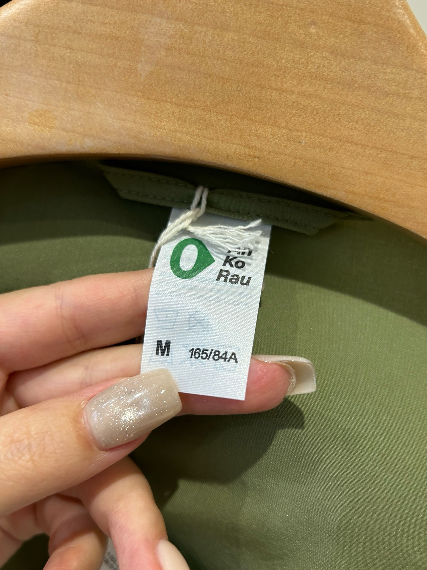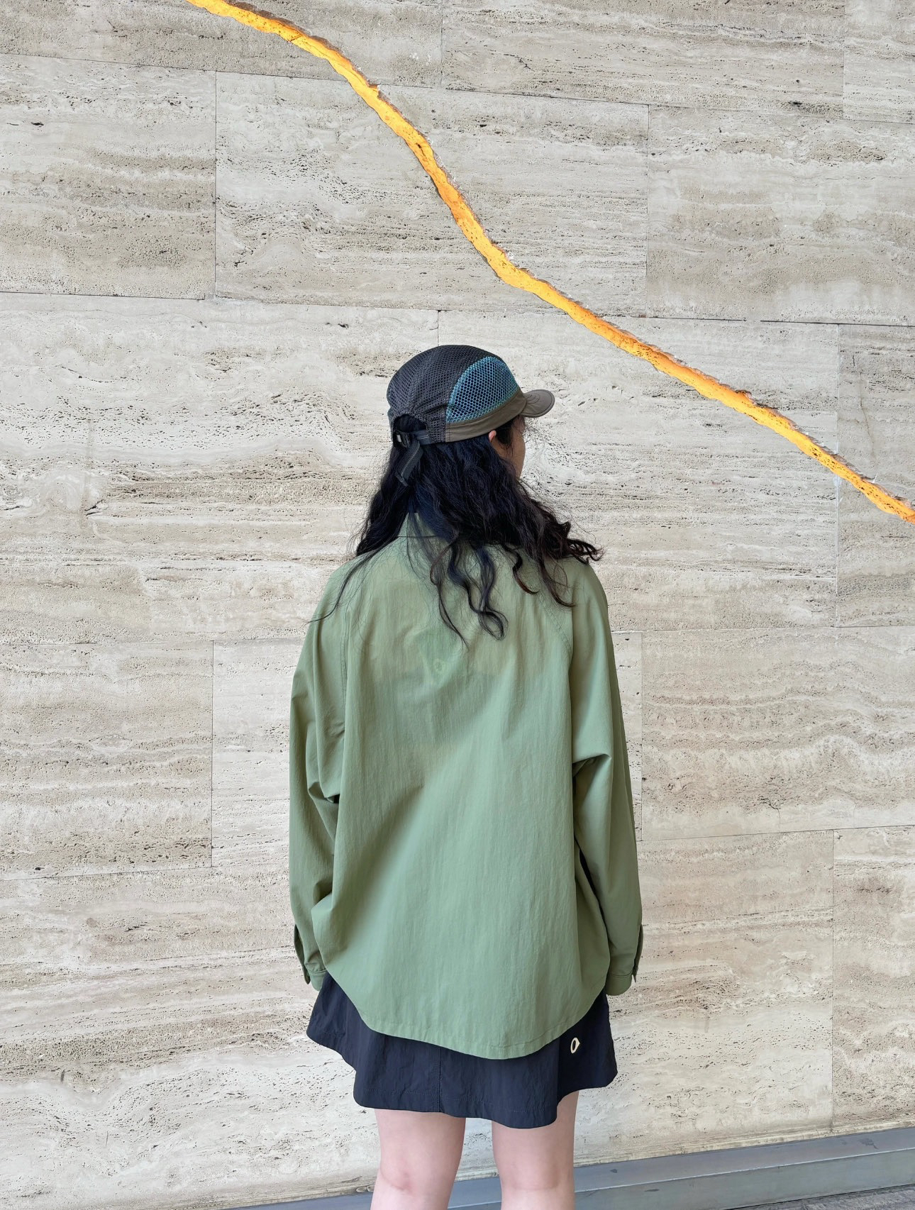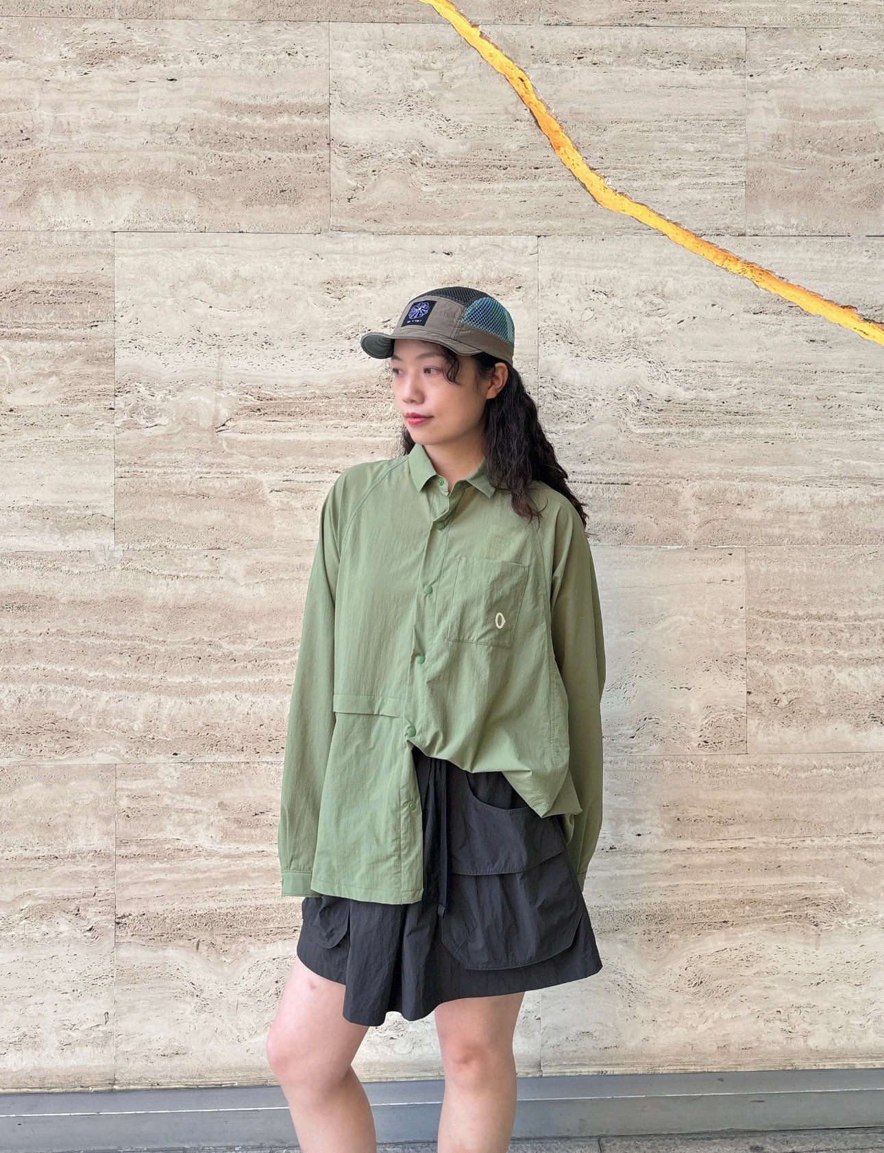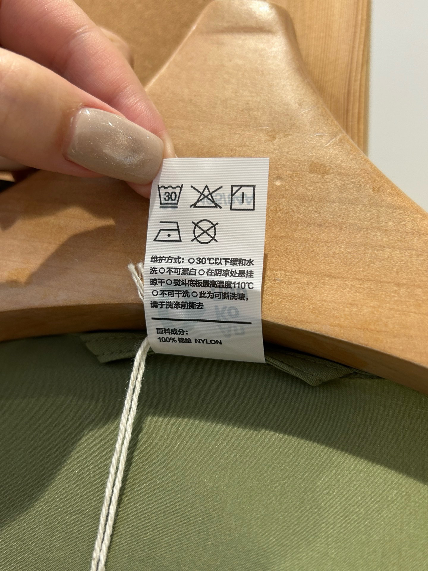 最特别的设计点在于一侧衣身有横条拼接,隐藏住一个小口袋,另一侧胸前是口袋,搭配O字小标。即使是不对称设计,也莫名的和谐!