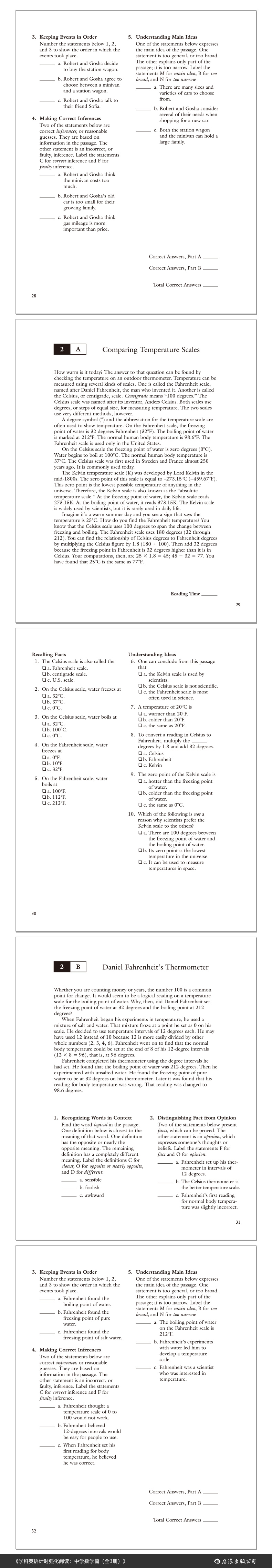 每册阅读内容分为15节,每节包含A、B篇阅读文章。文章A专注于提高阅读速度,由一篇400个单词长的关于某个数学主题的阅读文章,以及“回忆事实”“理解想法”两组多项选择题组成;文章B专注于掌握阅读理解的关键性领域,由一篇不限制阅读时间的文章,以及针对“通过语境识别单词”“区分事实和观点”“掌握事件顺序”“做出正确的推论”“理解中心思想”五种主要阅读理解技巧的练习组成。文章B长度不定,讨论的主题与对应文章A的内容相关。书后附参考答案,以及针对阅读时间、答题分数、理解能力的评定量表,供学生和老师了解掌握阅读进展和能力水平。