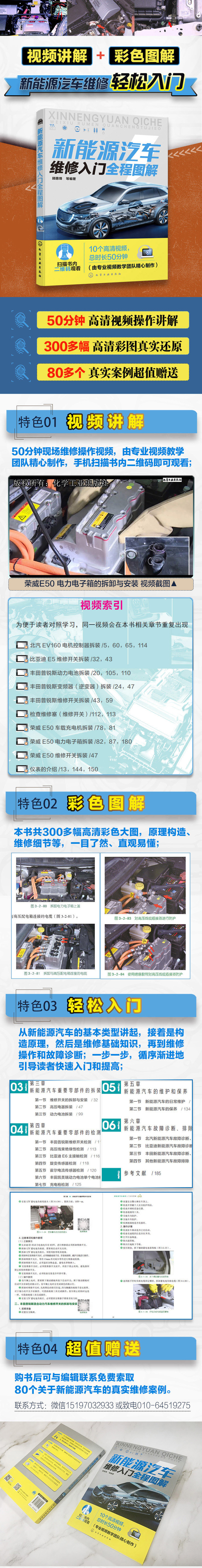 3.轻松入门:从新能源汽车的基本类型讲起,接着是构造原理,然后是维修基础知识,再到维修操作和故障诊断;一步一步,循序渐进地引导读者快速入门和提高。