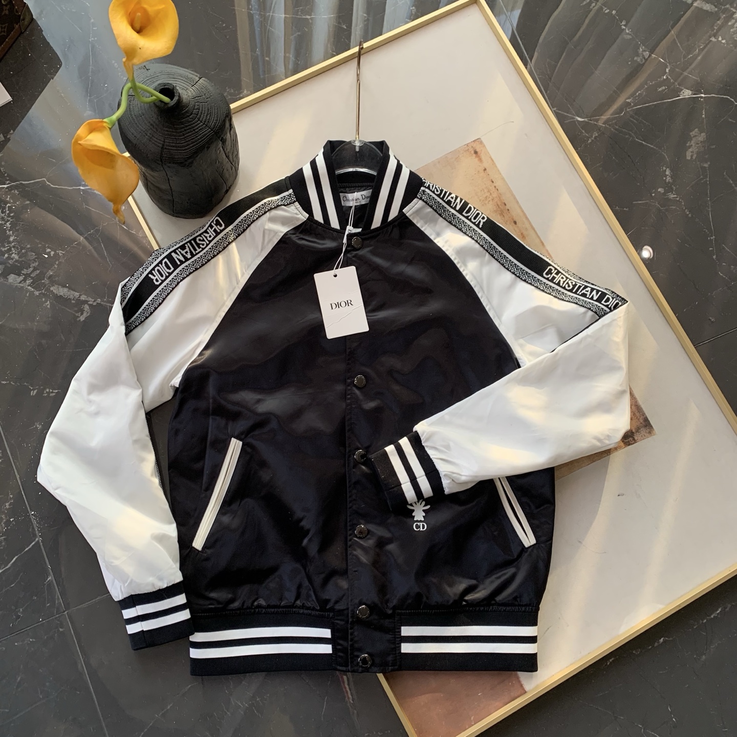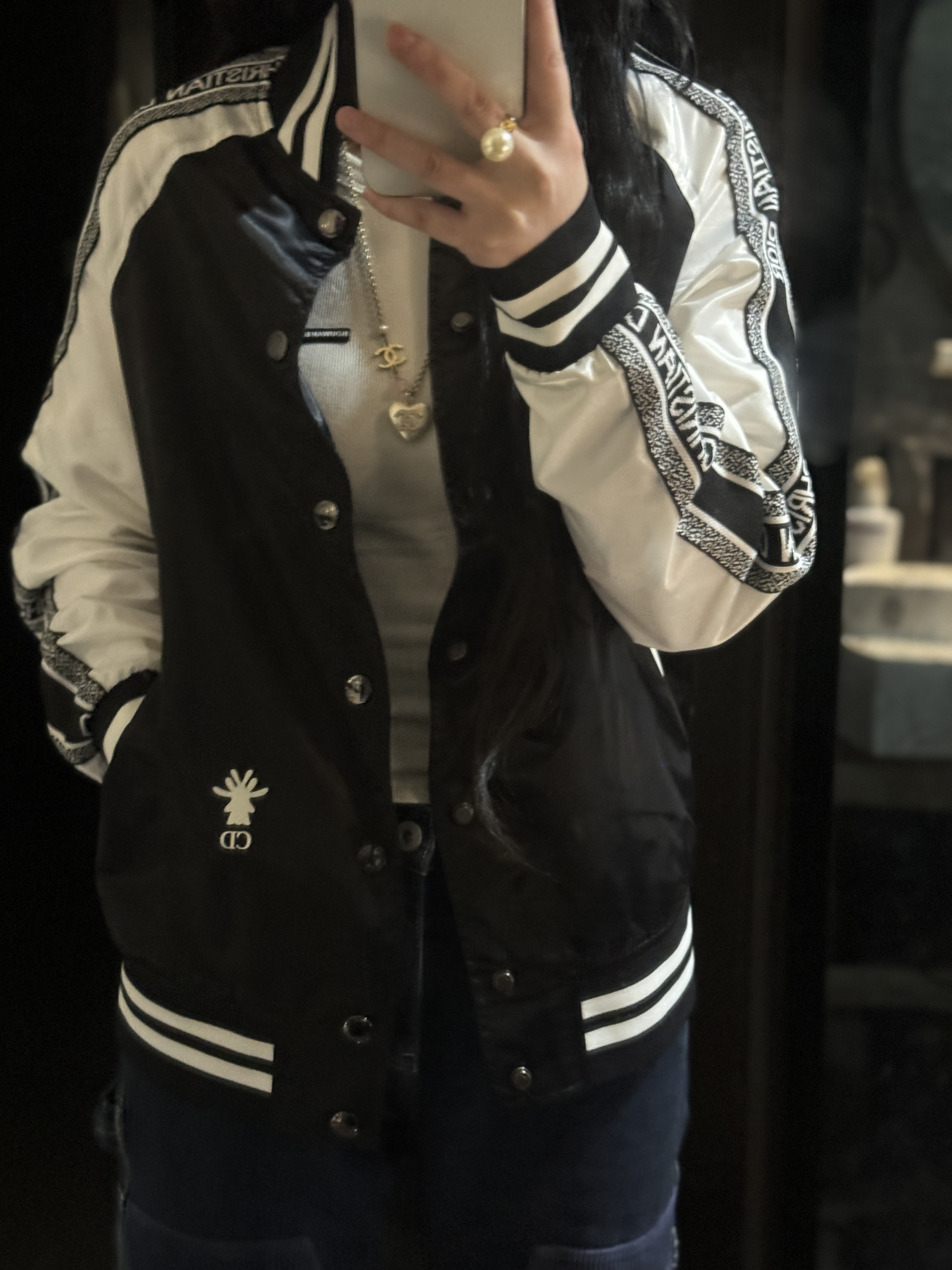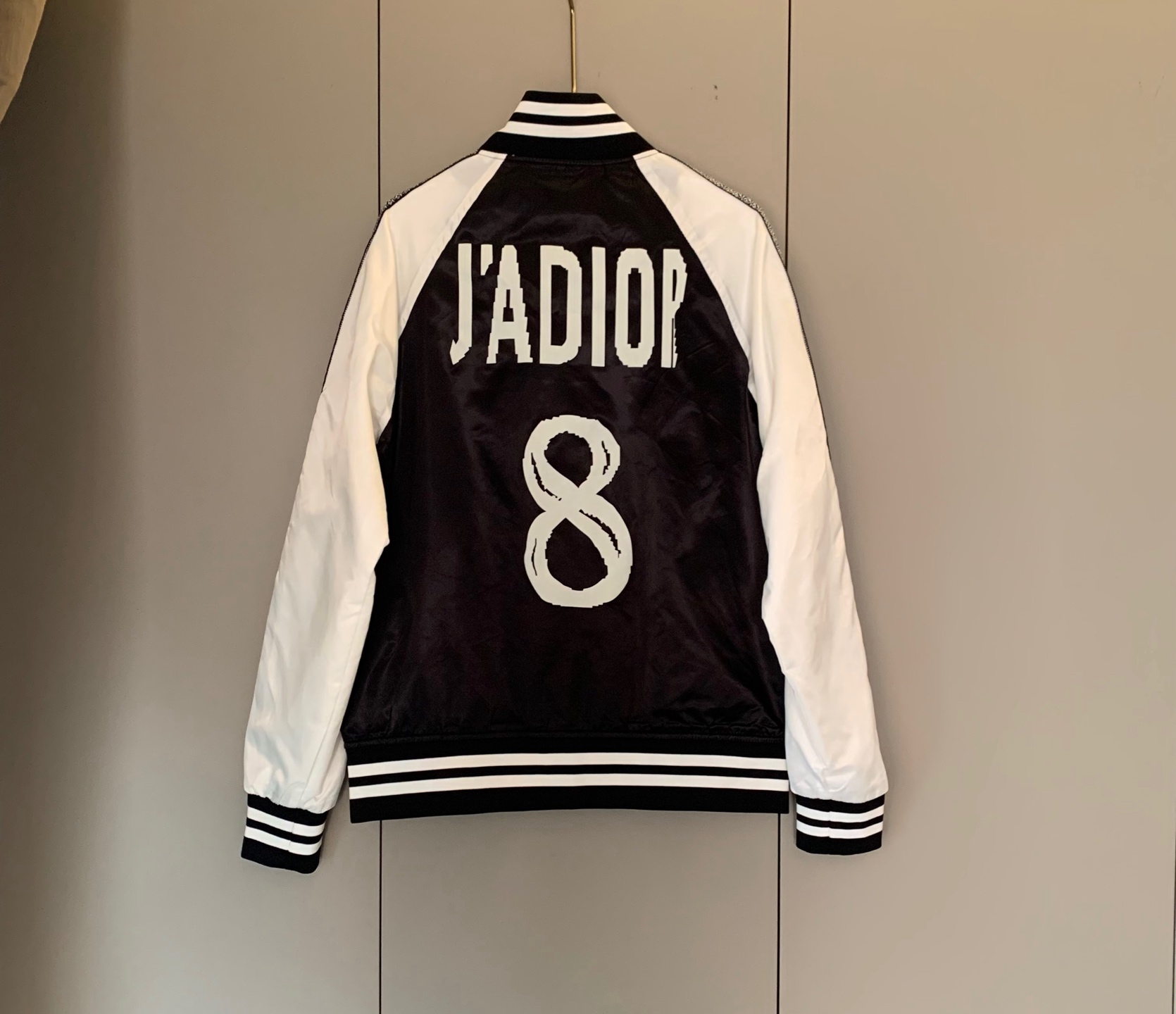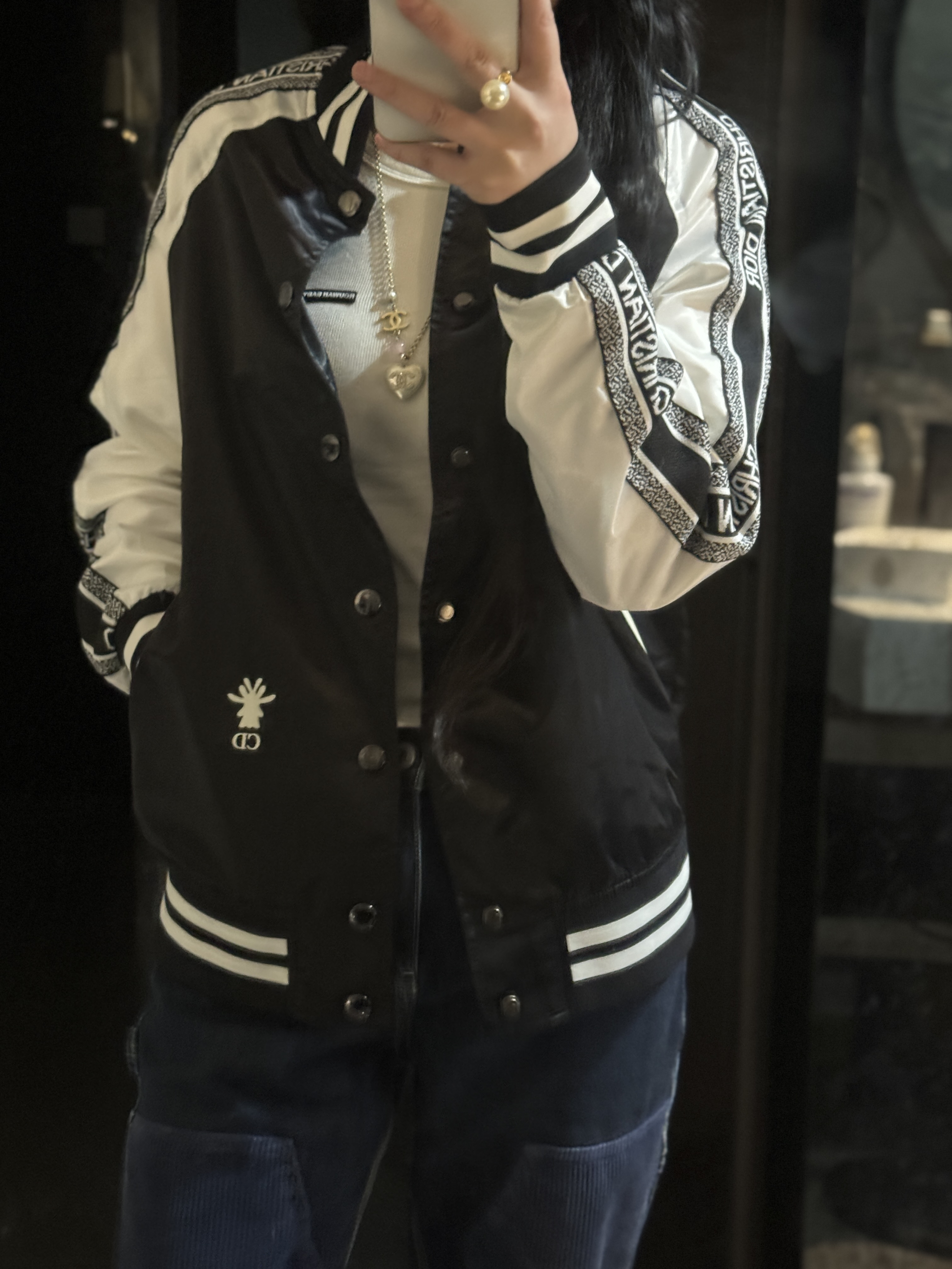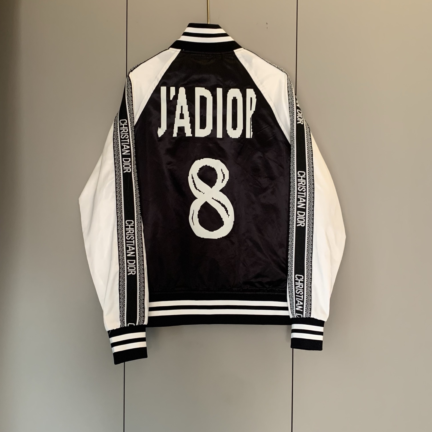 黑白撞色经典到骨子里,“CHRISTIAN DIOR”织带一路从袖身蔓延出品牌辨识度,后背“J'ADIOR 8”的像素印花潮到犯规,还有小蜜蜂印花暗戳戳彰显高定细节配西装,是雅痞贵公子;搭牛仔,是街头潮酷咖;甚至配条连衣裙,都能玩转出甜酷反差感。