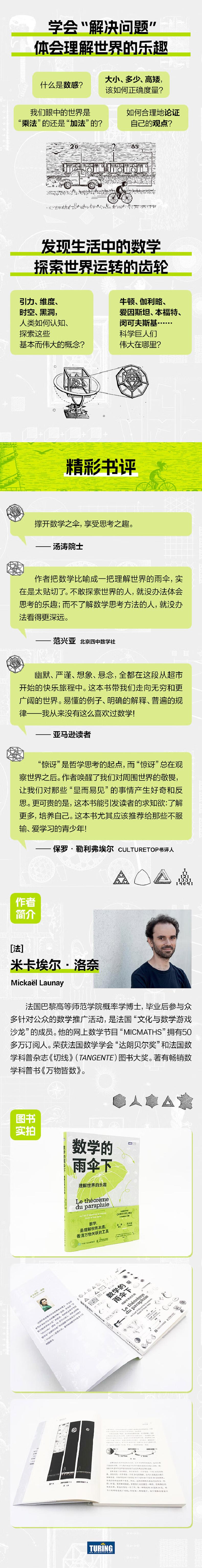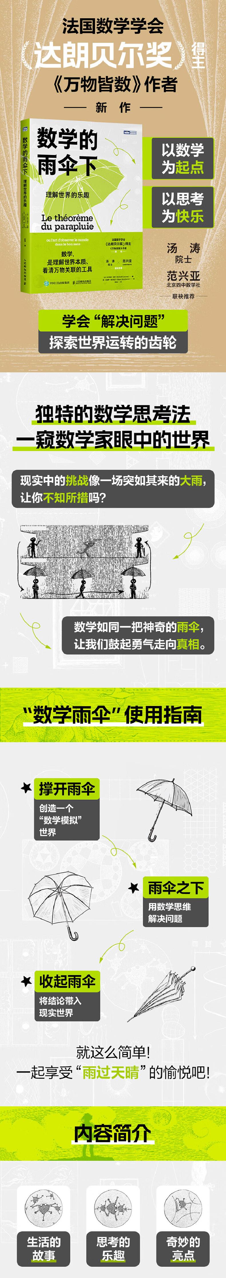 在了解这个世界的过程中,现实经常会挑战我们的感官和直觉,让我们震惊不已。这时,数学就像一把雨伞,当撑开这把雨伞时,我们仿佛进入了一个奇特的境界,有了迈向真相、行走在谜团中的勇气;当收起这把雨伞时,我们会发现自己的认知已大不一样,所谓的“理所应当”和“显而易见”将被摒弃,现实背后隐藏的真相将带来巨大的启发。这就是数学的力量。
