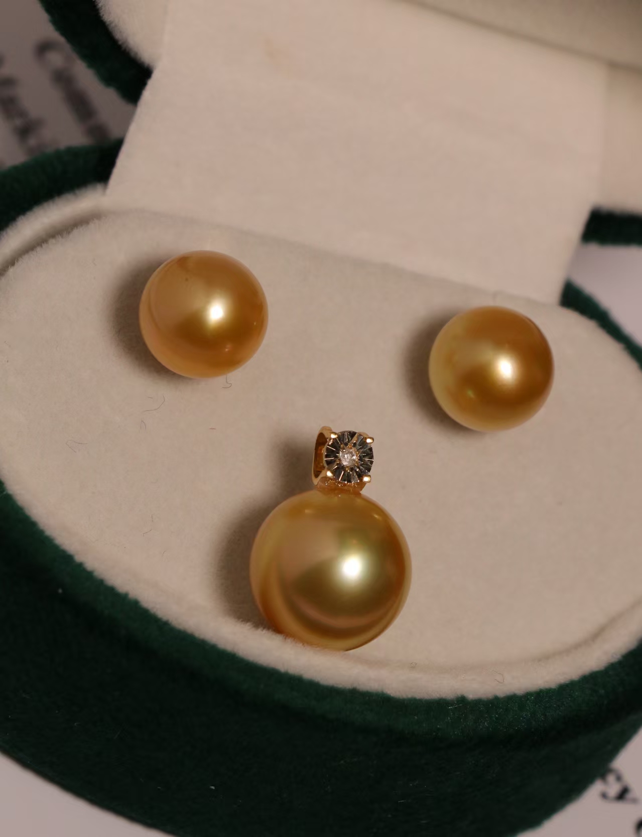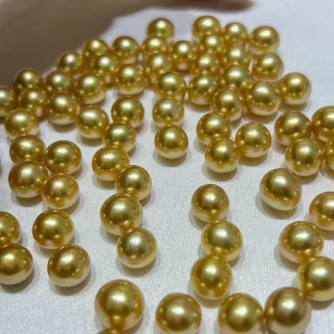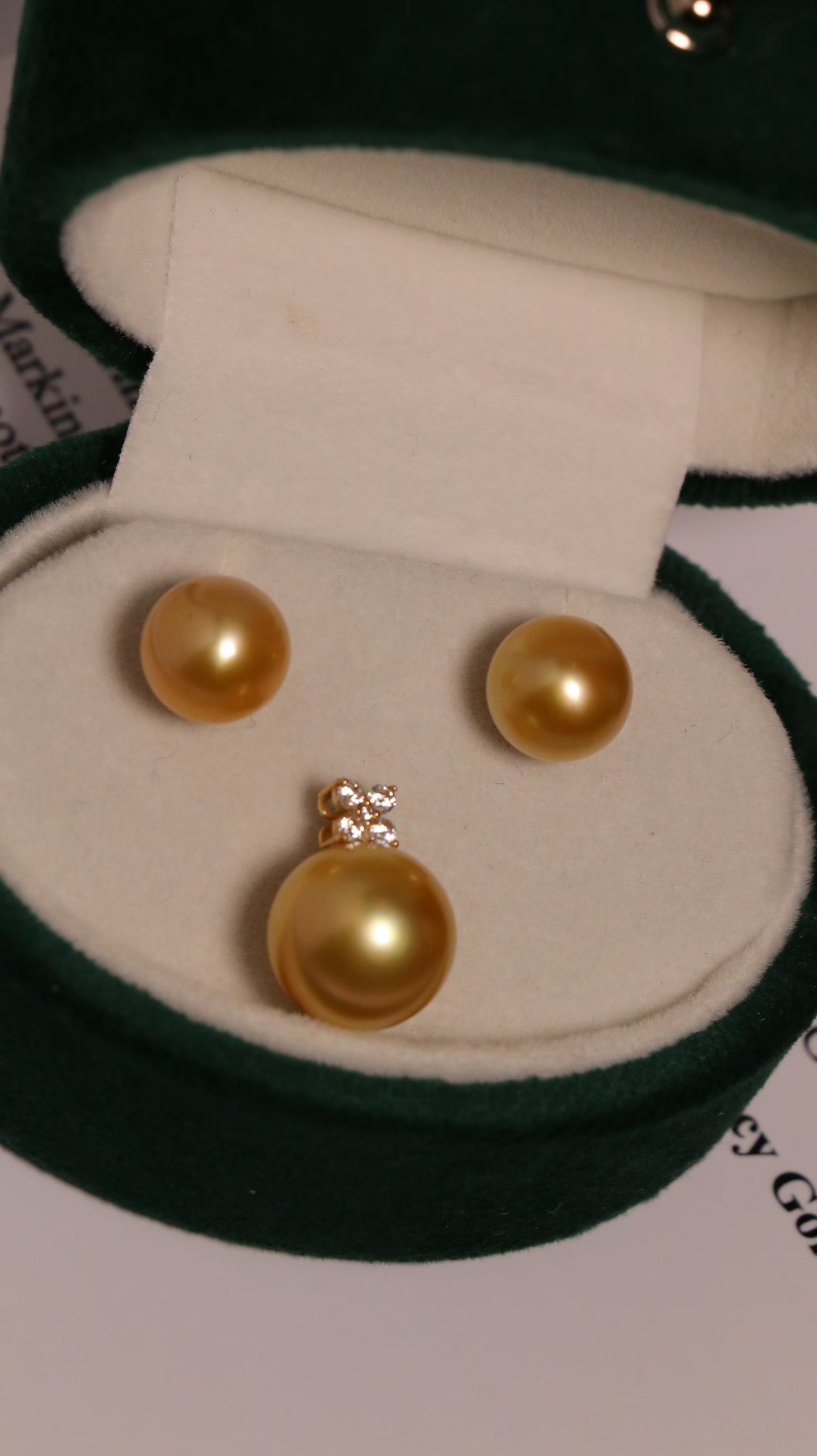 第二款,完美无瑕正圆极强光浓金南洋金珠。18k小钻+切面闪闪的配件,戴妃款风格。