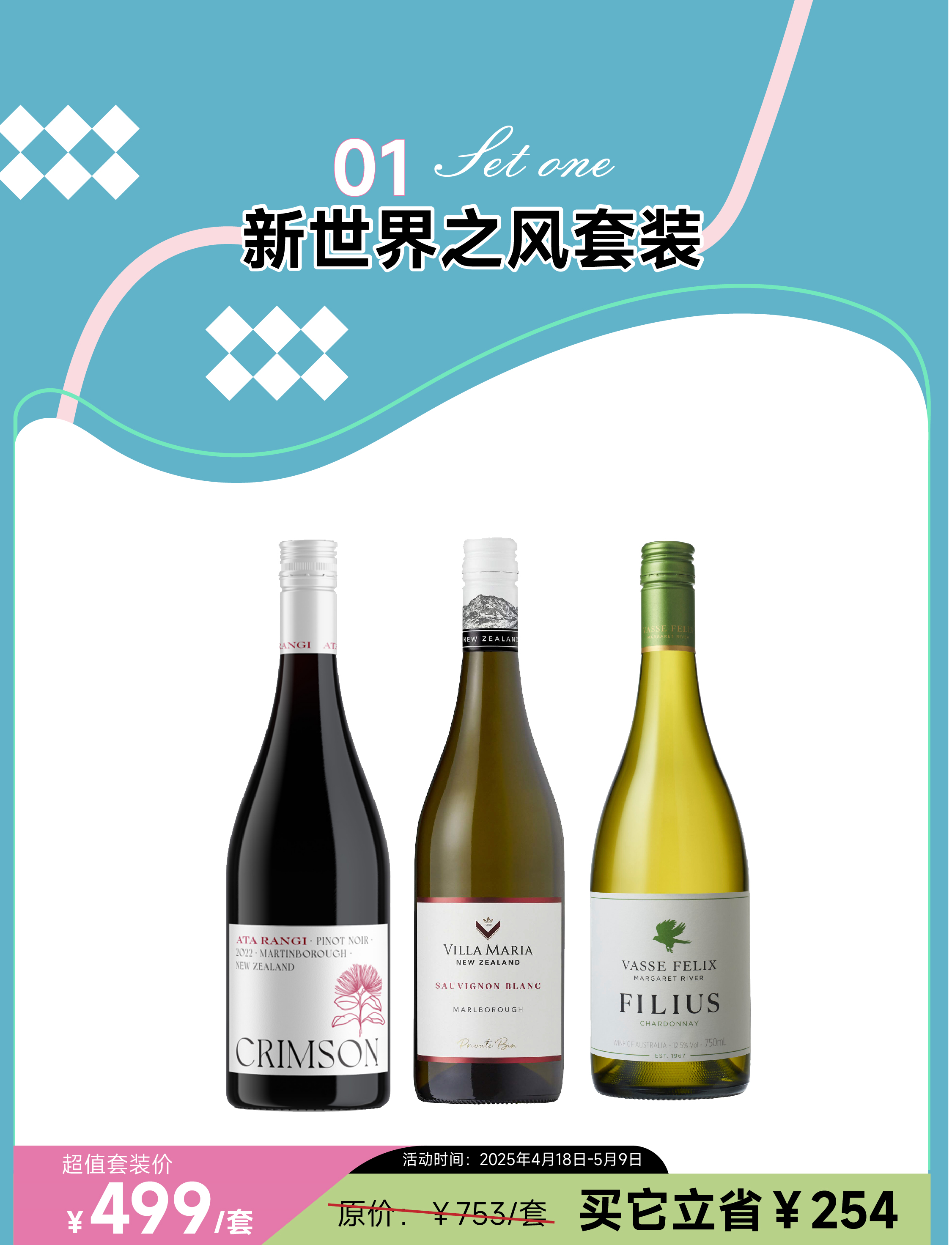 【五一特惠499套装】新天地酒园绯红黑皮诺➕新玛利珍匣长相思➕菲历士菲璐斯霞多丽
