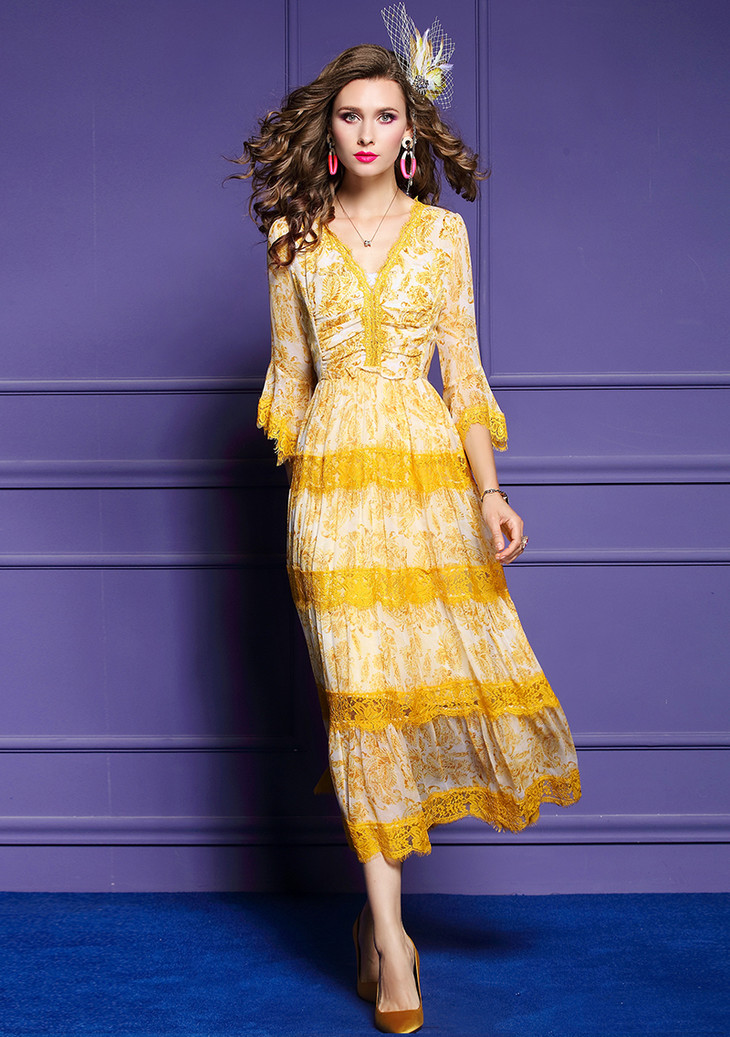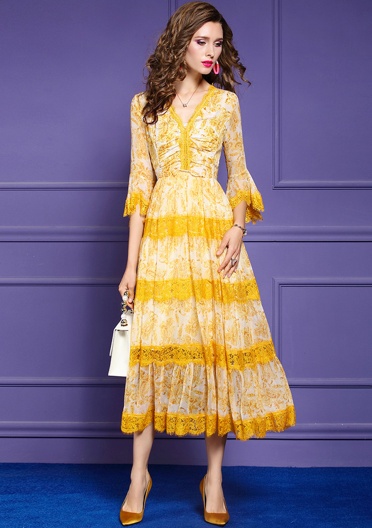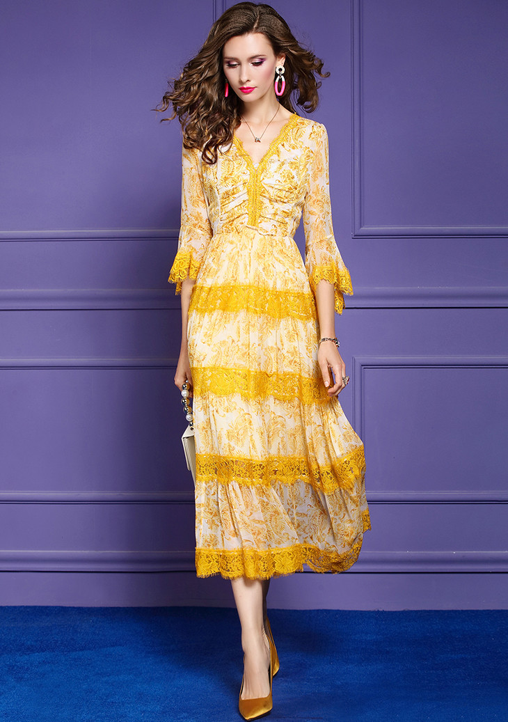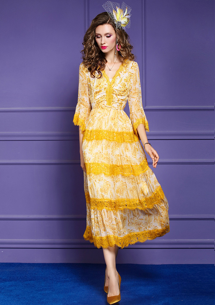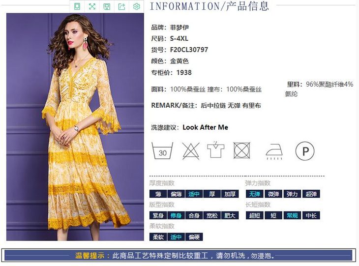 FMY-F20CL30797夏款气质喇叭袖V领修身桑蚕丝真丝连衣裙