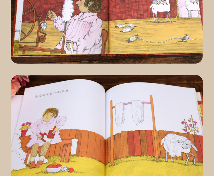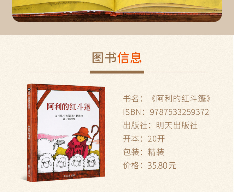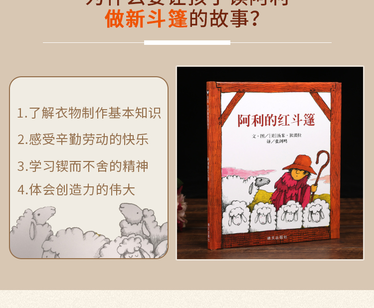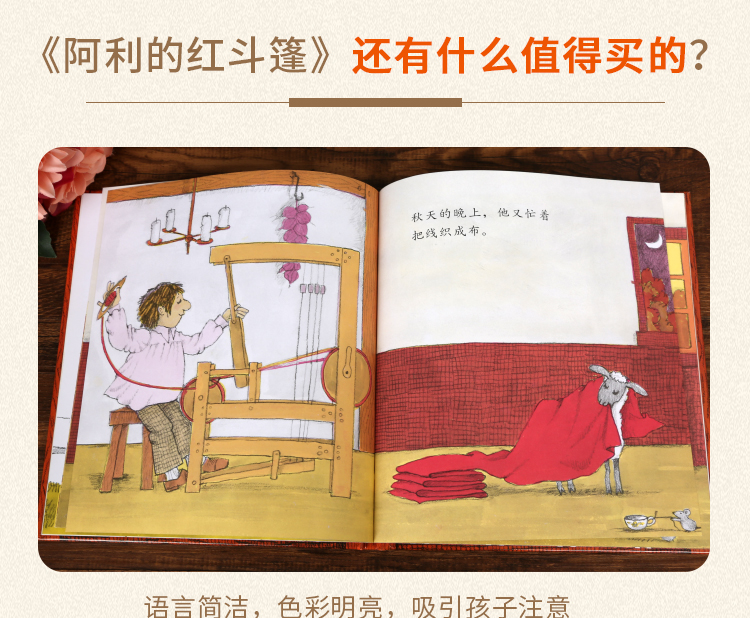 一本经典图画书,故事非常有趣,甚至可以看作是一本知识性的图画书。《信谊世界精选图画书:阿利的红斗篷》以牧羊人阿利为主角,以非常简洁的图文告诉孩子从剪羊毛到制衣服的过程。*后还有图文对照表,来解释每一件工具的名称和它的用途。仔细看,每页图画中还暗示孩子更多的讯息,每读一次都可能有不同的发现!