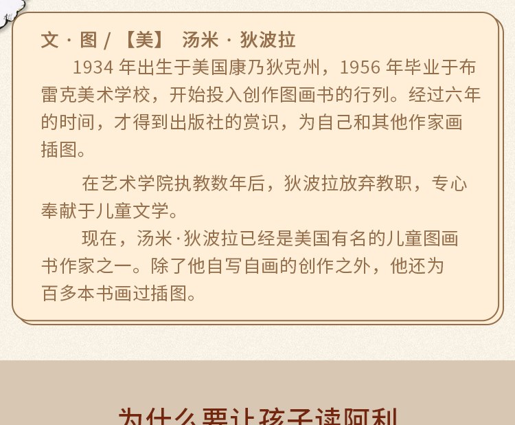 现在,汤米·狄波拉已经是美国*重要的儿童图画书作家之一。除了他自写自画的创作之外,他还为一百多本书画过插图。他的作品常有他以自己的家庭为背景,从自己真情实感的角度出发,描写家人之间的浓密亲情,真切而令人感动。
