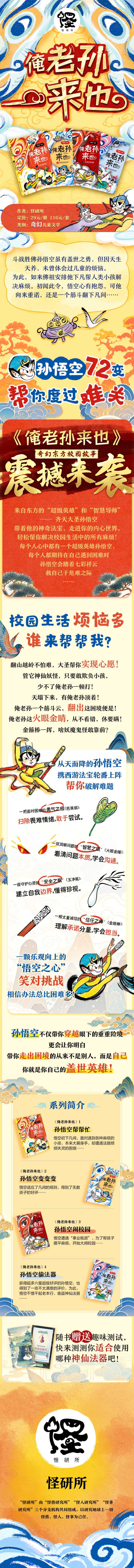 本套书以无所不能的齐天大圣孙悟空为主角,让孩子迷上中国神话英雄人物。专注解决小学生成长问题,让小学生在一个个奇幻故事中获得解决问题的能力。基于《西游记》创作的奇幻校园小说,带孩子领略中国古典名著的传奇魅力。反套路故事,出乎意料的结局,意想不到的转折,给孩子全新的阅读体验!幽默风趣的文笔、通俗易读的文字、短小精悍的故事,实现每天十分中轻松阅读。