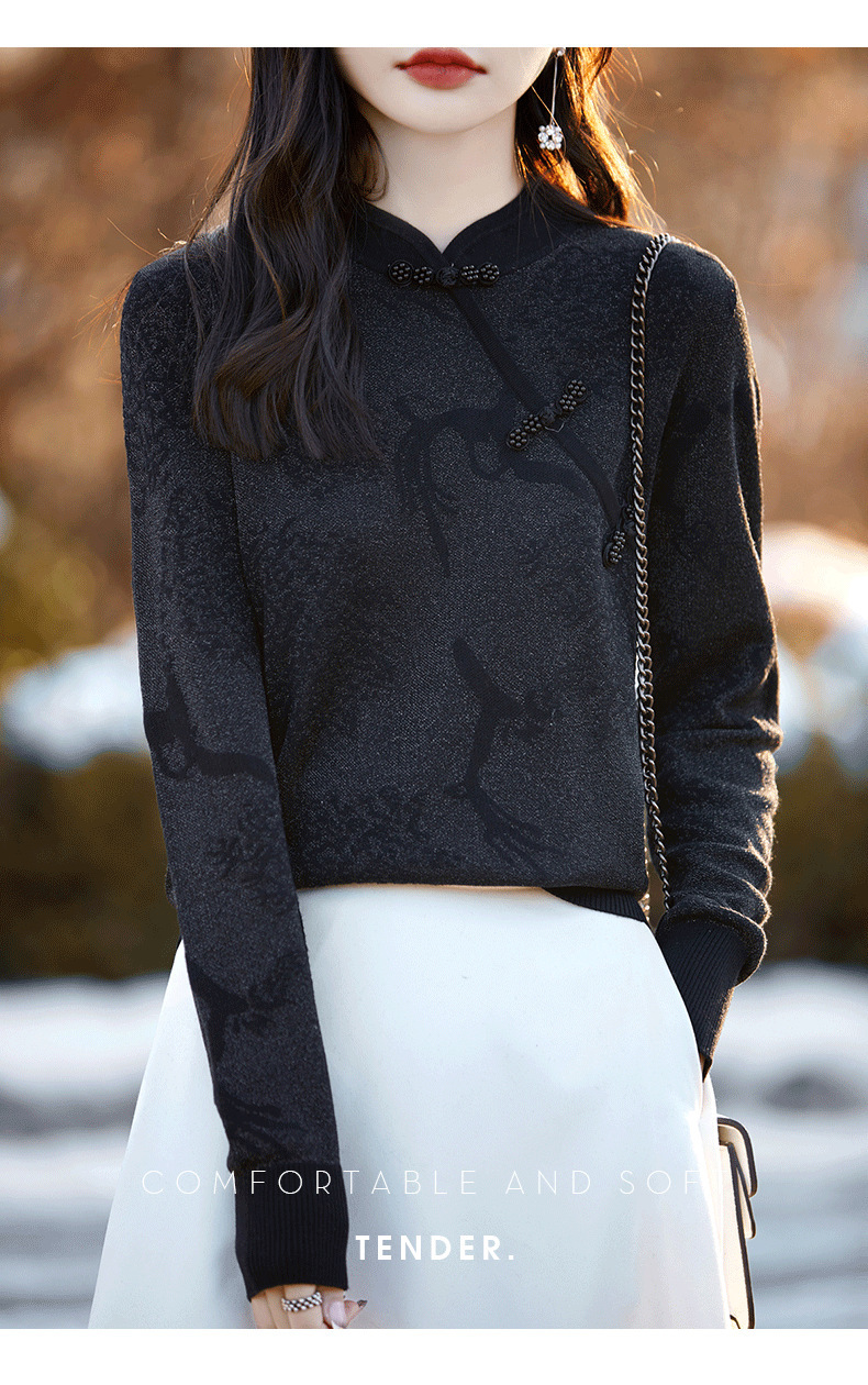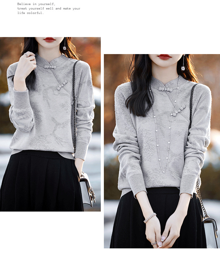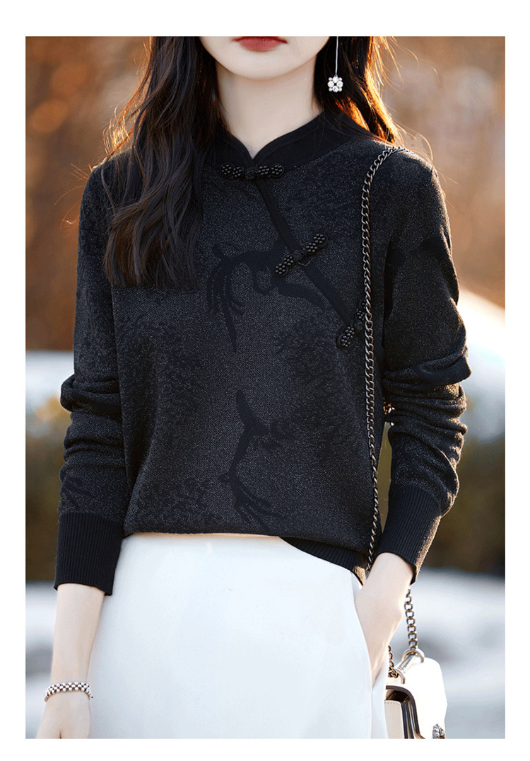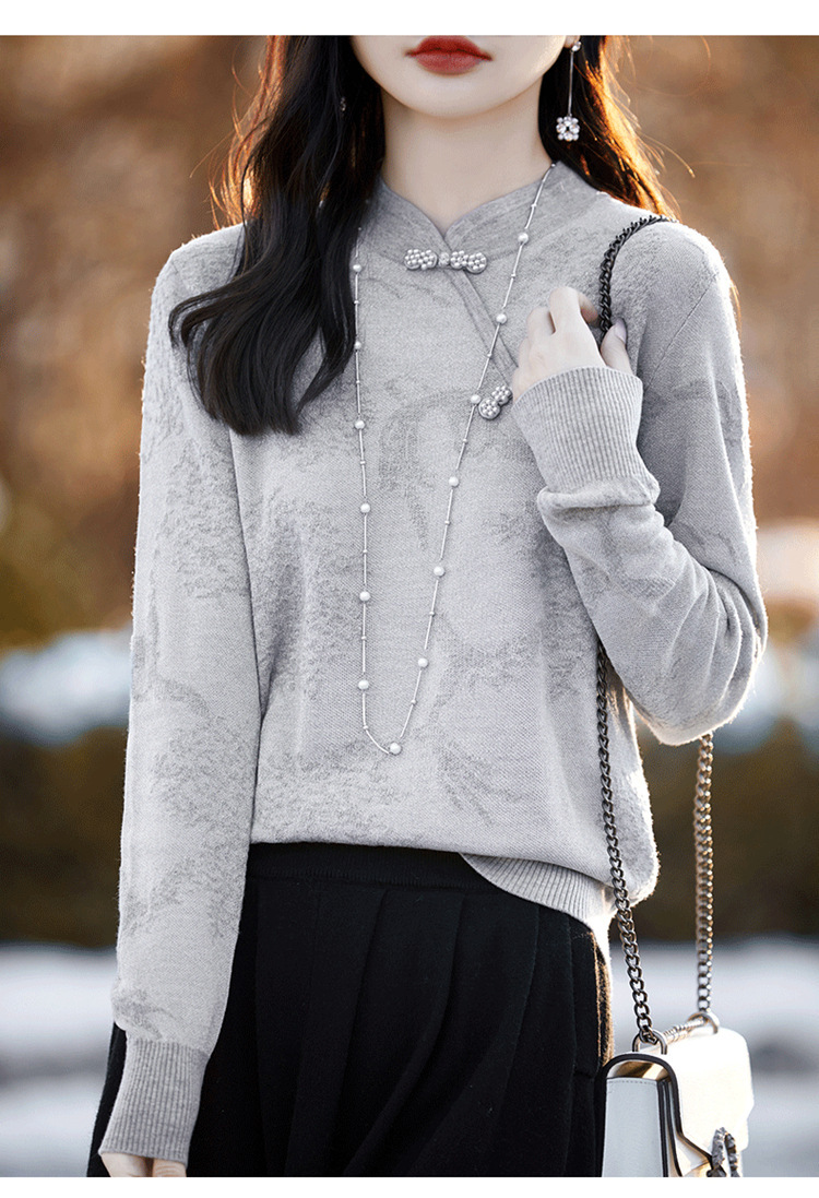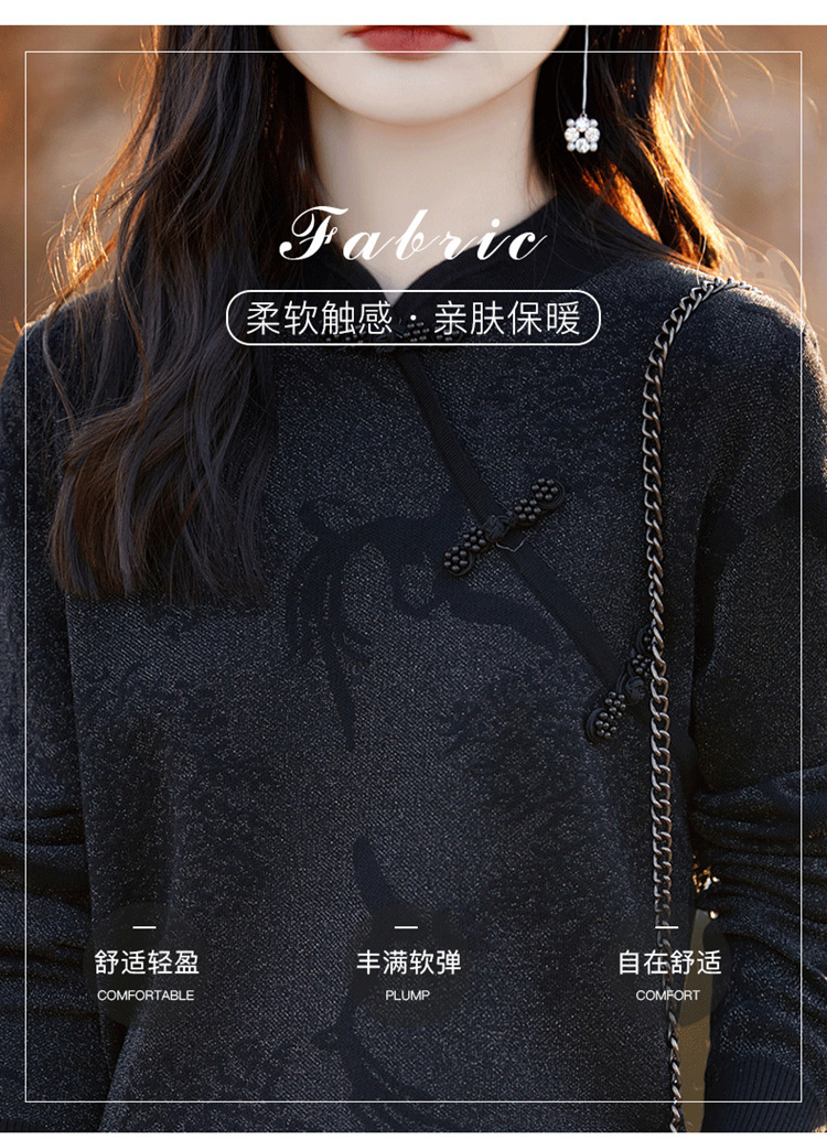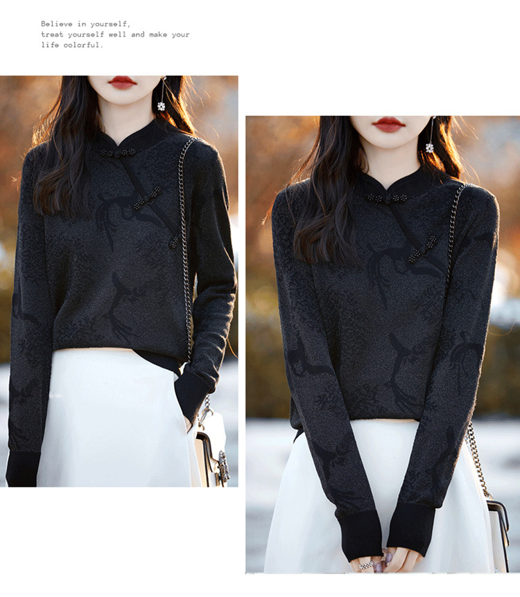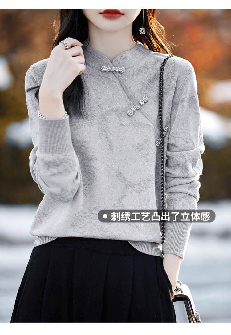 秋冬提花上衣,宽松新中式旗袍立领羊毛针织衫女复古针织打底衫毛衣QH-NS3181
