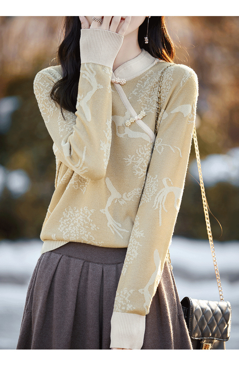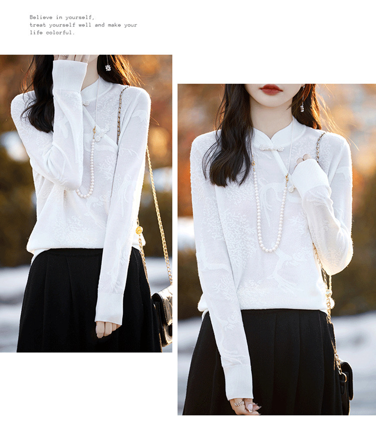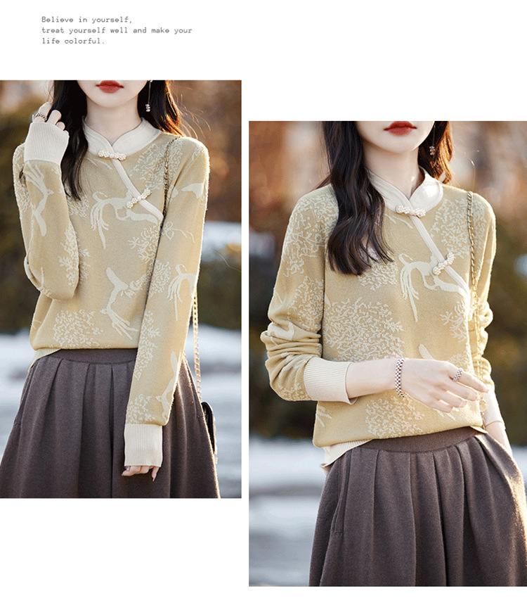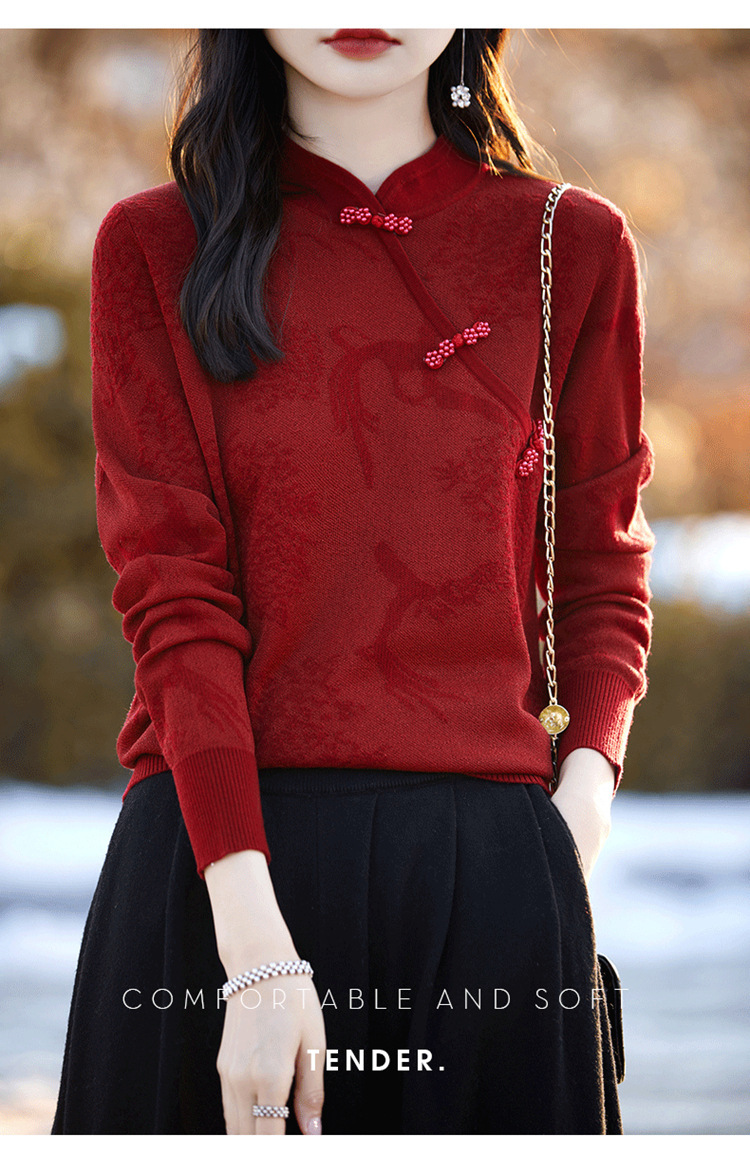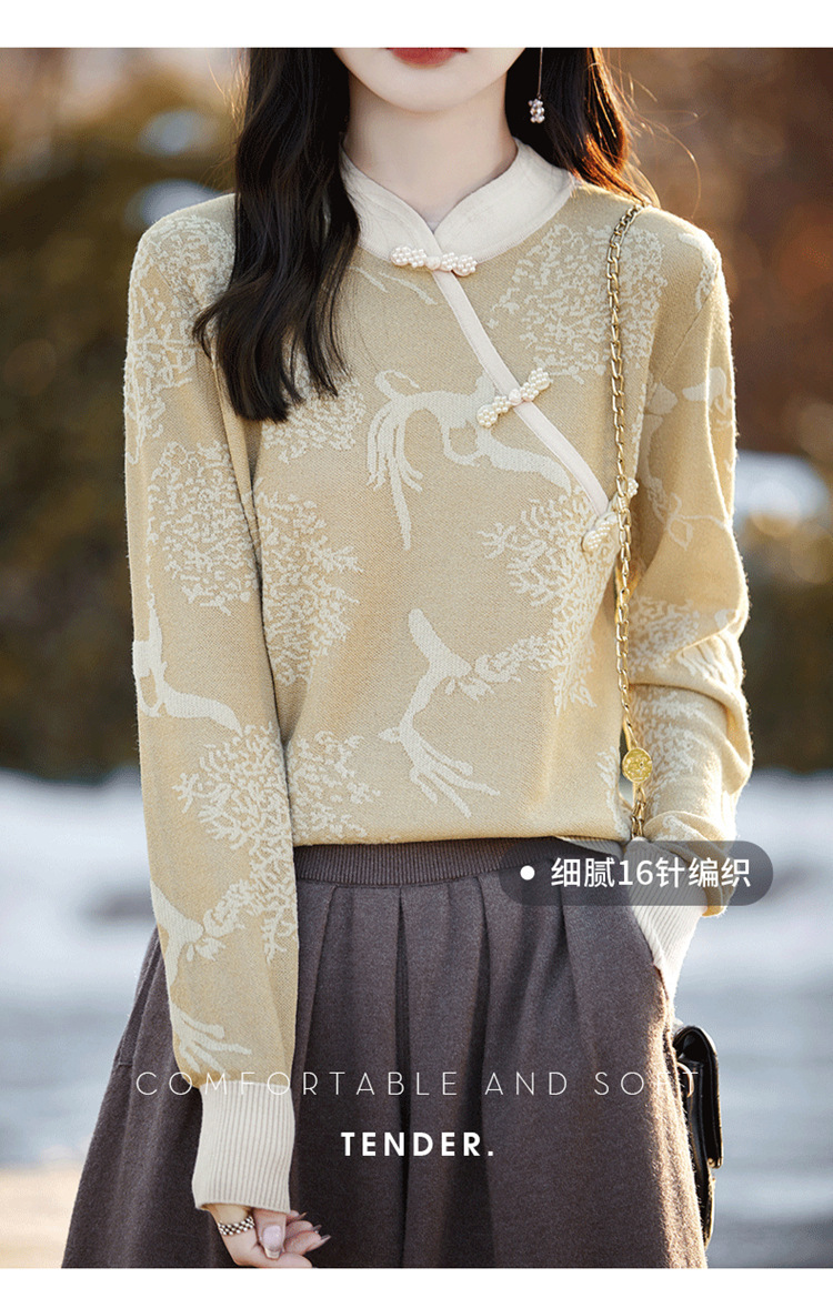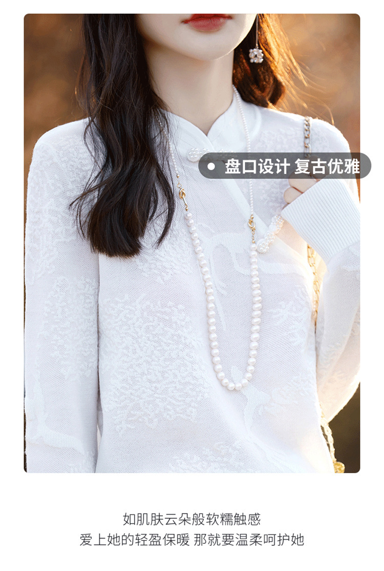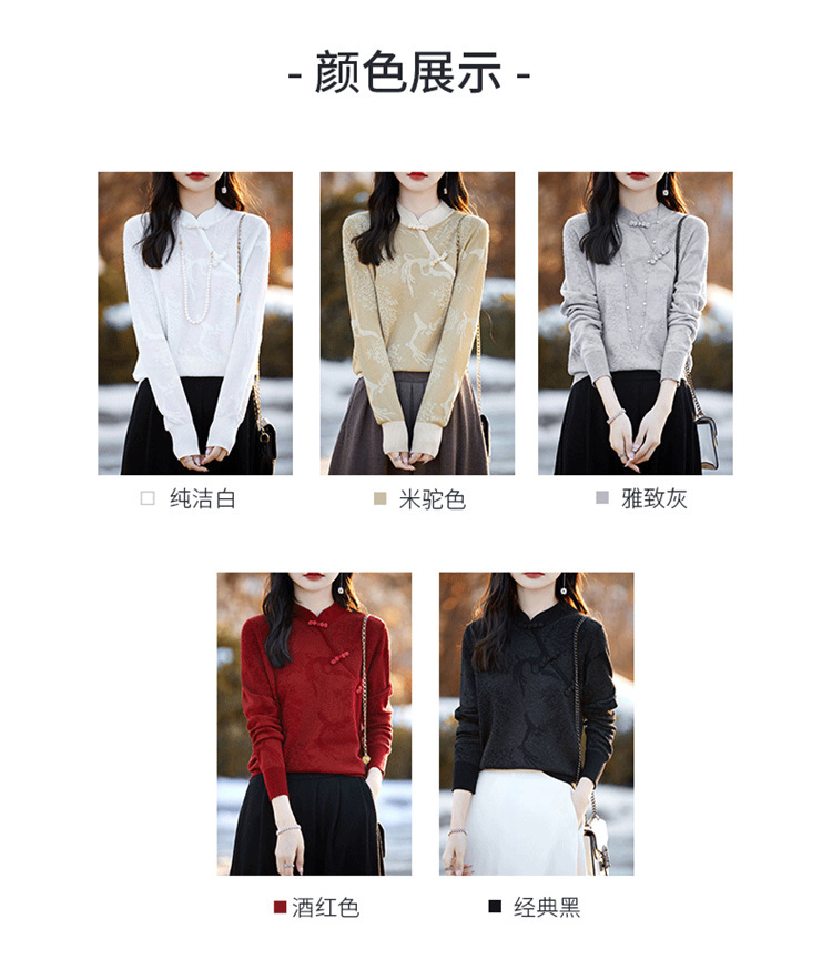 秋冬提花上衣,宽松新中式旗袍立领羊毛针织衫女复古针织打底衫毛衣QH-NS3181