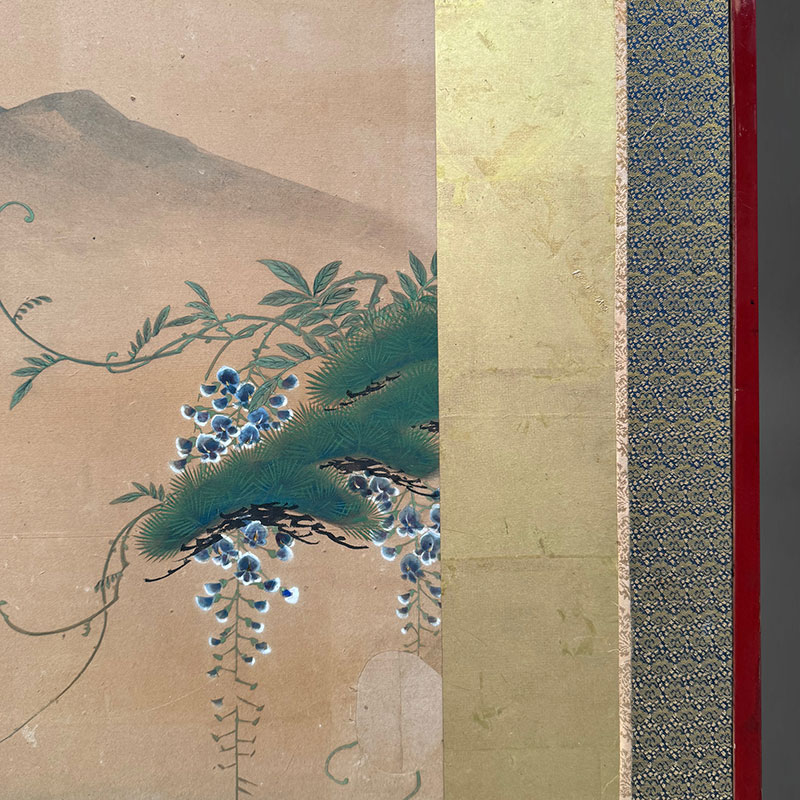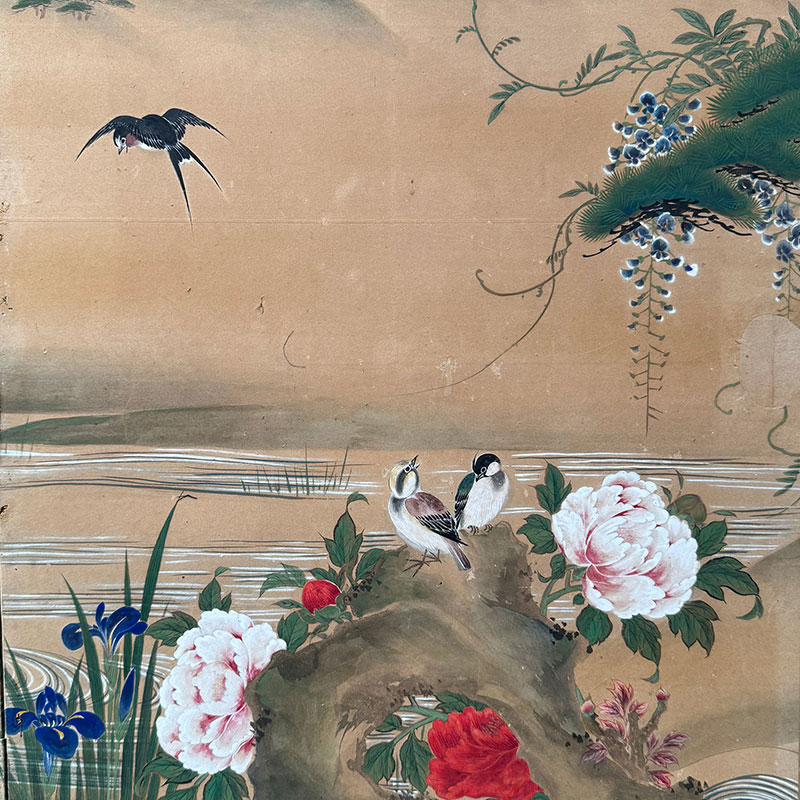 19世纪日本明治时期出品「湖畔花间鹭鸟」主题纸本设色双曲屏风