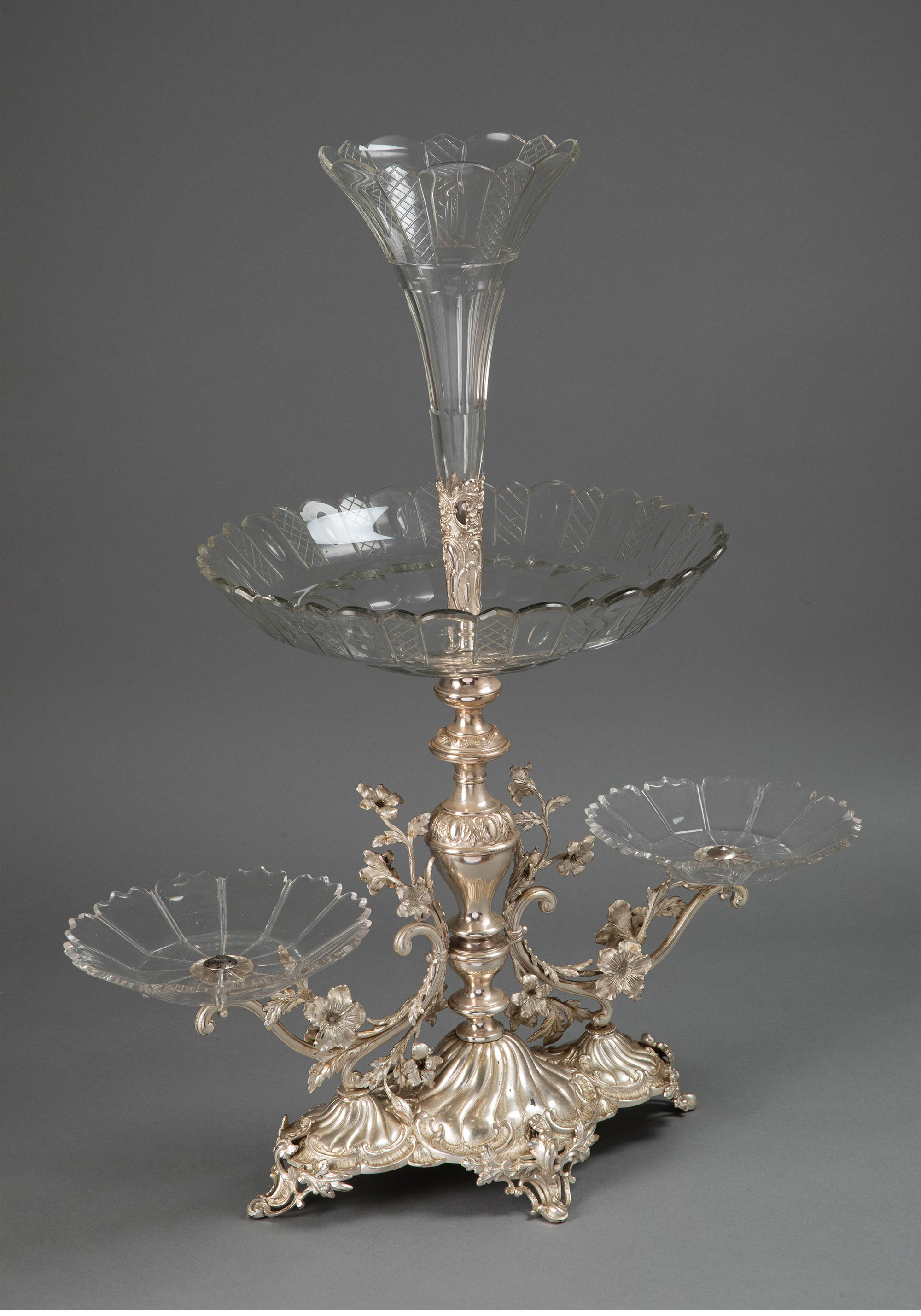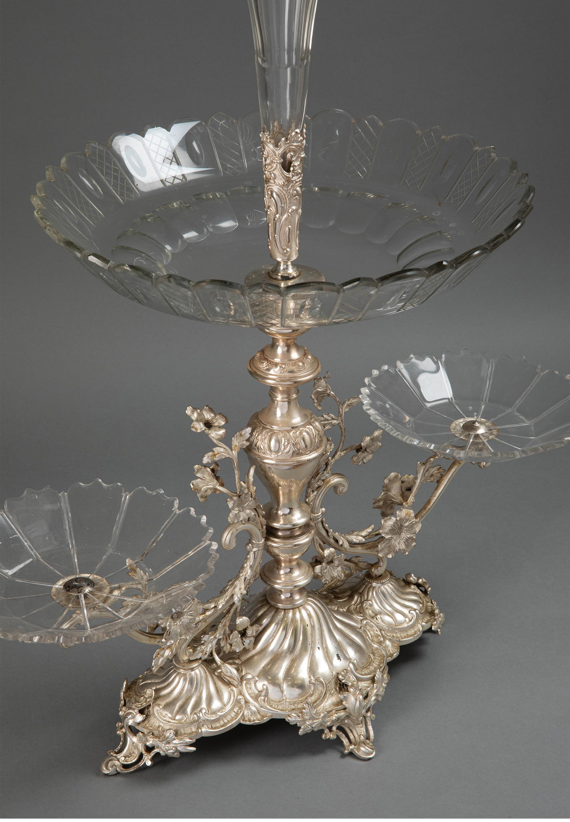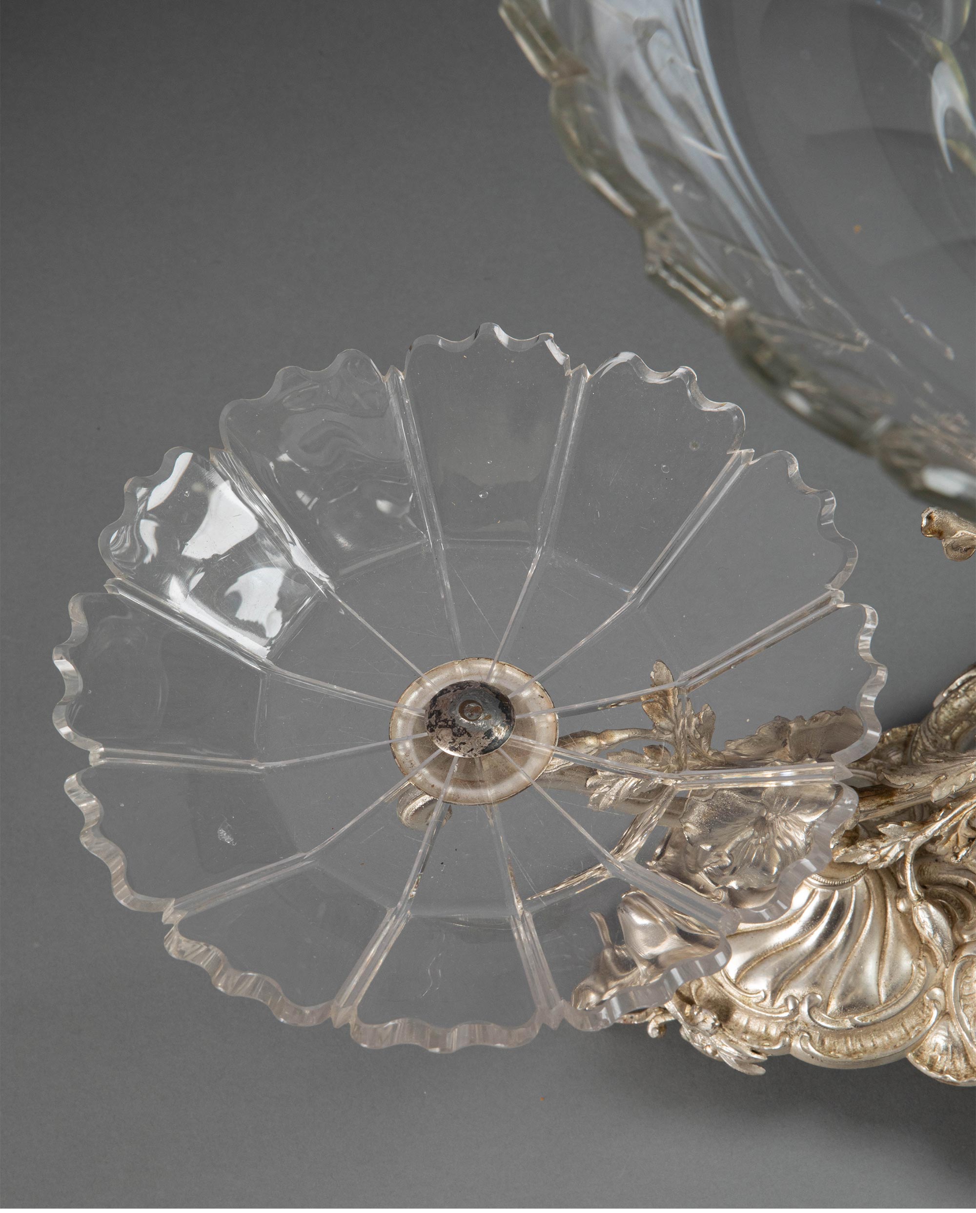 19世纪法国出品洛可可风格古典花叶主题镀银精雕装饰水晶托盘马蹄莲造型中央摆件