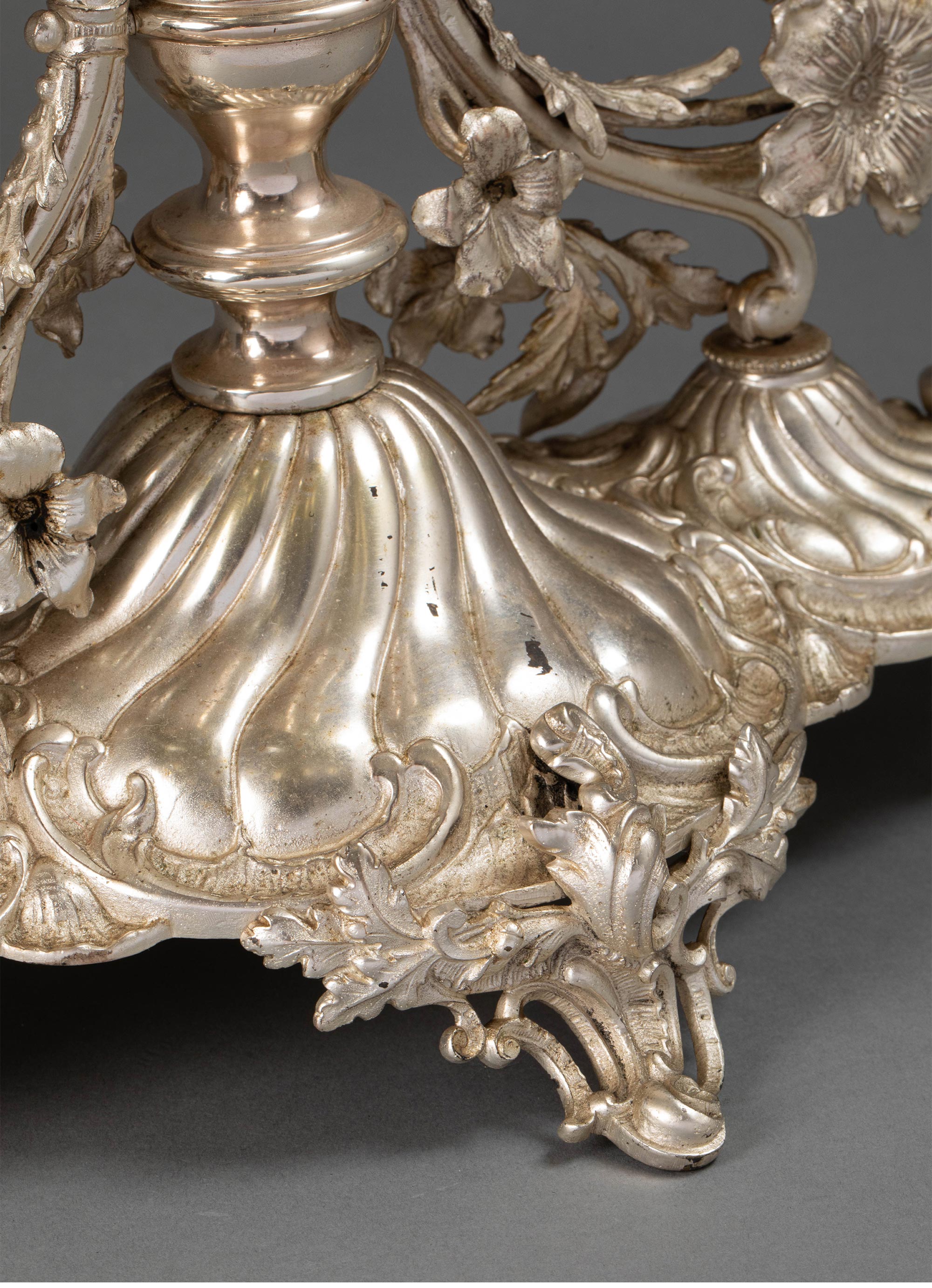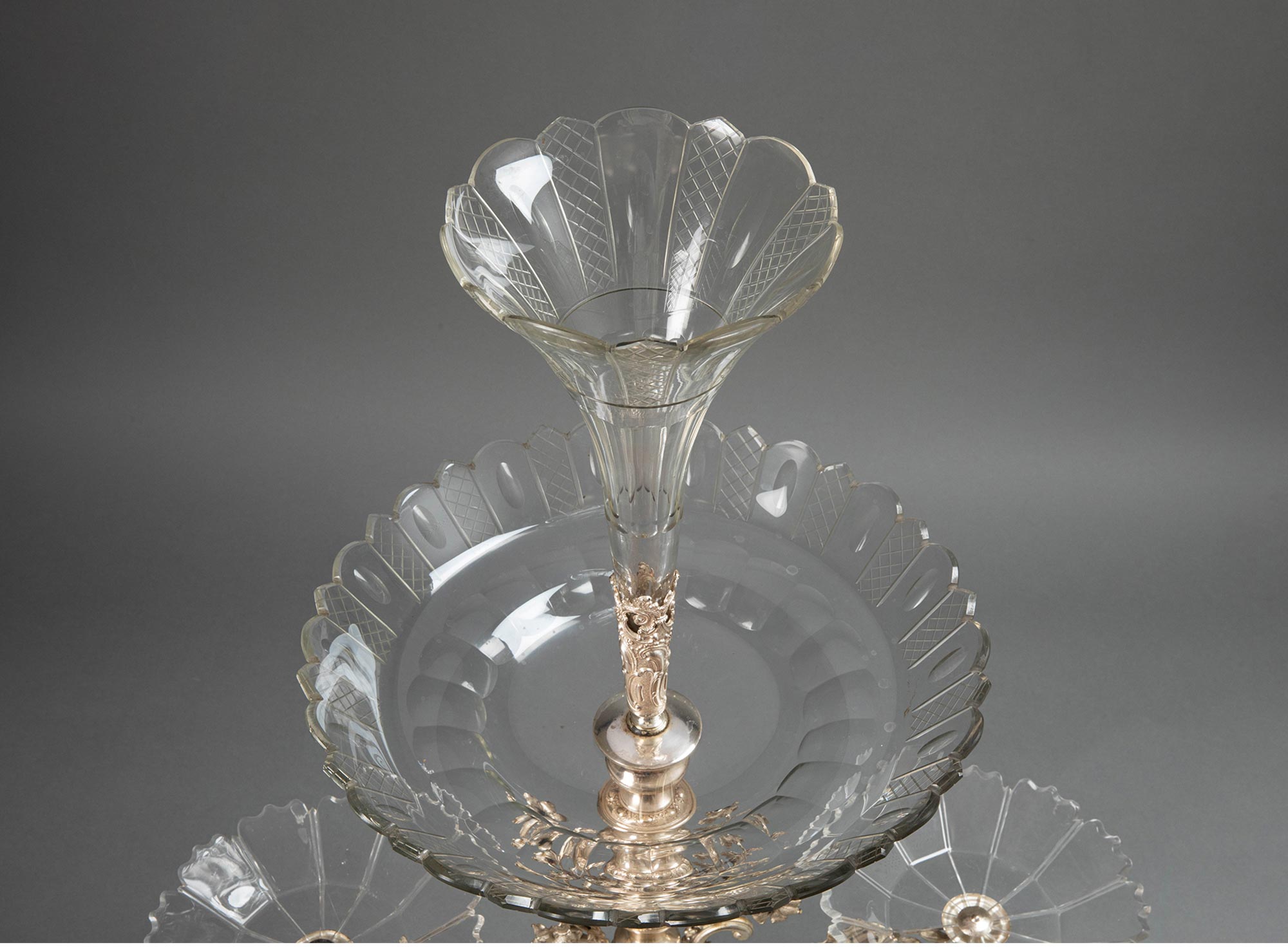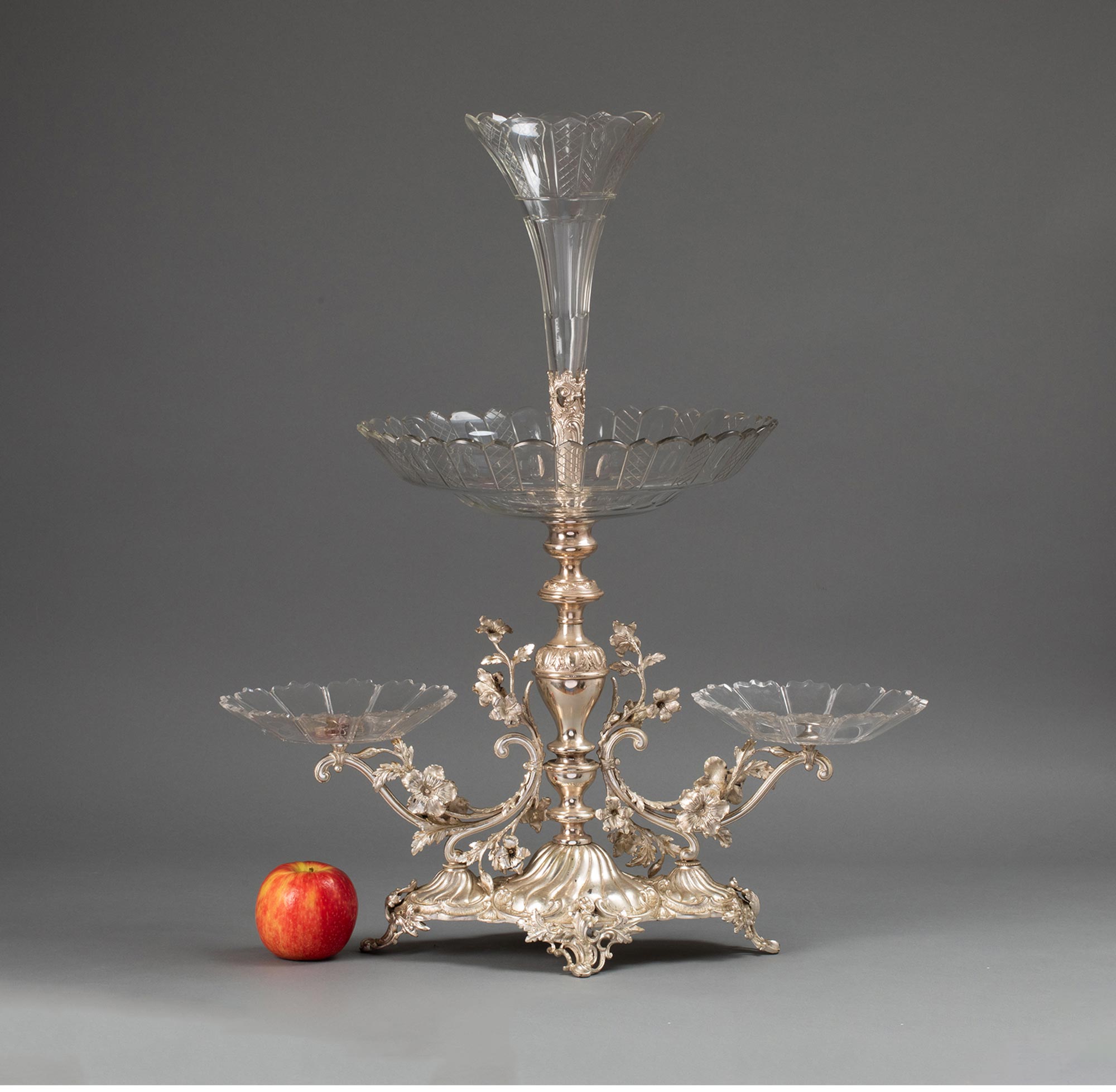 19世纪法国出品洛可可风格古典花叶主题镀银精雕装饰水晶托盘马蹄莲造型中央摆件