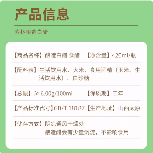 420ml 紫林 6°酿造白醋食醋 家用瓶装 炒菜凉拌腌制泡菜厨房调味品食用醋