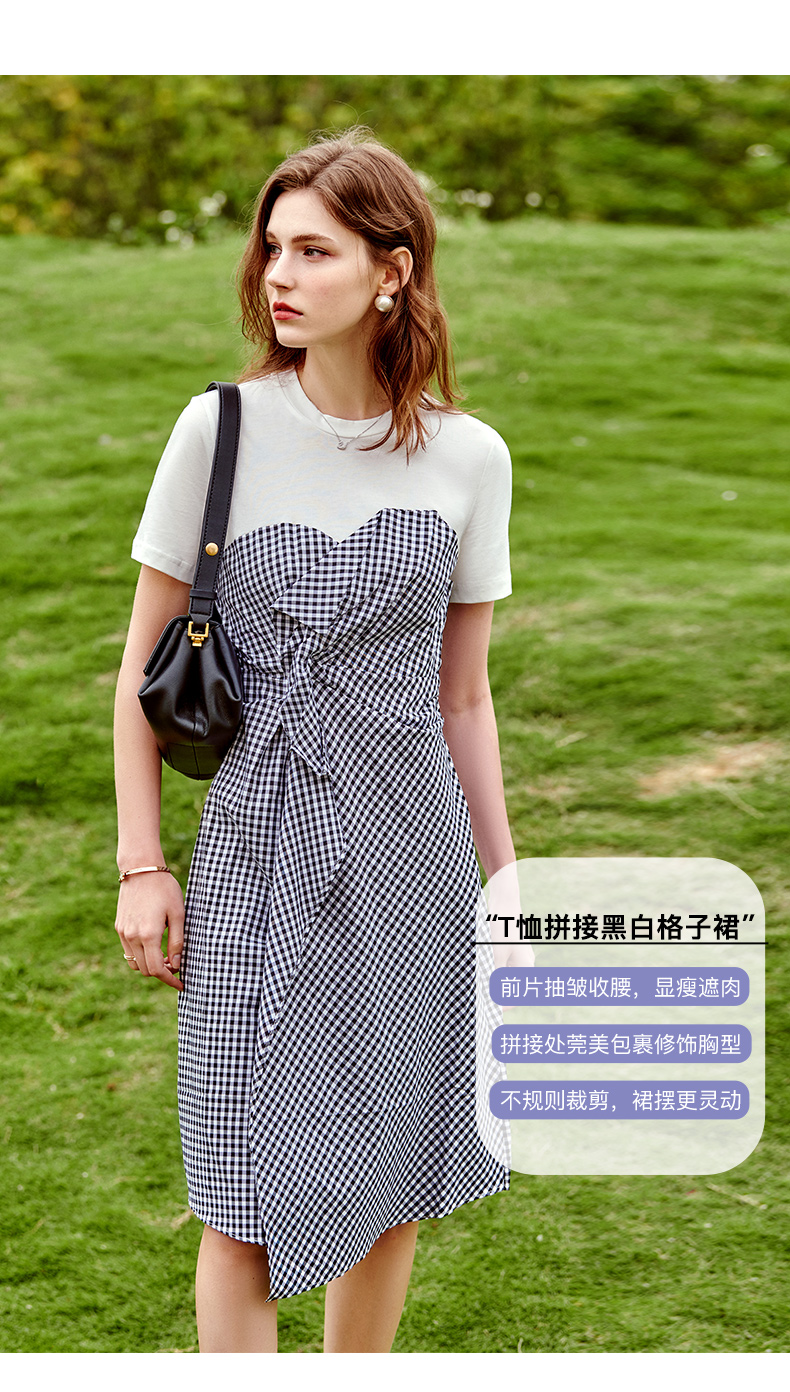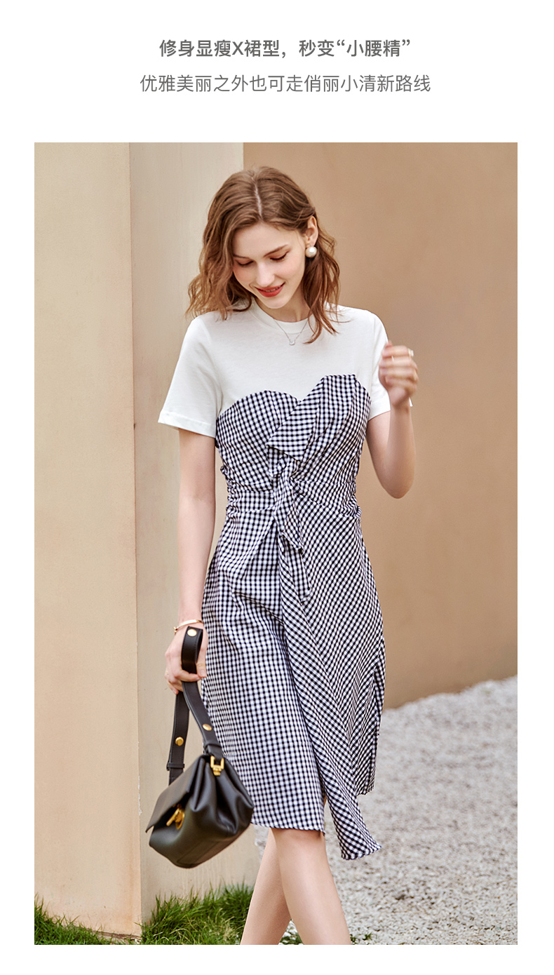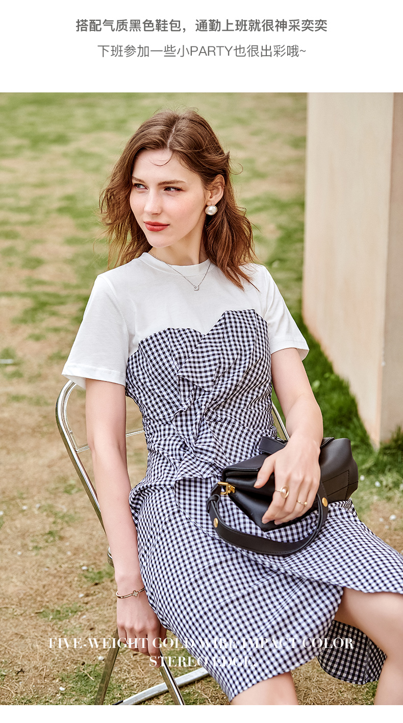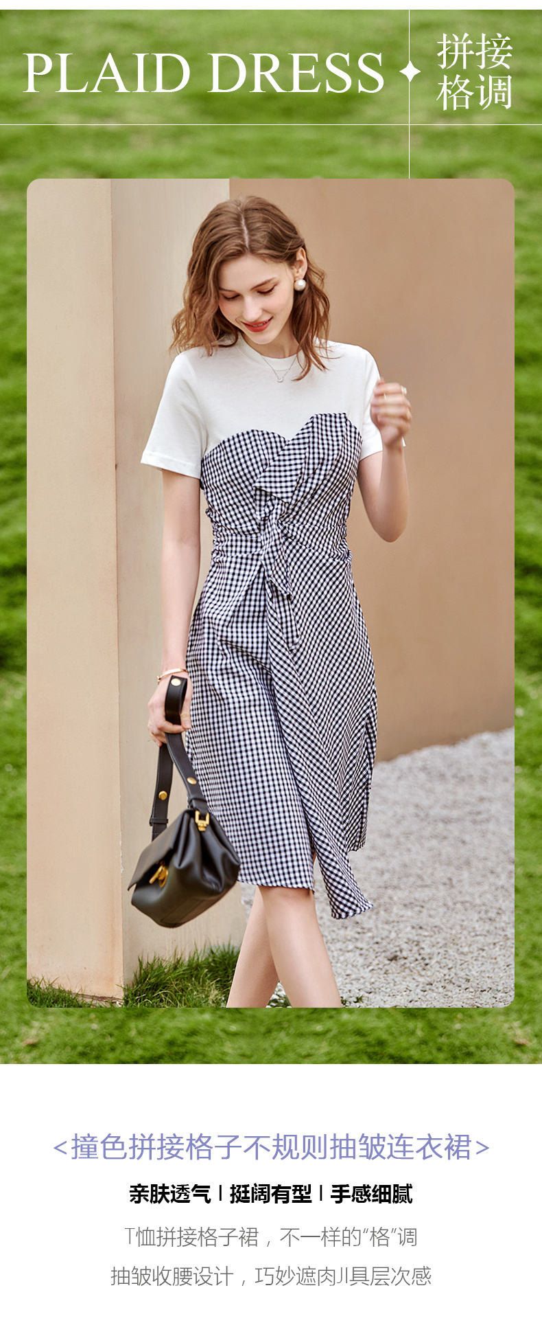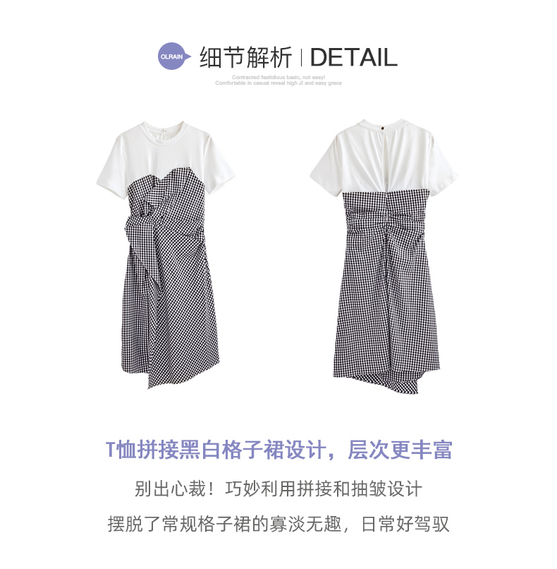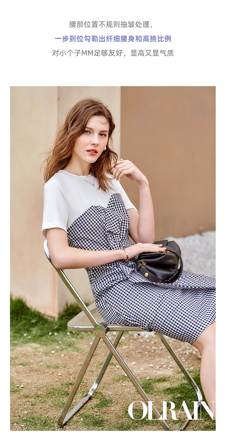 欧芮儿格子连衣裙女2021新款收腰显瘦撞色拼接不规则抽皱裙子