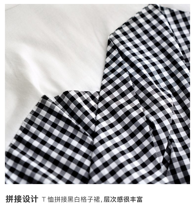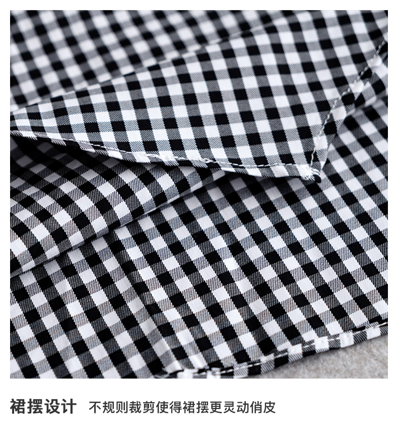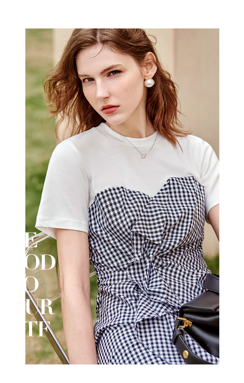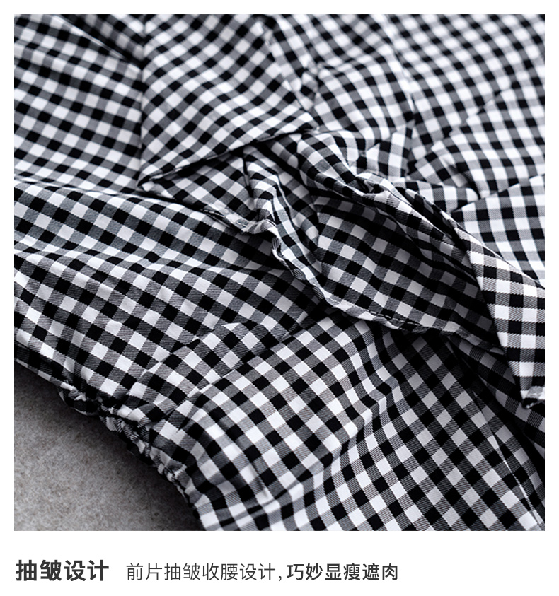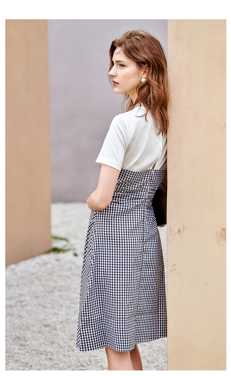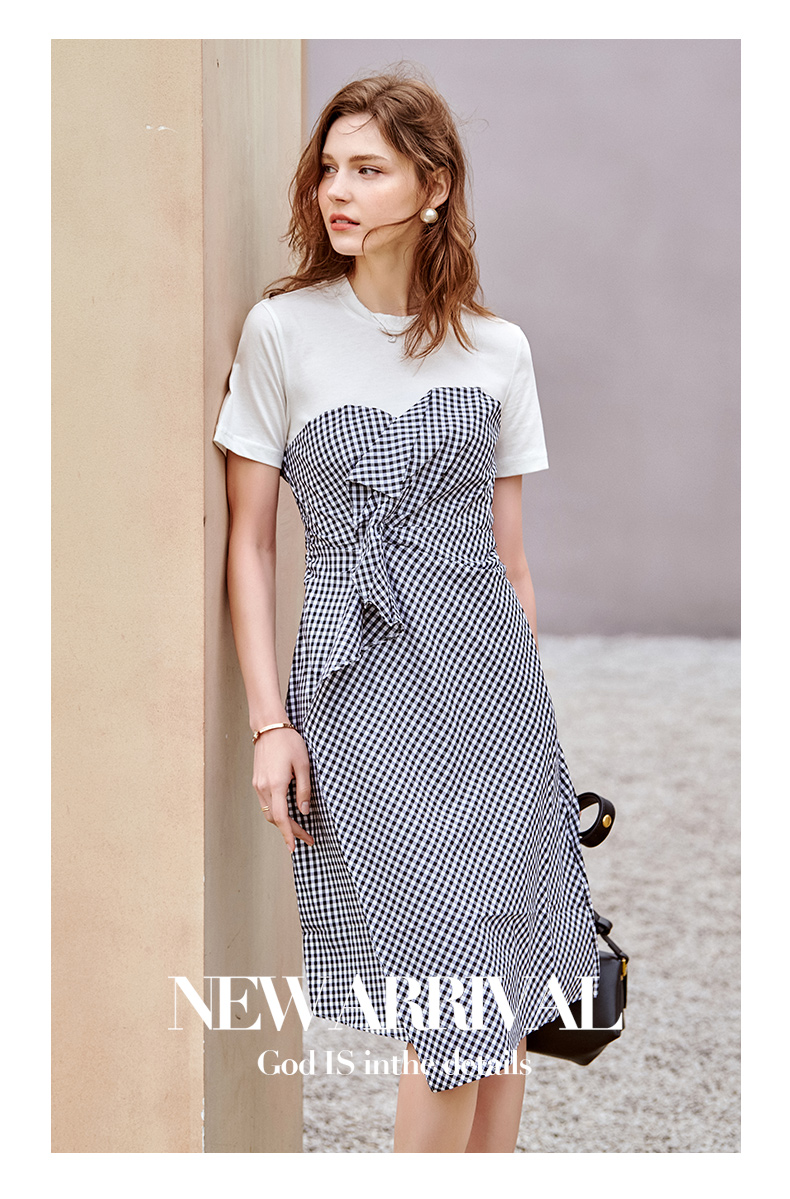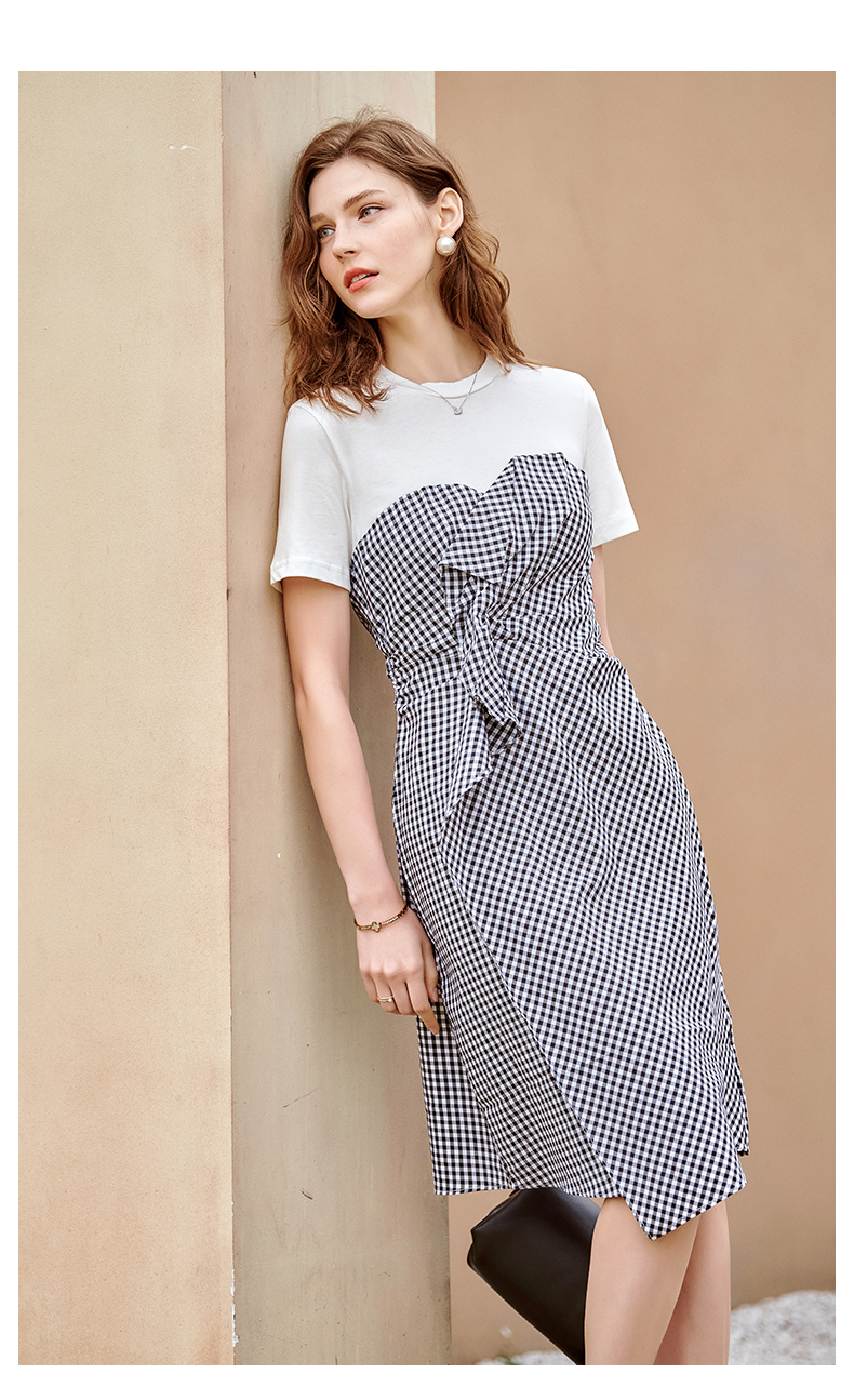 欧芮儿格子连衣裙女2021新款收腰显瘦撞色拼接不规则抽皱裙子