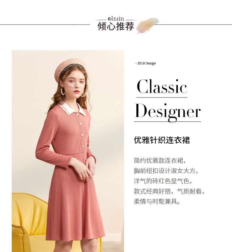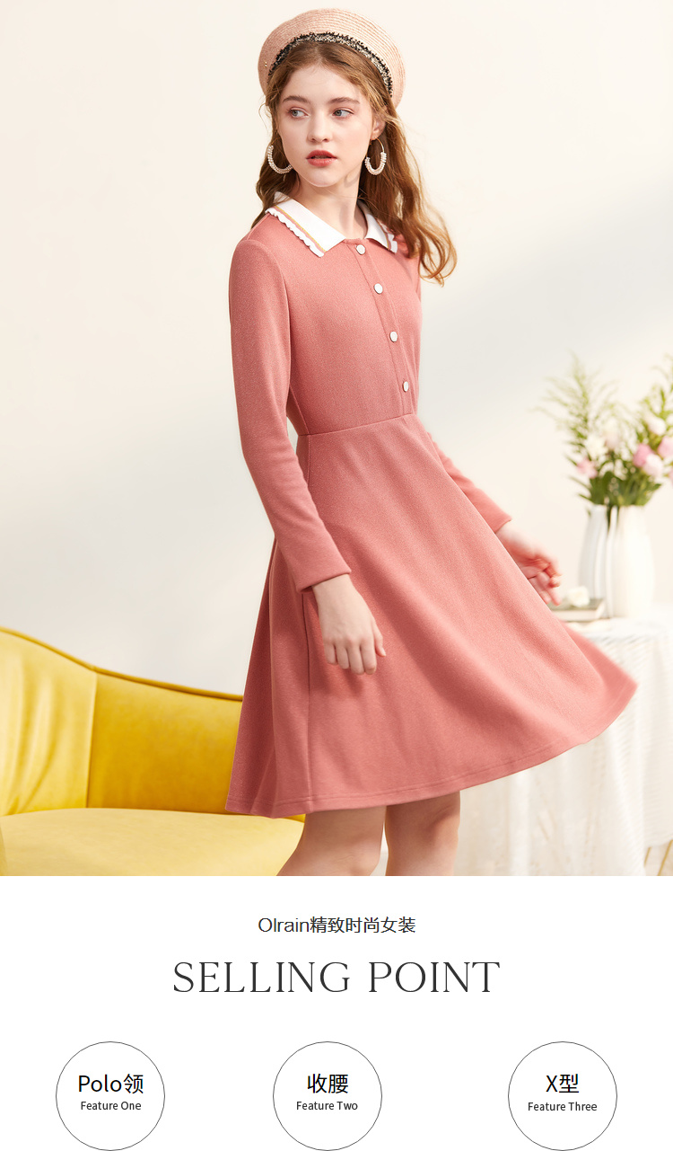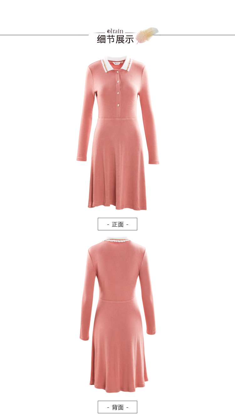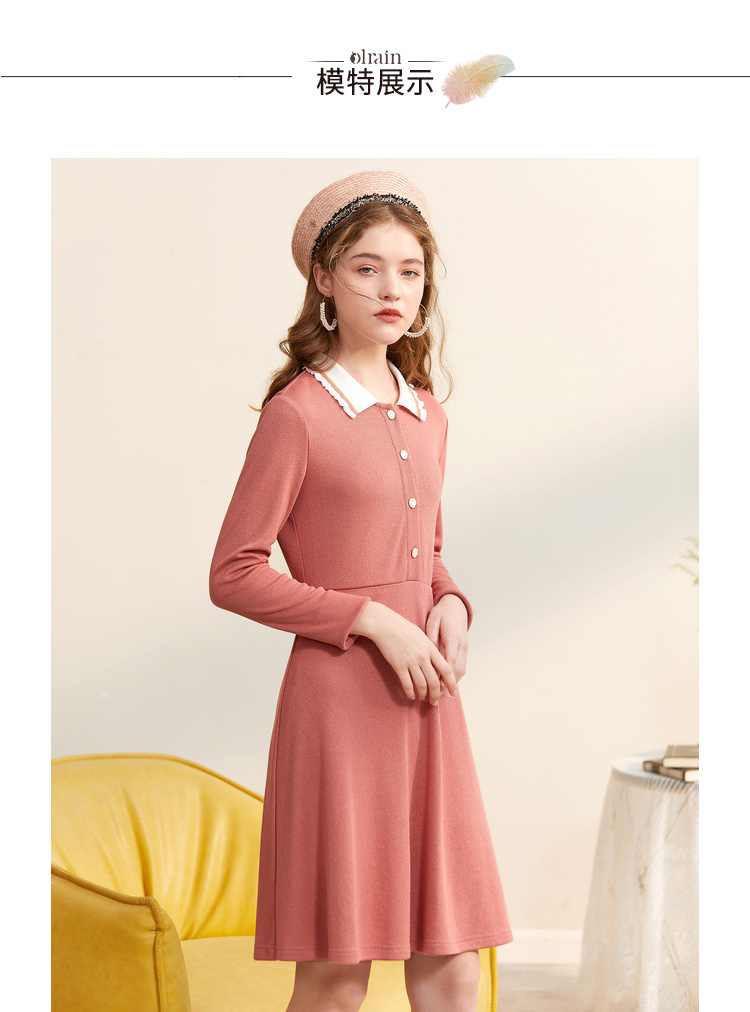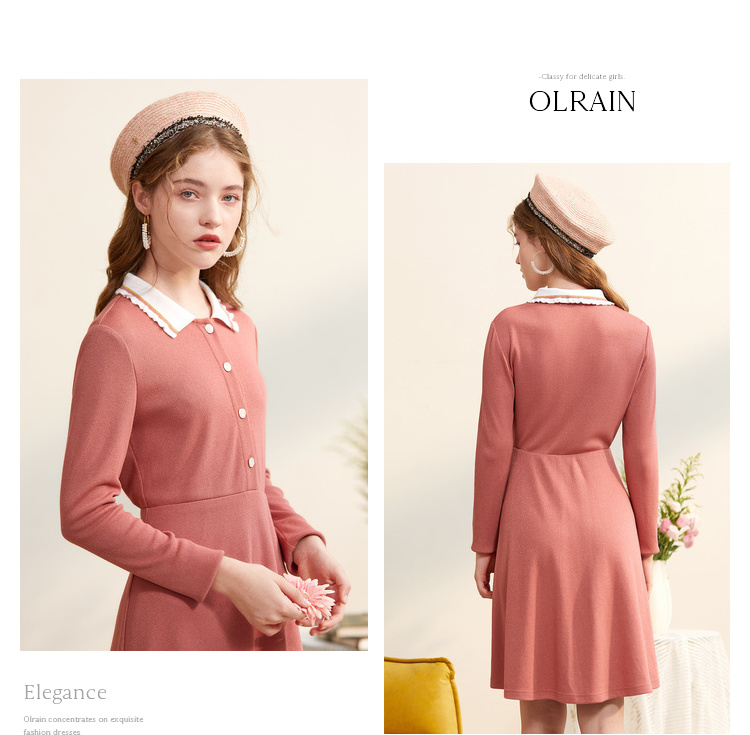 欧芮儿2019秋新品长袖polo领连衣裙女显瘦气质收腰中长款A字裙