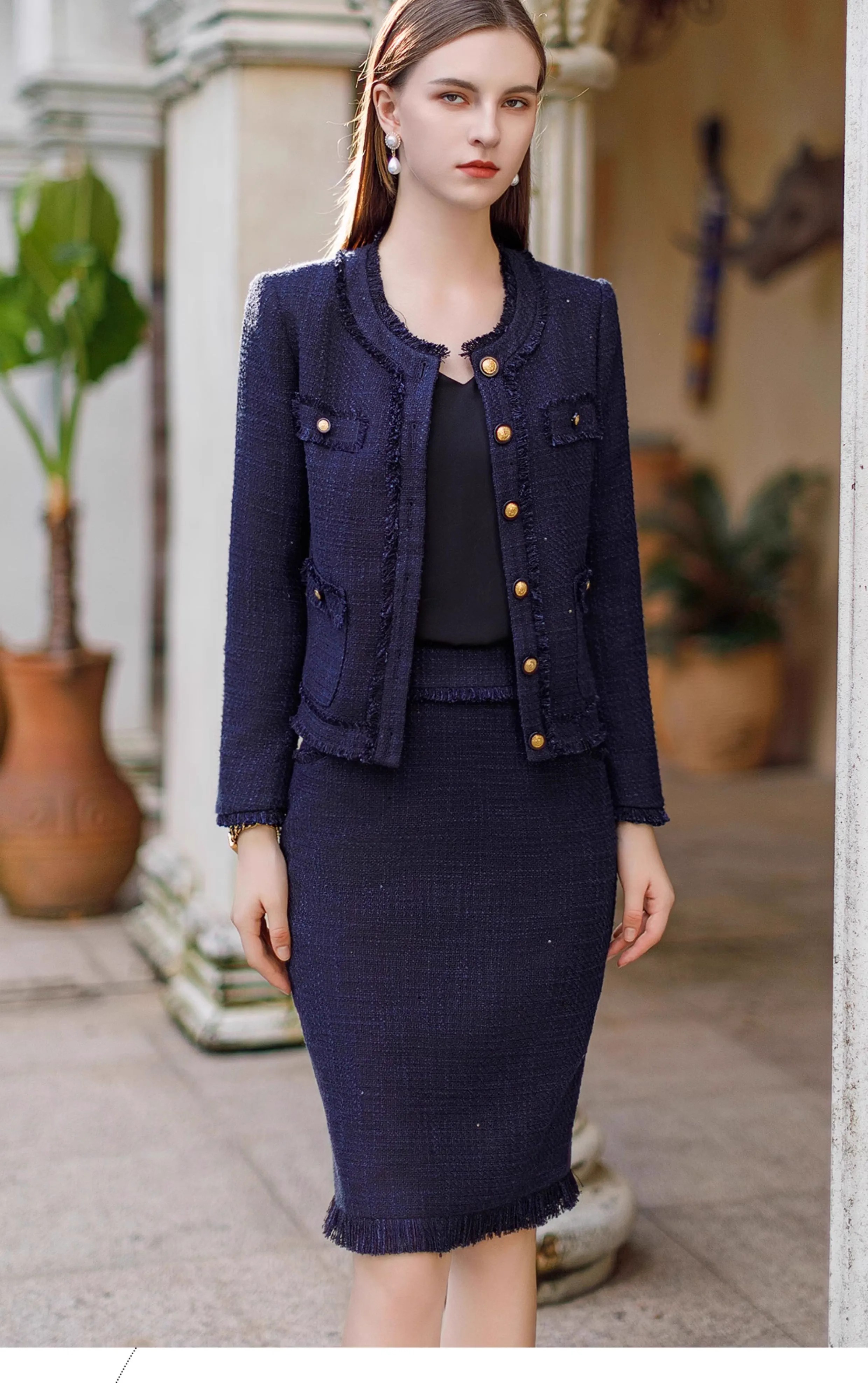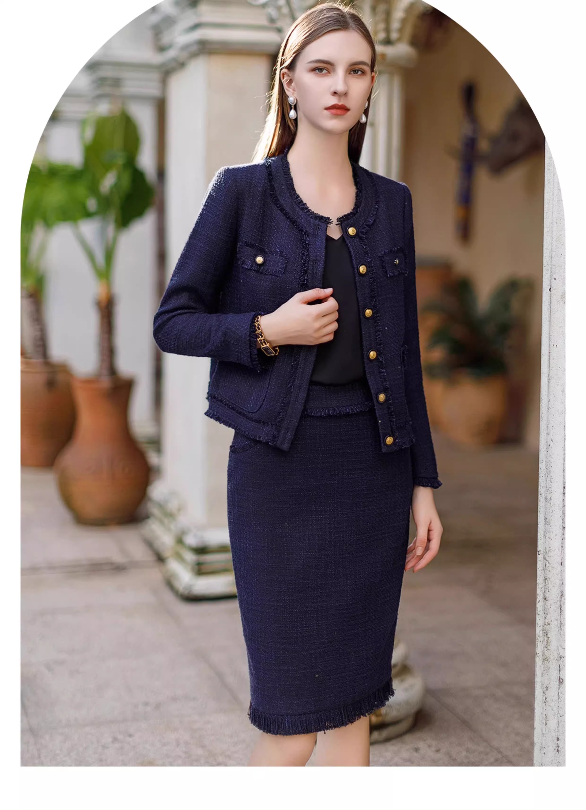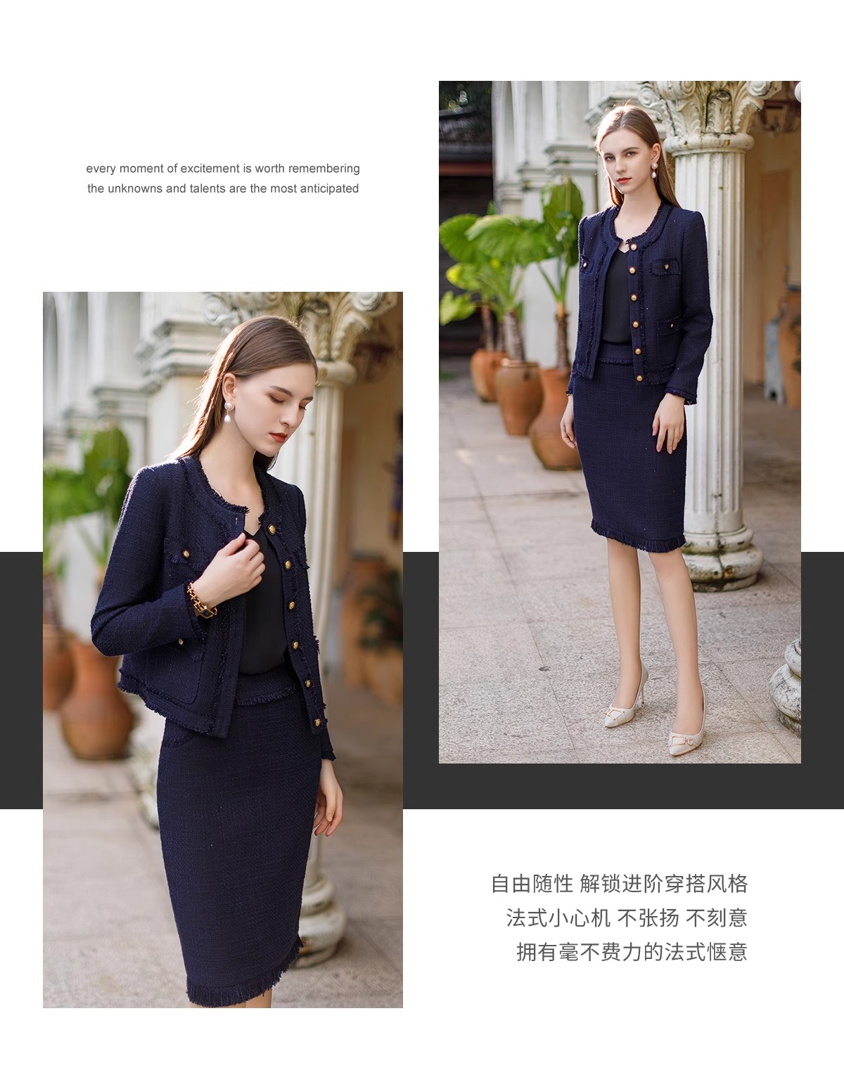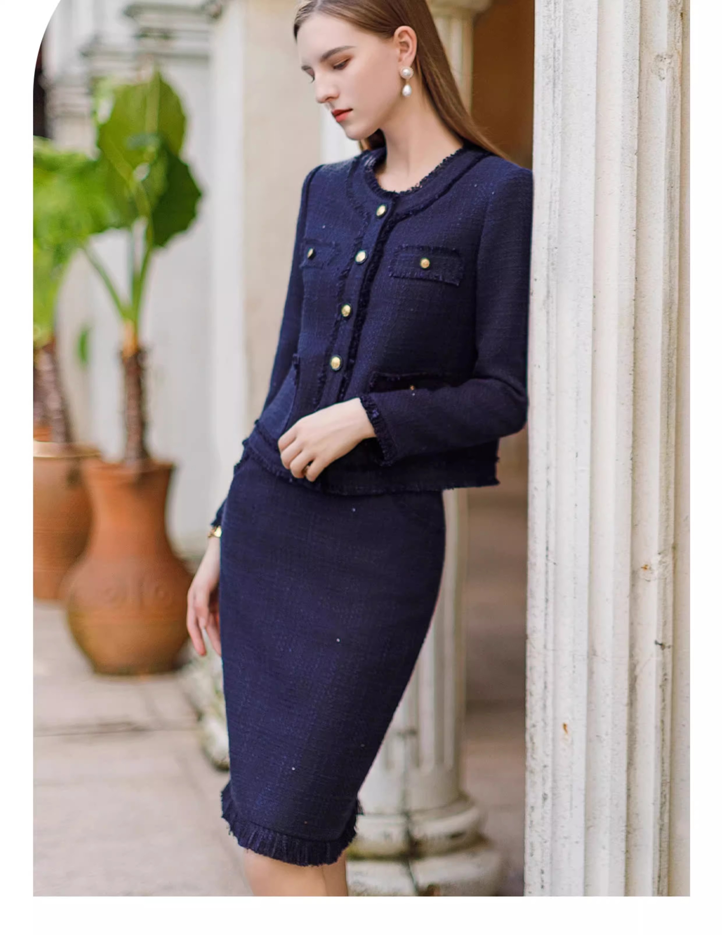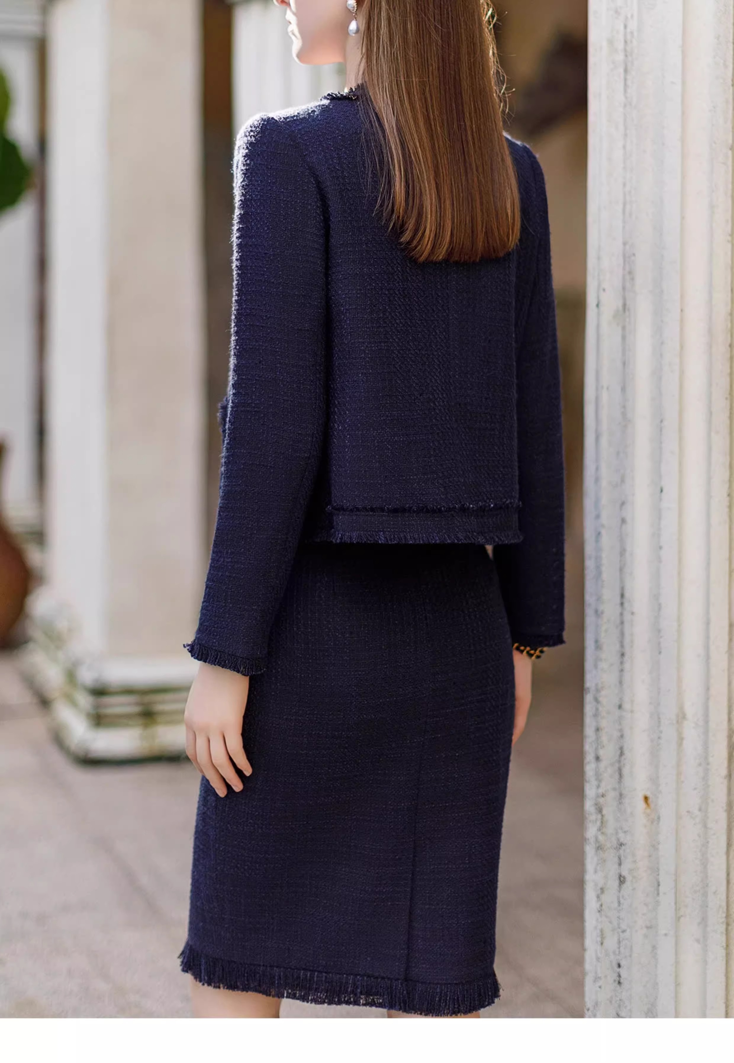 IWY/气质女神范小香风职业套装裙藏青色毛边编织开衫短外套两件套CS1911